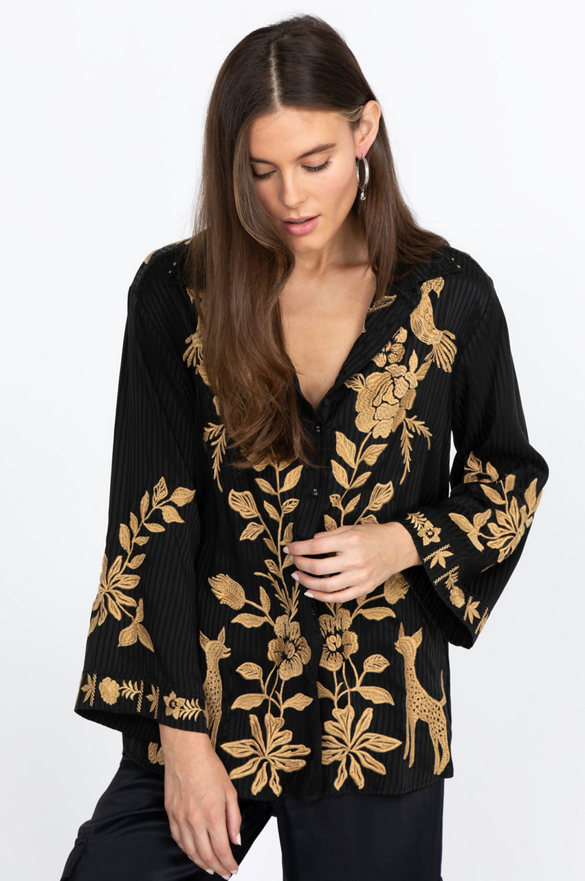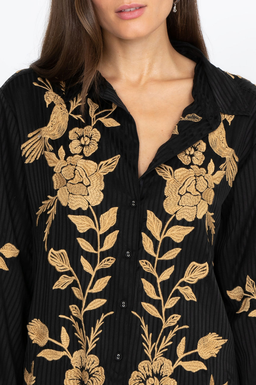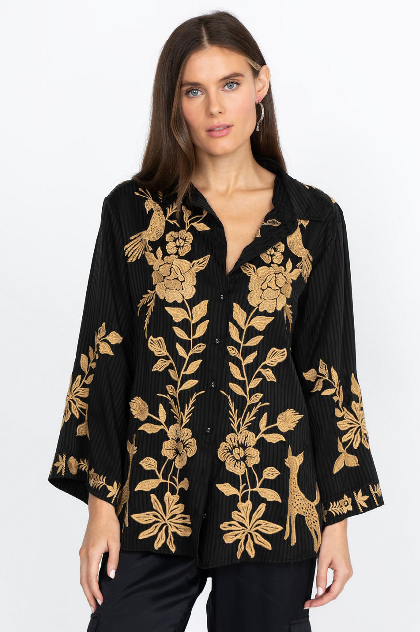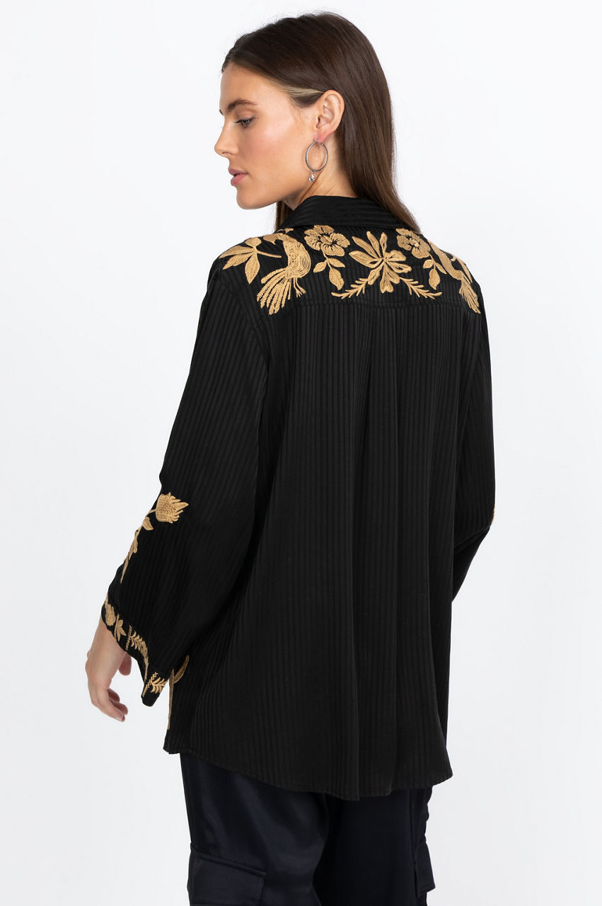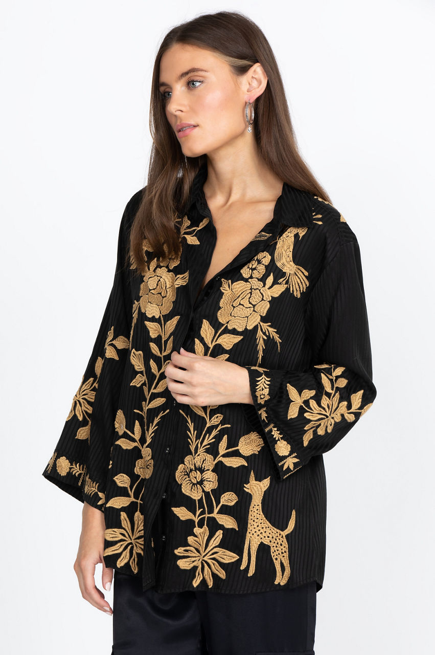 This gorgeous oversized shirt creates a stunning contrast with its gold embroidery details. The floral and animal-inspired motifs result in a unique piece that also feels versatile. Whether you need a comfortable layer for lounging or want to create a flowy silhouette, this shirt is a must-have. Layer it over a neutral cotton tee and add some dress pants for a semi-formal look.