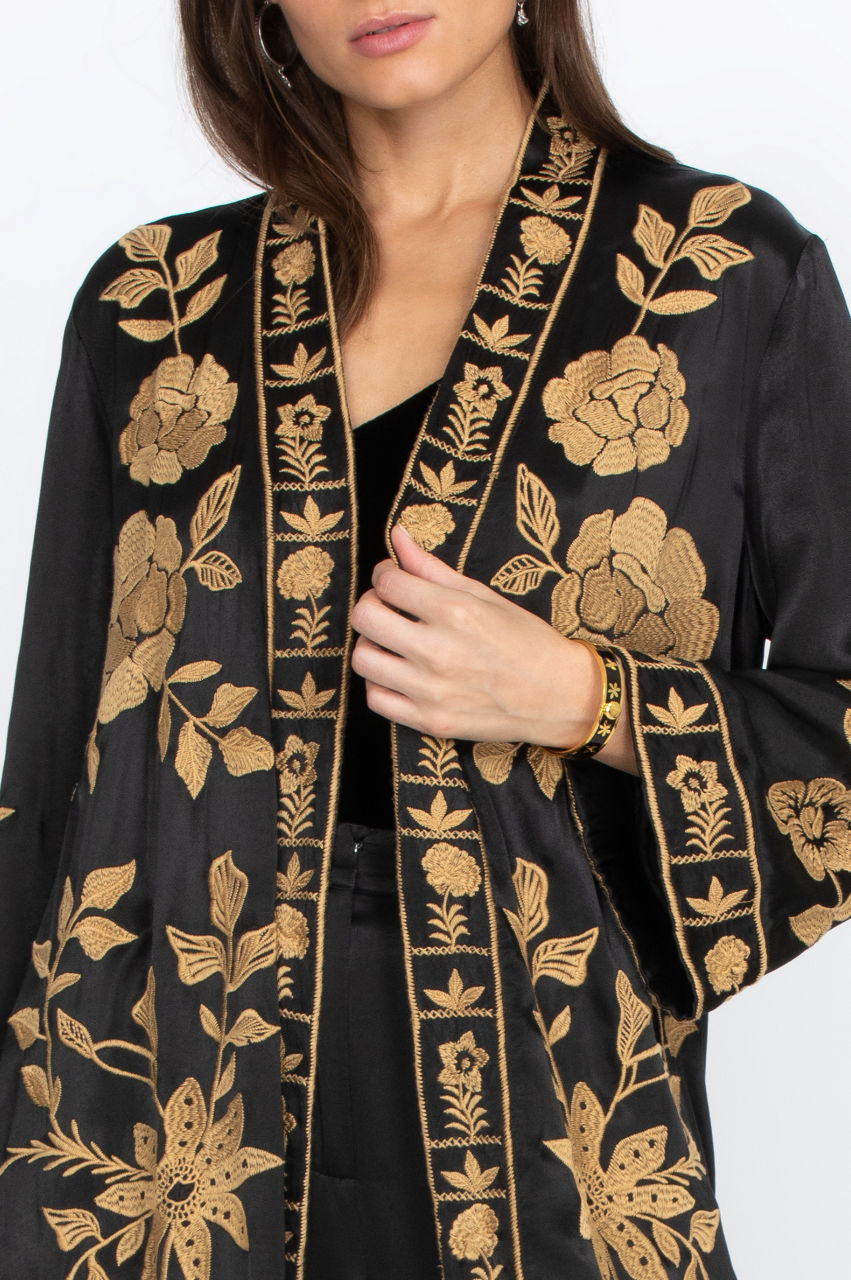 The Martina Long Kimono is a fashion staple with its loose fit and gorgeous satin material. The nature-inspired embroidery adds structure to this gorgeous piece and will create a sophisticated effect once you drape the kimono. Create a fashionable contrast by wearing this kimono over some leggings and a tank top.