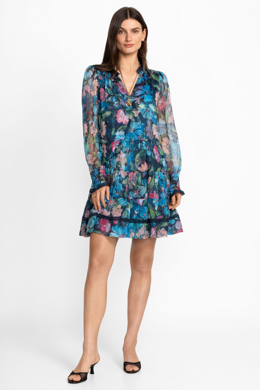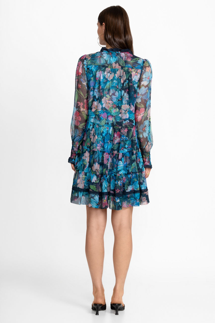 Brilliantly adorned with vibrant florals, the Maryah Tiered Mini Dress creates a classic feminine silhouette. Crafted from 100% flowing silk, this lightweight dress features an elastic waist with gathers throughout and is finished with intricate lace trim. Pair with kitten heels and delicate gold jewelry accents for a polished daytime look.