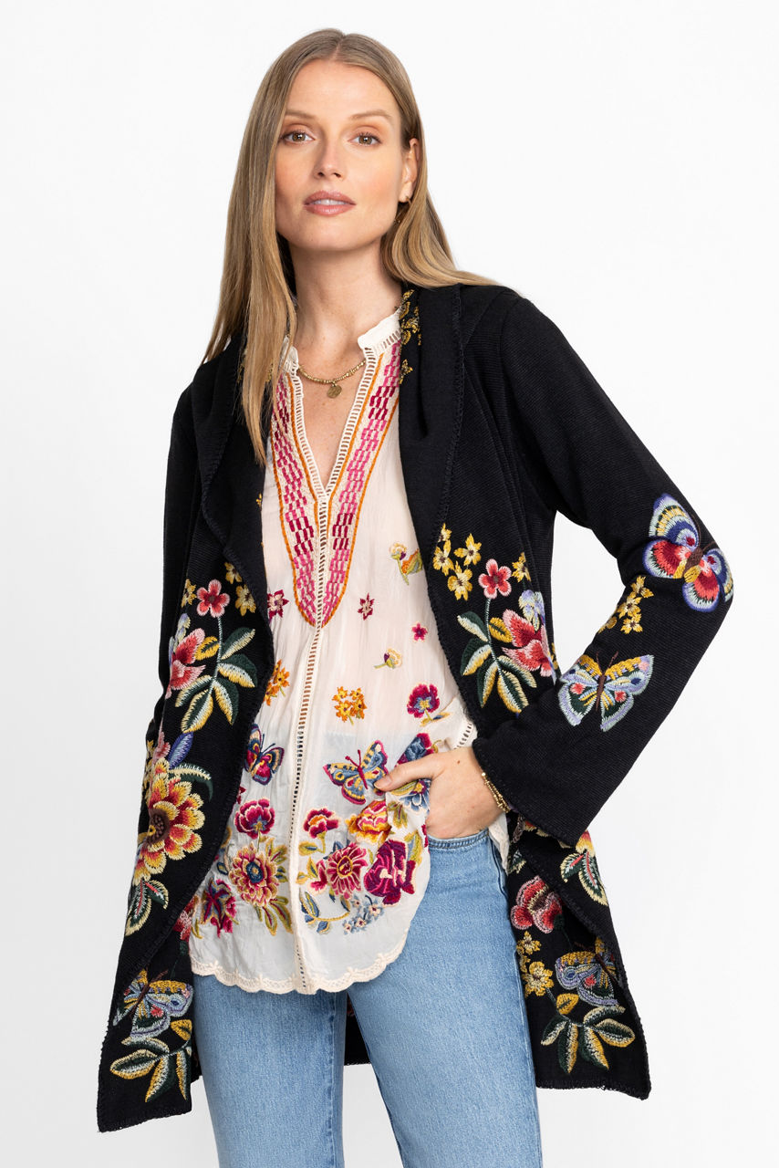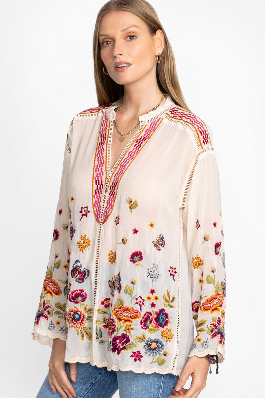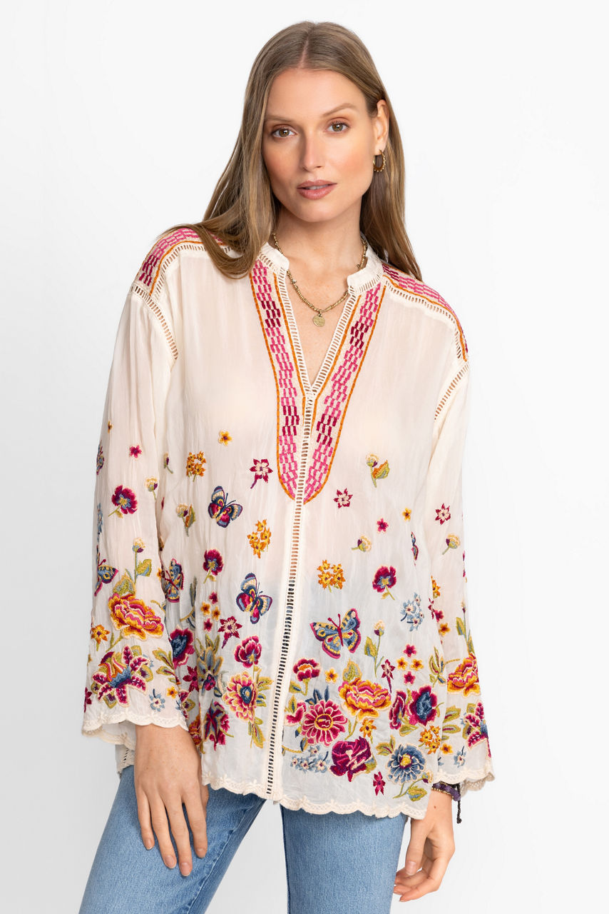 The Maude Blouse is embellished with intricate floral embroidery in a vibrant array of colors. Featuring a button-front with a standing collar and contrasting details at the neckline and shoulders, this lightweight blouse features delicate scallops at the hem and sleeves. Pair with colored trousers and trendy flats for a posh work ensemble.