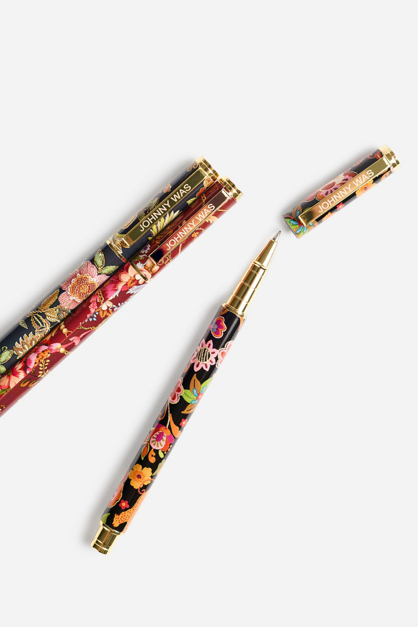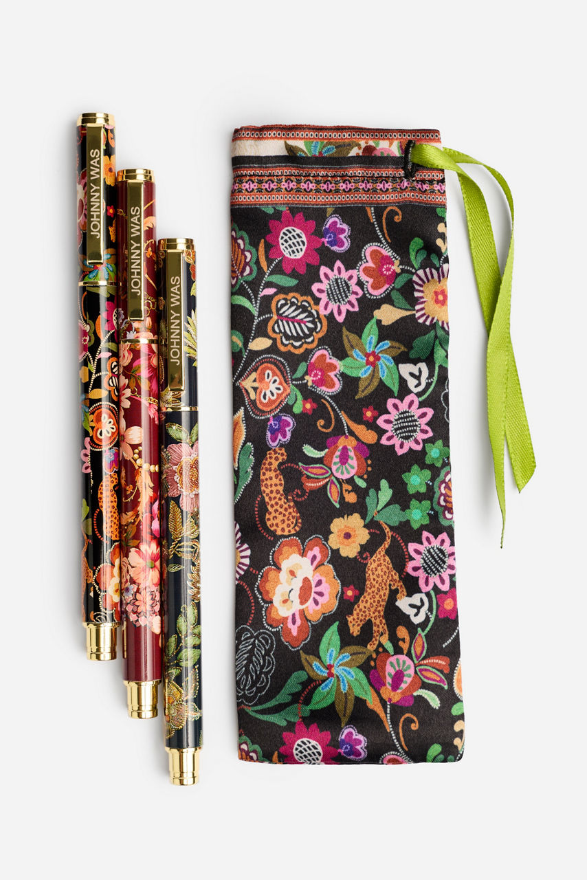 The Maxima Pen Set features three distinctive pens, each embellished with a unique floral motif in an array of color. These elegant pens are accompanied by a silk-blend pouch with a drawstring closure for a stylish storage option. Place on a desk or add to your daily tote to capture thoughts as they come to you.