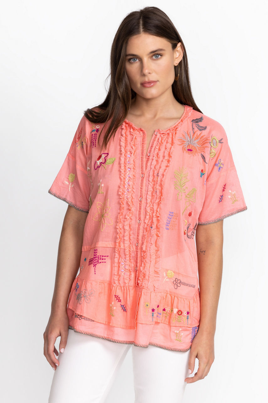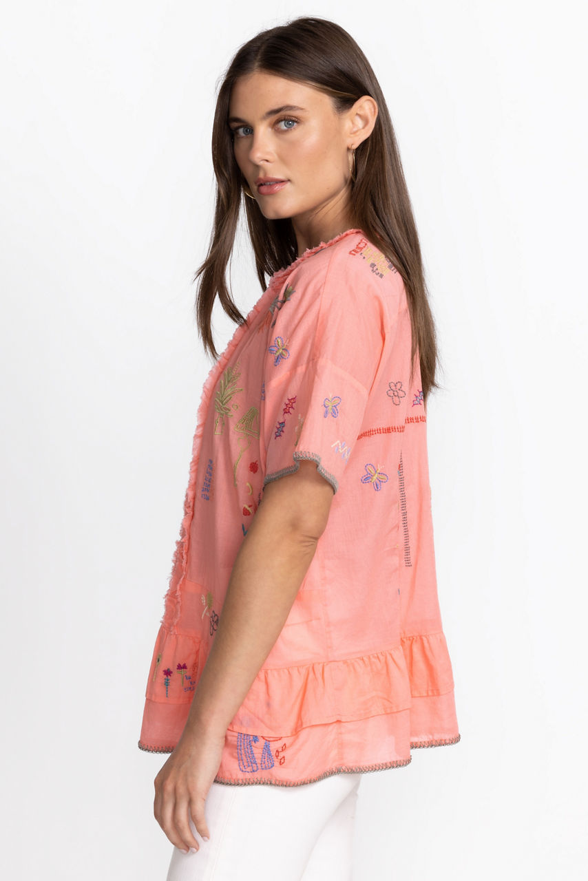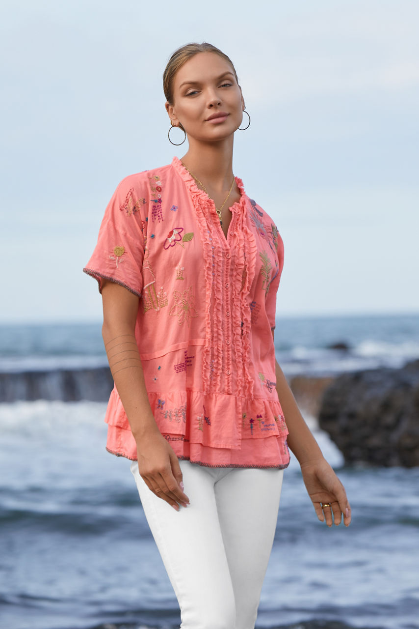 Designed from breathable cotton, the Mayeda Blouse brings a touch of causal femininity to new season looks. This blouse is characterized by a dainty floral placement embroidery and is finished with a round neck, short sleeves, and a front button closure. Pair with plain linen pants and leather extras for an effortless daytime look.