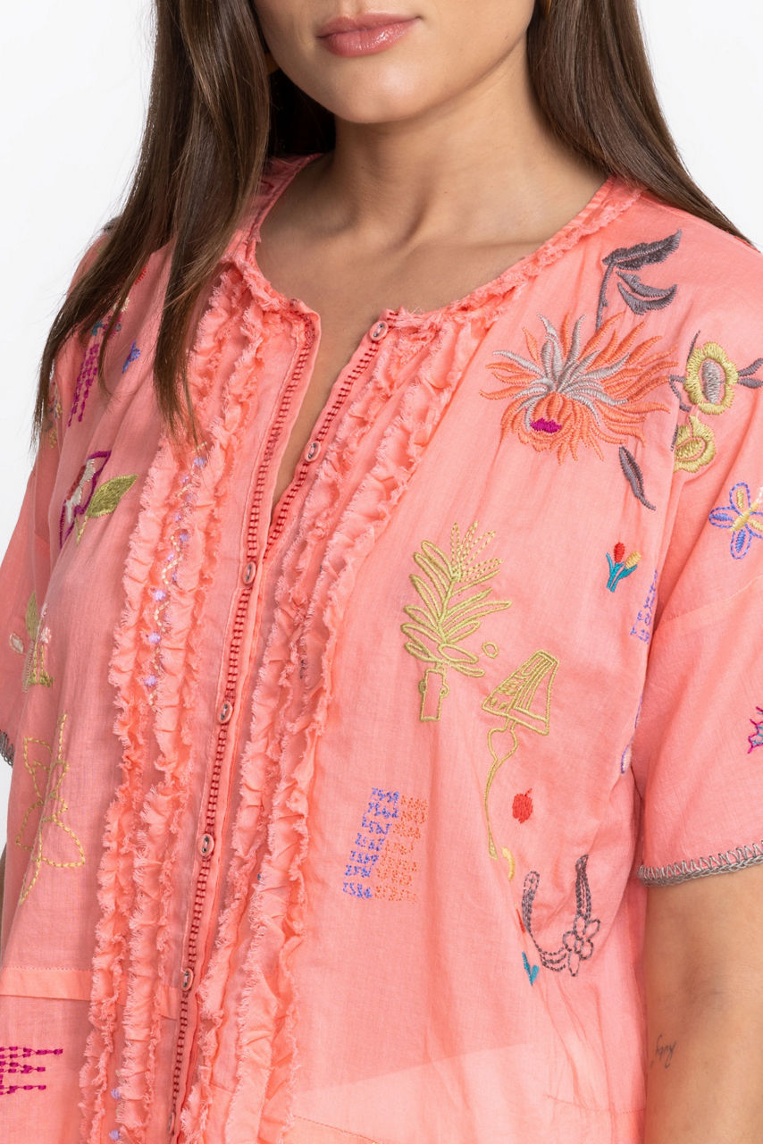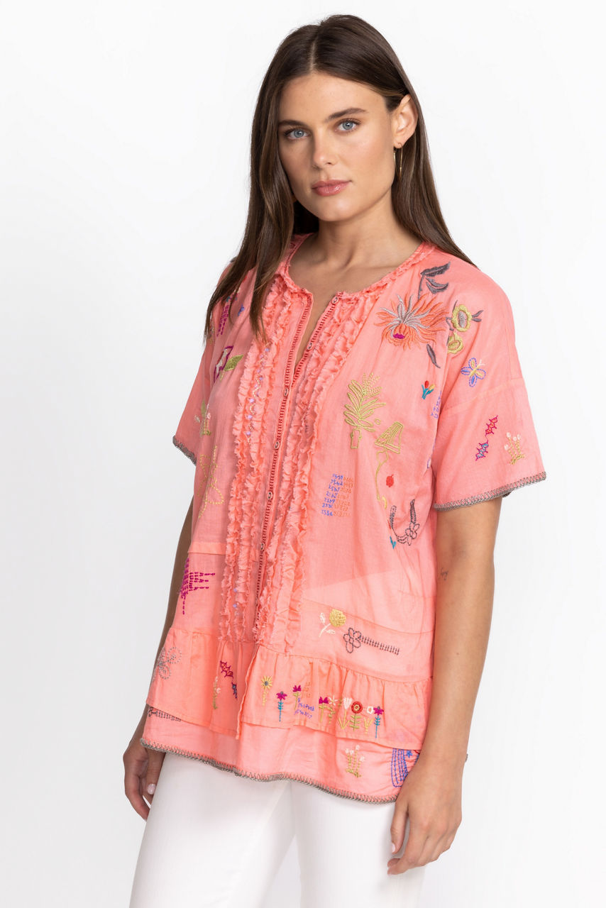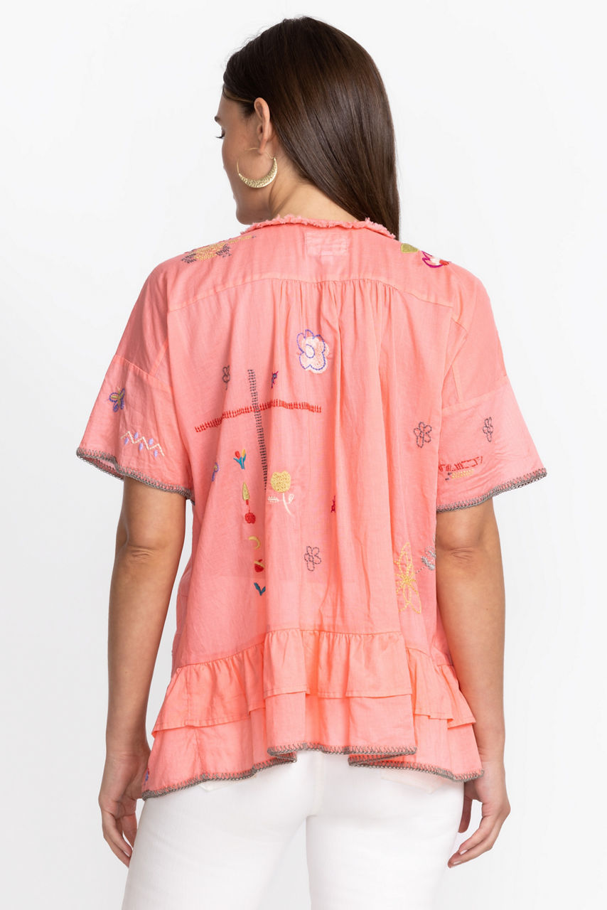 Designed from breathable cotton, the Mayeda Blouse brings a touch of causal femininity to new season looks. This blouse is characterized by a dainty floral placement embroidery and is finished with a round neck, short sleeves, and a front button closure. Pair with plain linen pants and leather extras for an effortless daytime look.