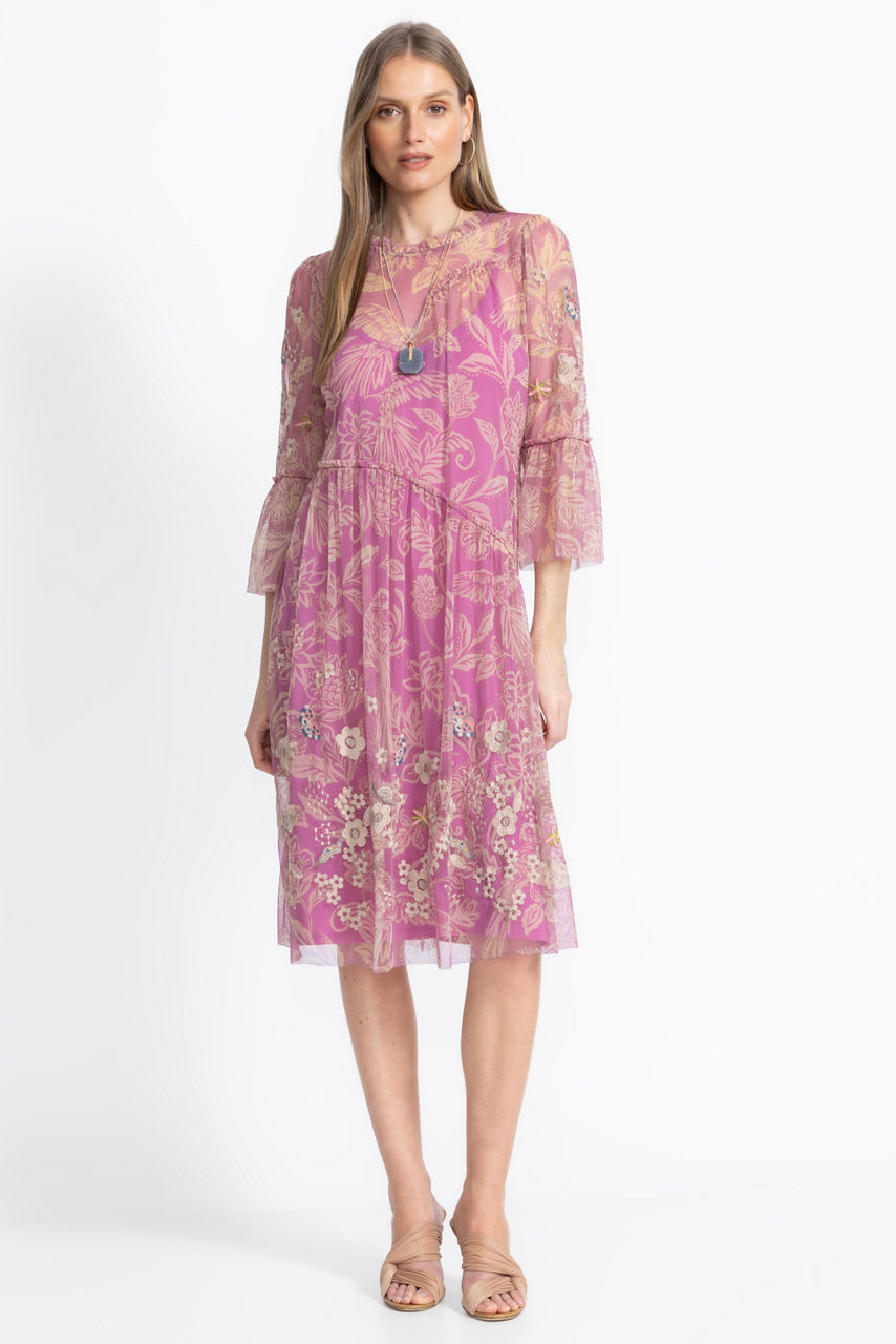 The Mazzy Arching Ruffles Dress features intricate floral embroidered detailing on a beautiful blush backdrop. Designed with a ruffled neckline and cuffs, this flowing lined maxi dress is accented with ruffled insets throughout for an eye-catching textured look. Pair with stylish flats and layered jewelry for a polished casual look.