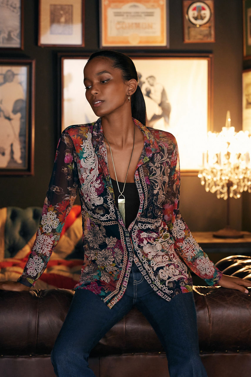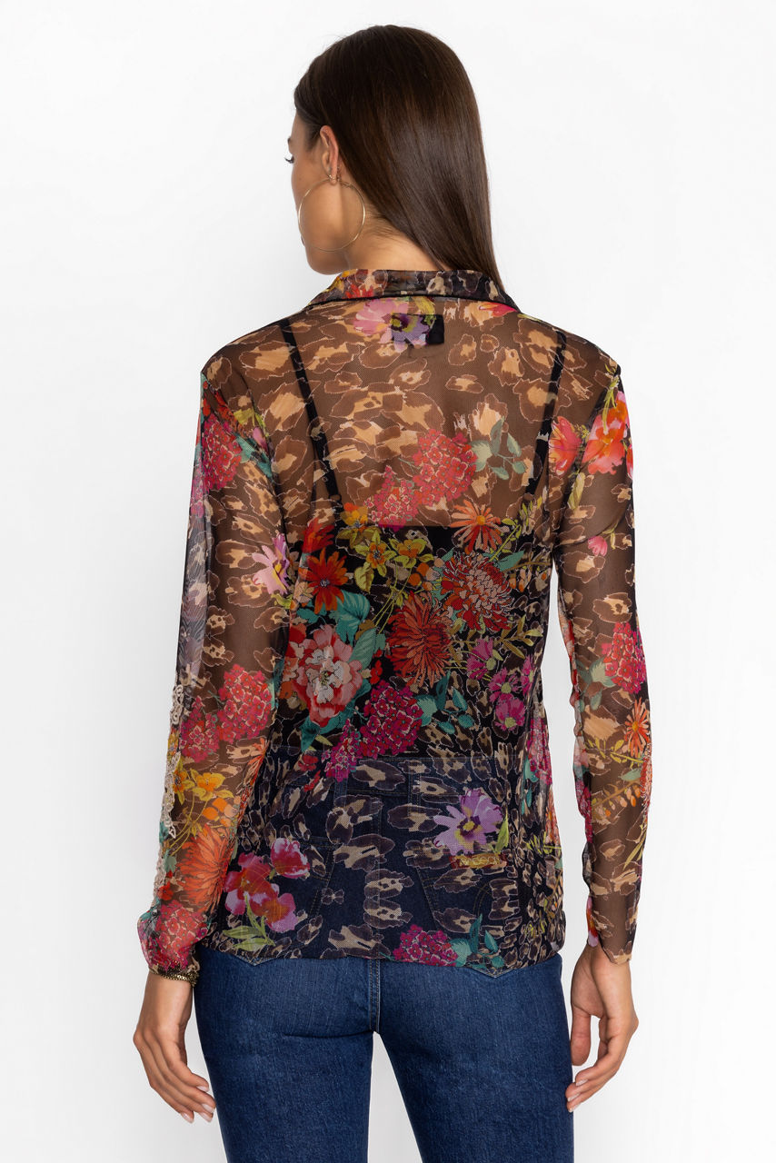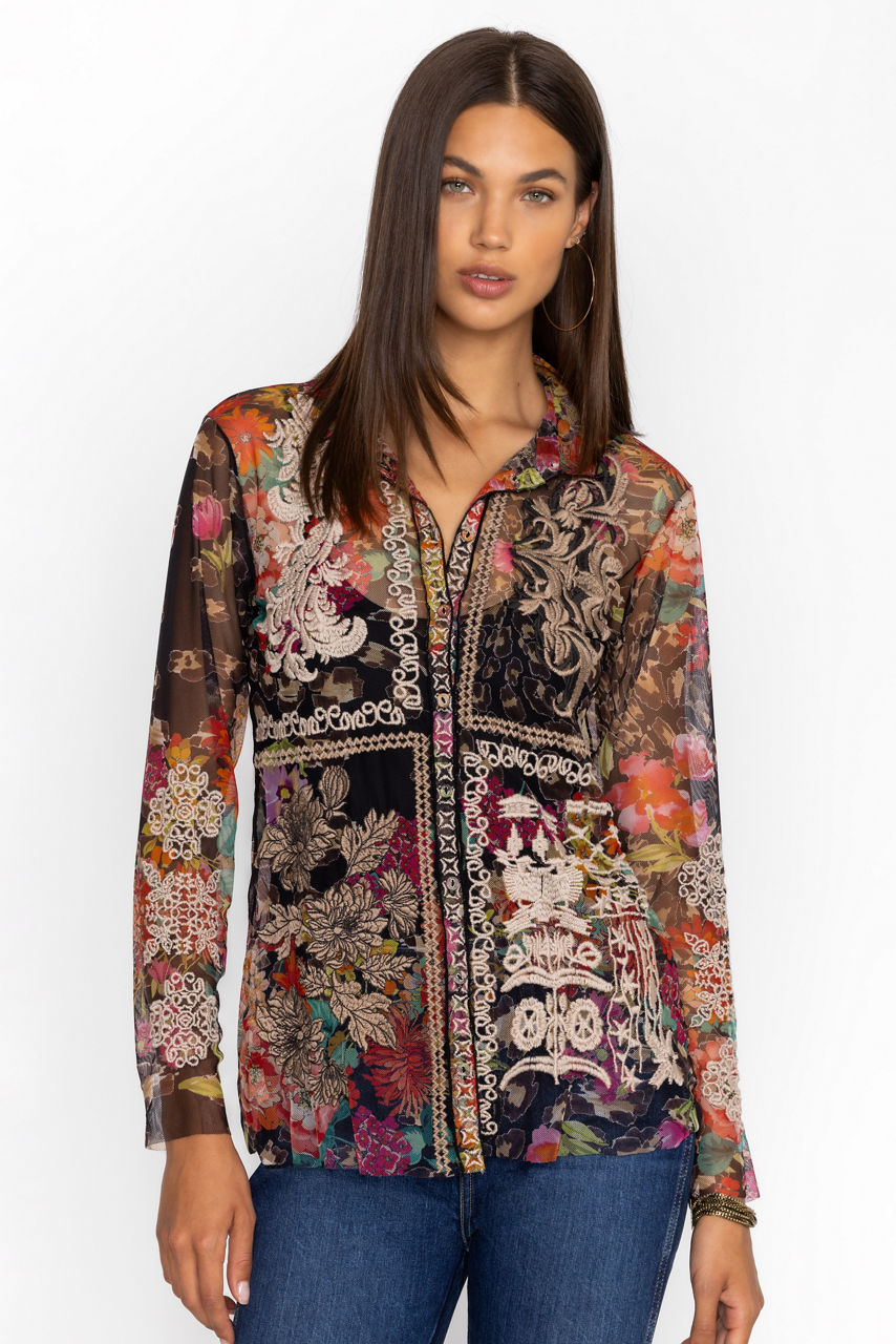 Crafted from a lightweight mesh fabric, the Mazzy Button Down Fitted Blouse is adorned with a fresh, feminine floral pattern. Featuring a classic collared button-front and long sleeves, this slip-lined blouse is finished with intricately detailed placement embroidery. Pair with wide-leg pants and neutral pumps for a fresh workday look.