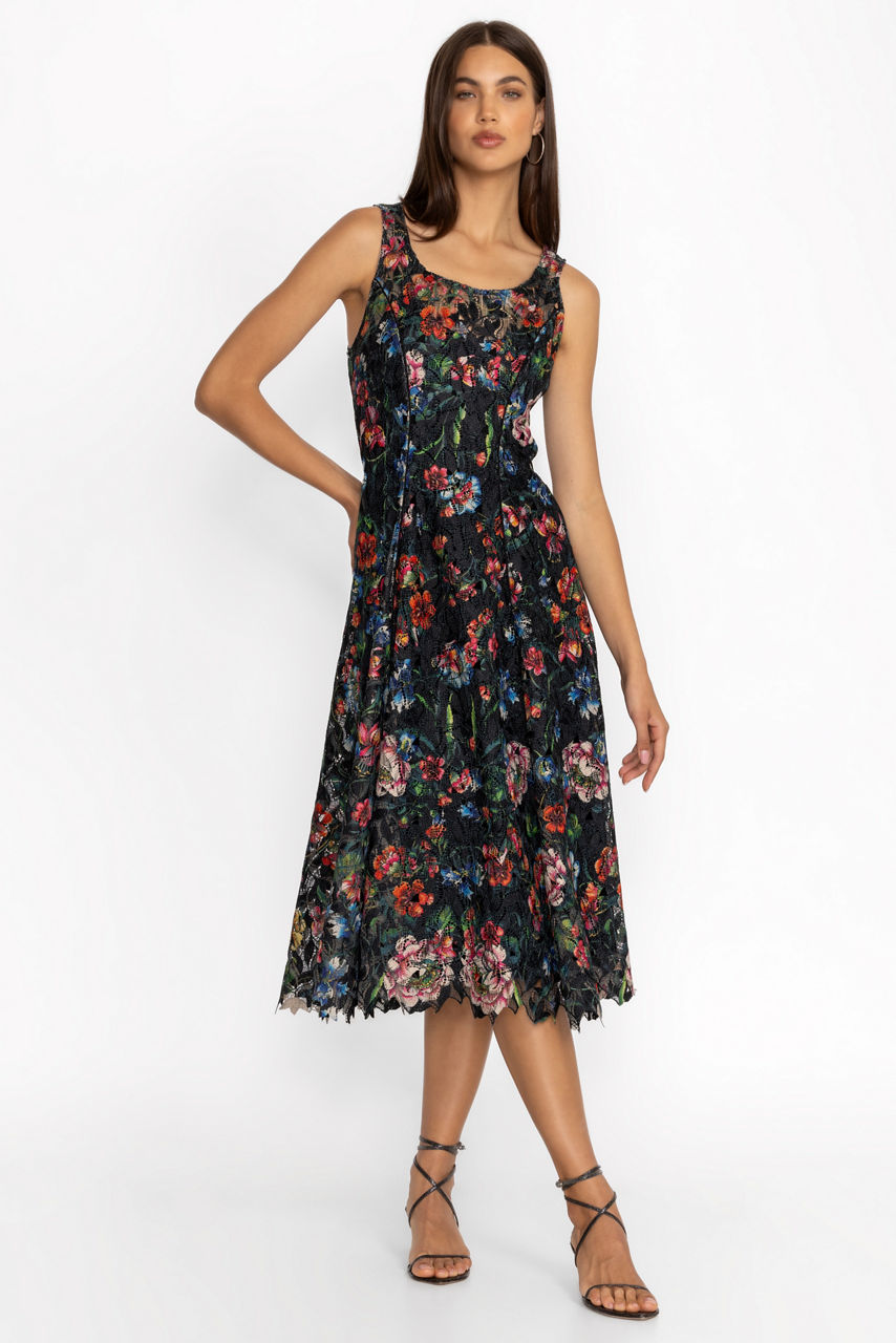 Embellished with rich floral designs on an inky black backdrop, the Mazzy Princess Dress is crafted from a lightweight, breezy fabric. Featuring a boat neck and intricate princess seams, this sleeveless dress is slip-lined for additional coverage. Pair with bold flats and a denim jacket for a polished casual look.