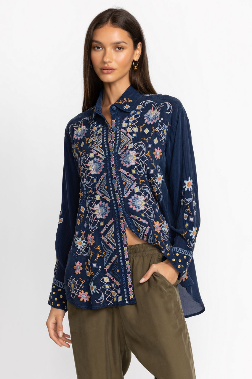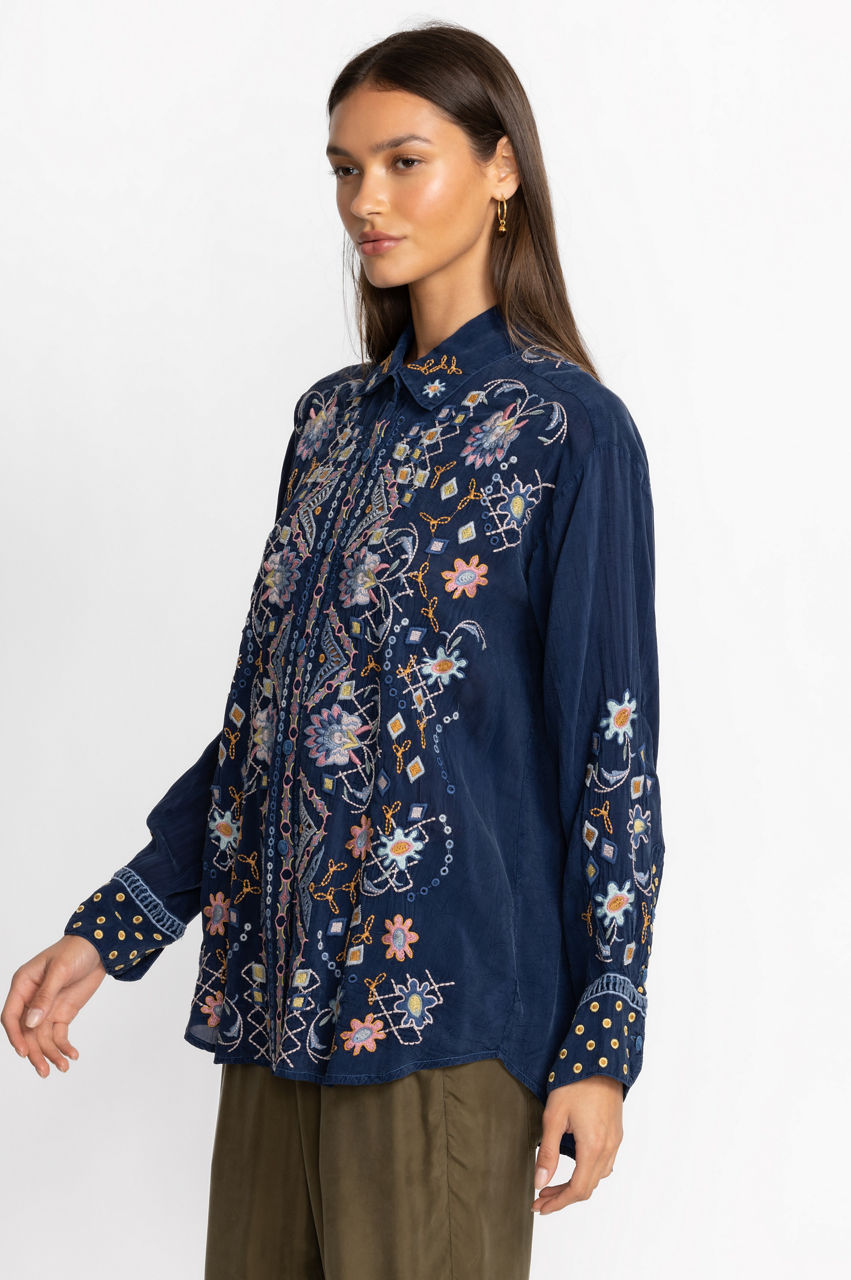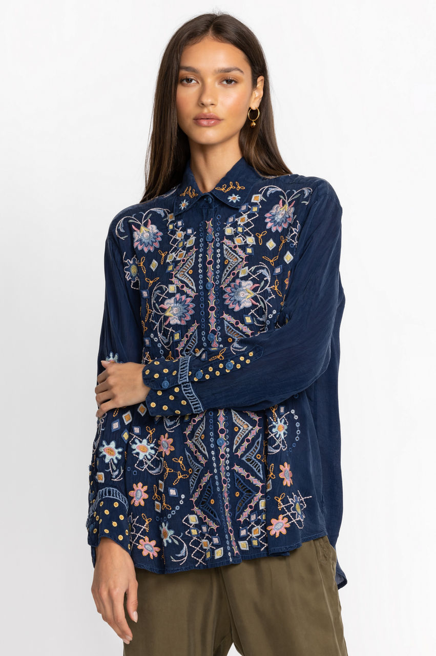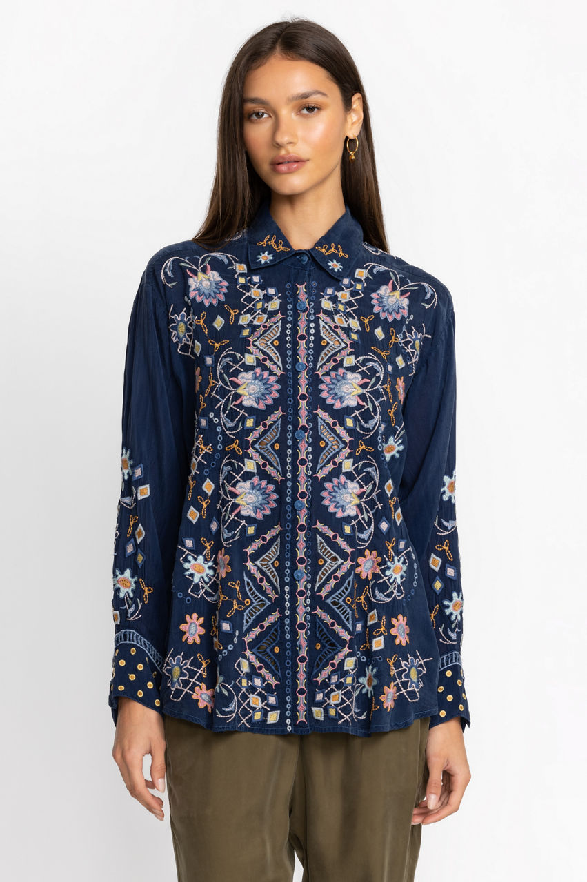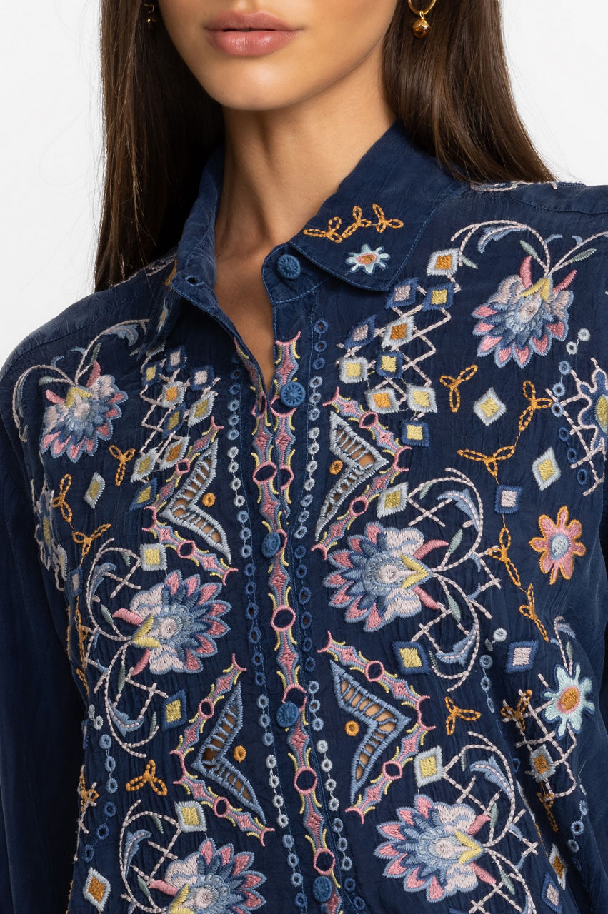 Providing a modern twist on a traditional button-down top, the Mackenzie Blouse serves up a colorful display. Delicately adorned with intricate placement embroidery and stunning detail, this machine washable blouse is a perfect option for daily wear. Pair with comfortable leggings or posh trousers and smart flats for a variety of wardrobe options.