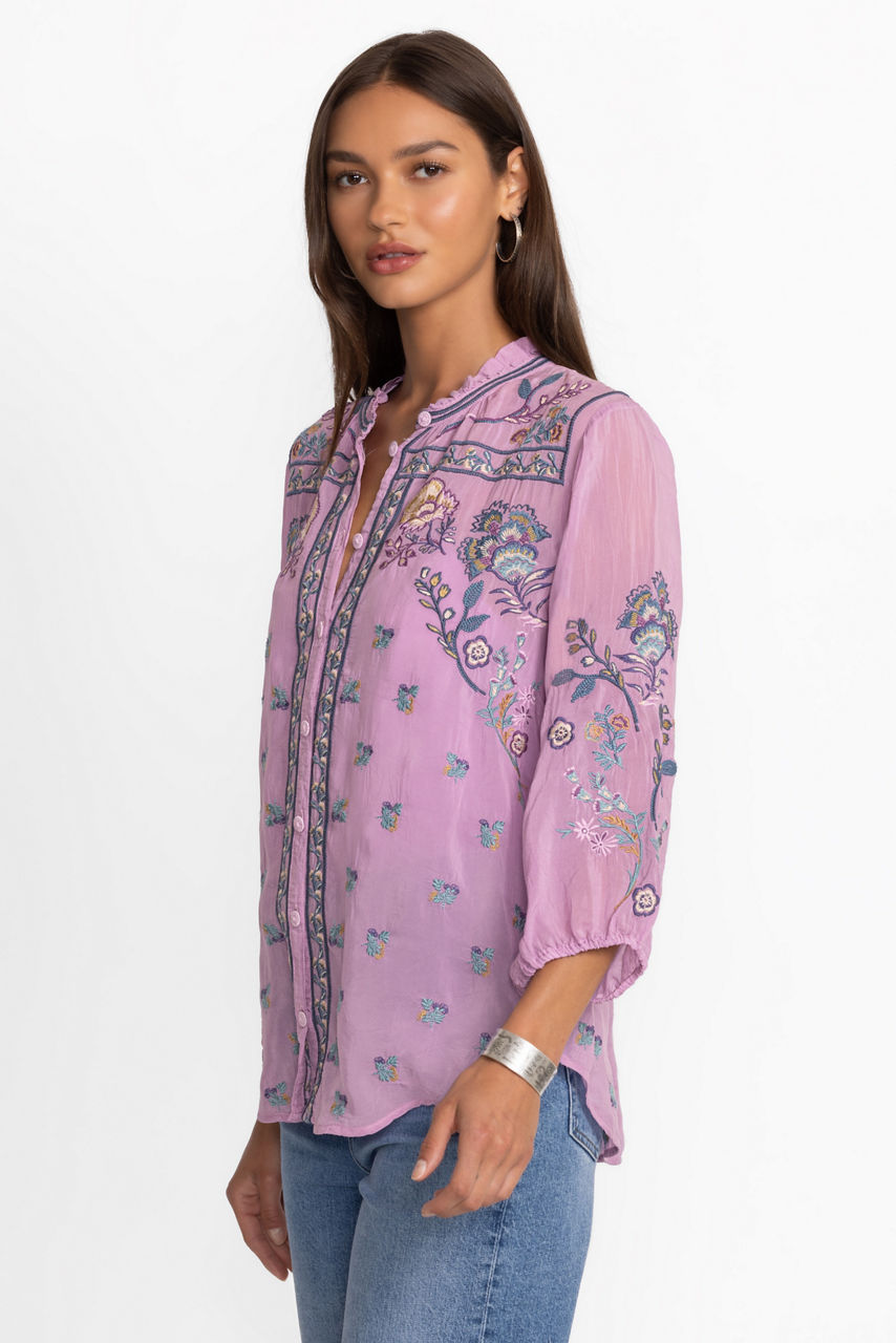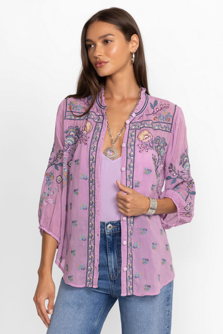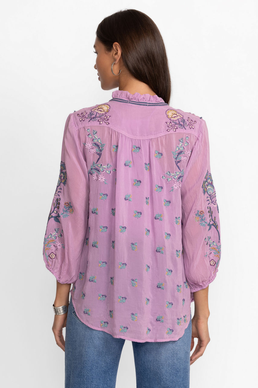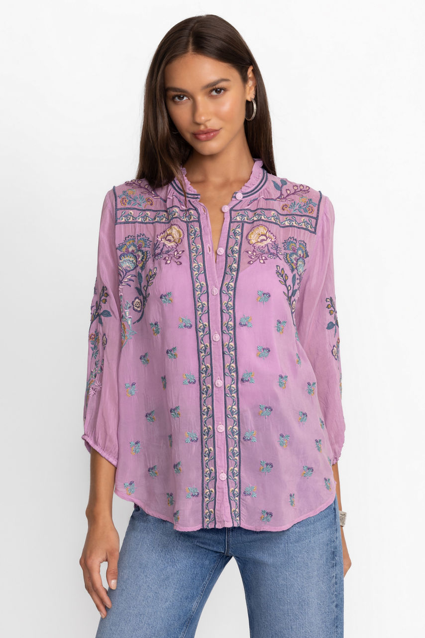 Embellished with intricate placement embroidery, the Medina Blouse is equal parts feminine and timeless. Featuring a split neckline with a standing collar adorned with decorative ruffles, this button-front blouse is finished with gently puffed sleeves and gathered detailing throughout. Pair with relaxed-fit jeans and sandals for a comfortable weekend look.