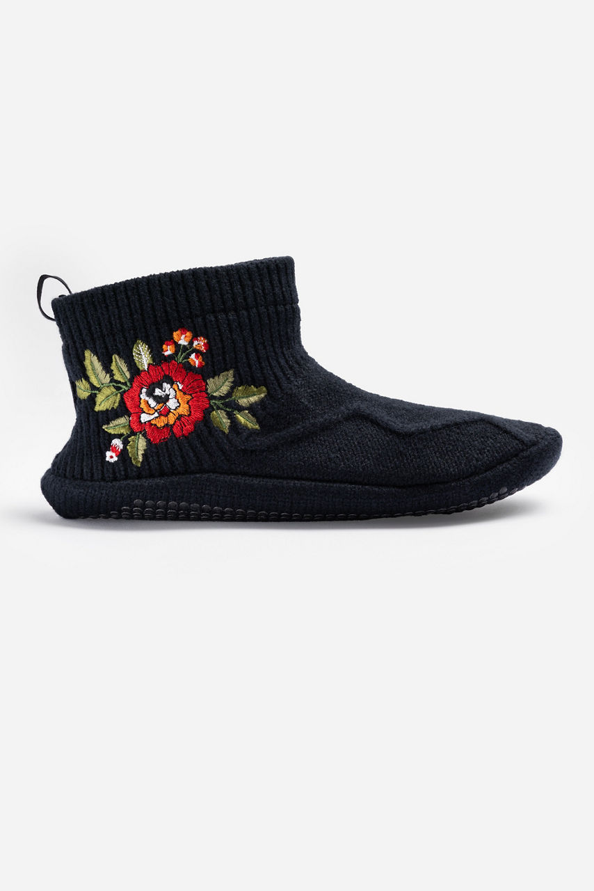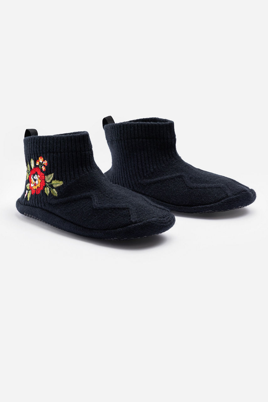 The Medhi Embroidered Grip Slippers are designed for both comfort and style. Crafted from a rich cotton blend, these pull-on grip slippers help with stability and coziness and are embellished with a vibrant floral embroidered motif at the ankle. Pair with cozy pajamas and a fluffy robe for a relaxing night in.