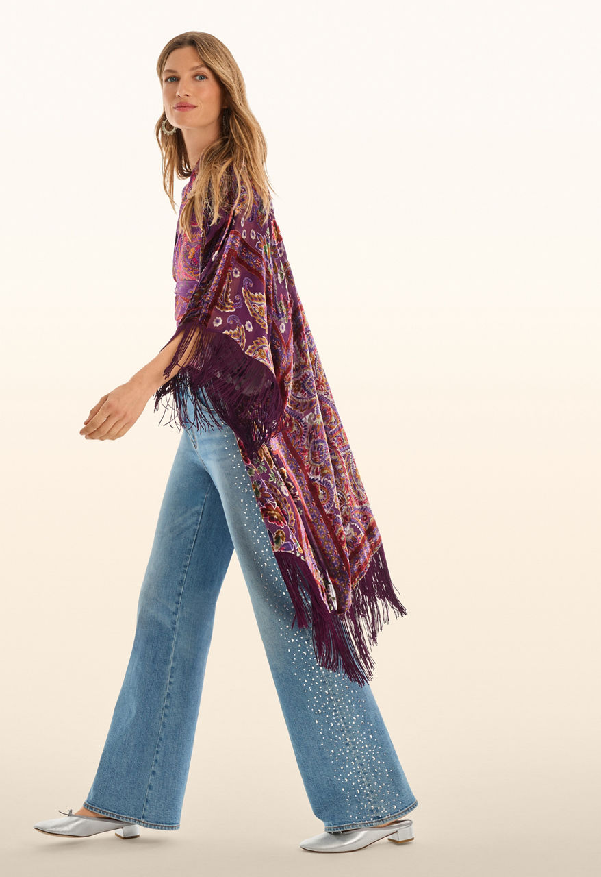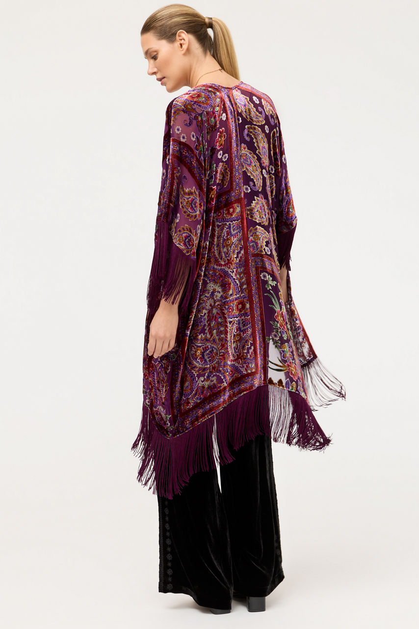 Beautifully embellished with paisley and floral images in hues of purple, the Mer Fringe Kimono offers a patchwork of color. Crafted from a rich silk blend, this unique kimono features an open front and mesmerizing fringe accents at the sleeves and hemline. Layer over a black turtleneck top and skinny jeans for a polished casual ensemble.