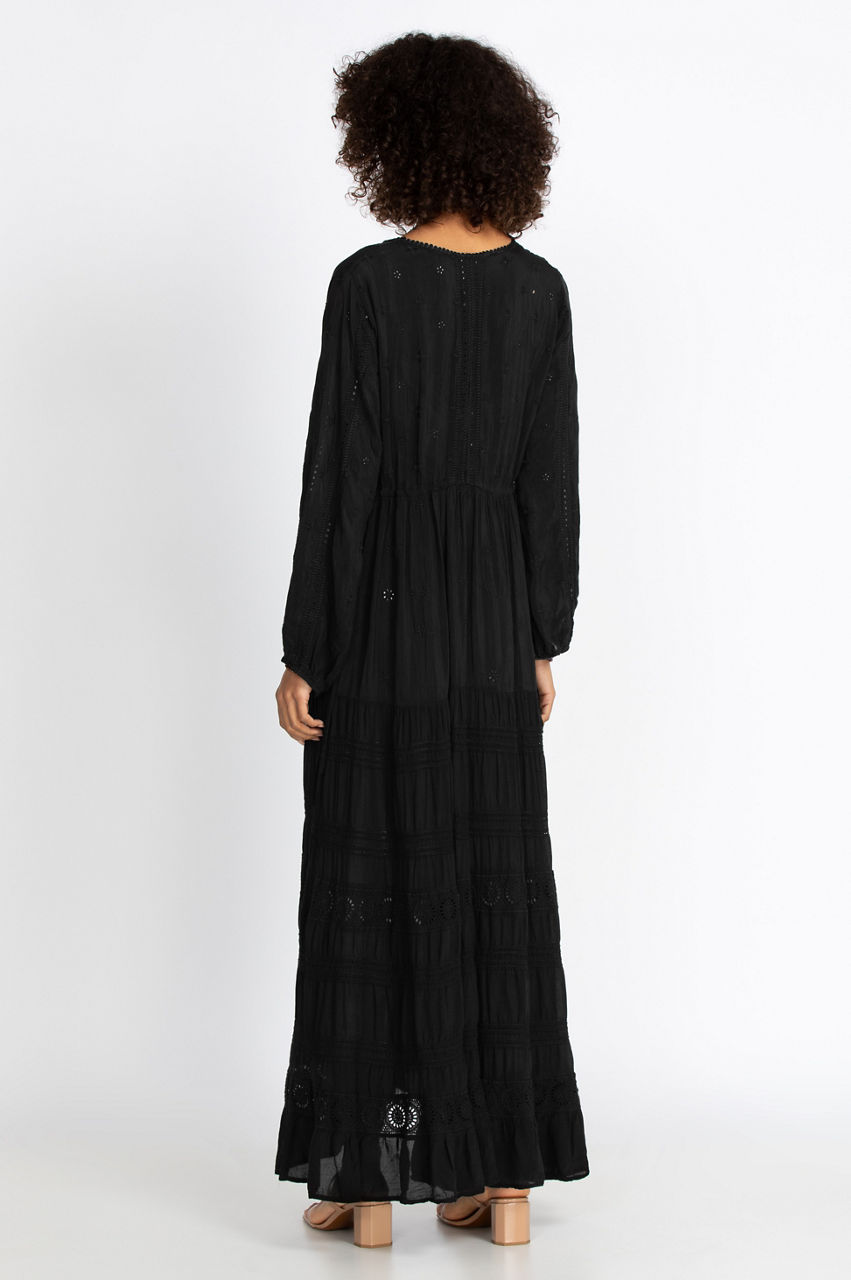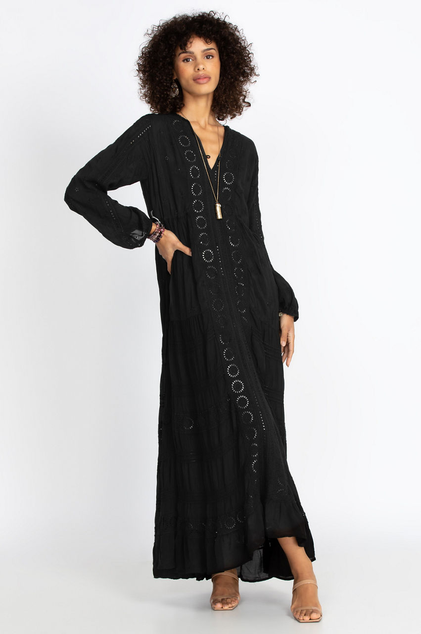 The Mercury Dress is a timeless piece that combines the flowy cut of a maxi dress with an elegant boho-inspired print. The delicate embroidery detail on the collar and the adjustable drawstring elevates this dress to a springtime staple for your wardrobe. This dress only needs a few accessories to complete your look, including wedge sandals, a fringed handbag, and a layered necklace.