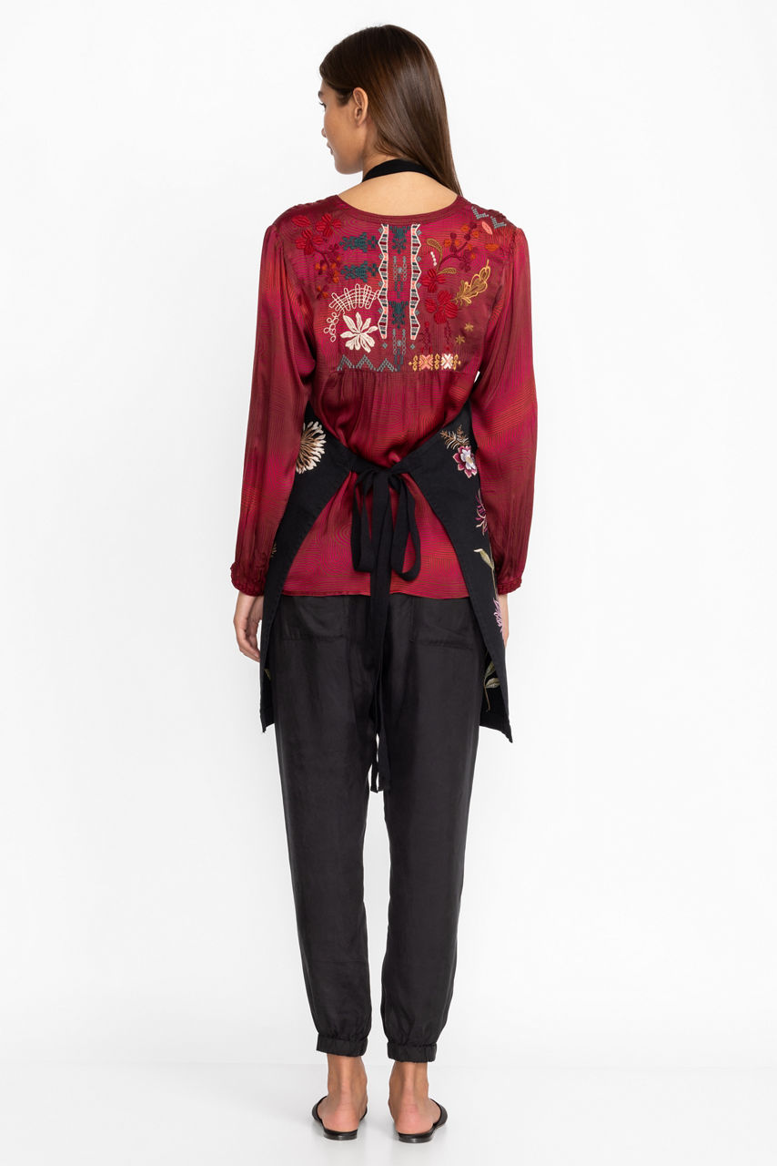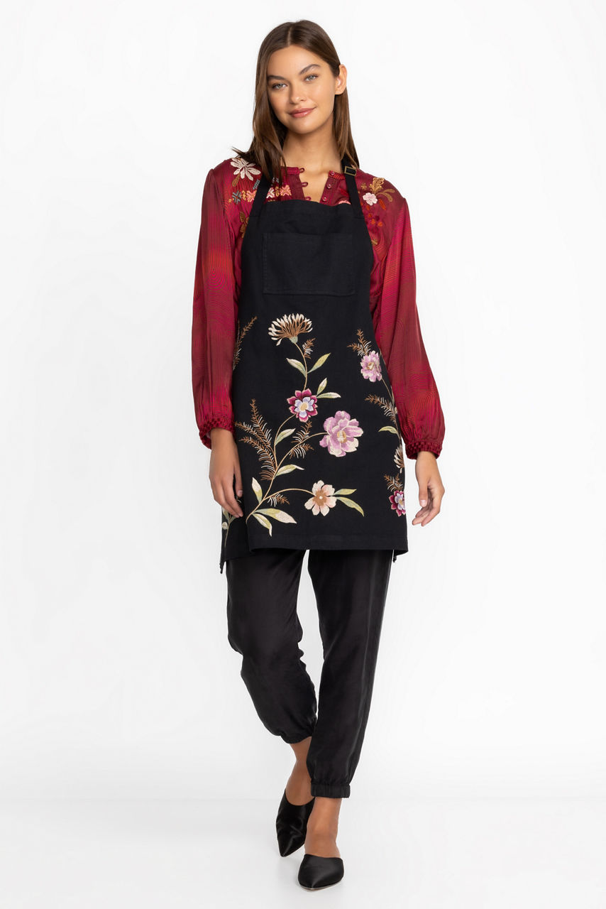 Crafted from 100% Cotton the Meriah Apron offers a touch of whimsy to your meal preparation time. Featuring carefully placed embroidered flowers and an easy tie and the neck and waist, this lovely apron offers 3 large pockets and is machine washable for easy care. Layer over your attire to protect from spills and stains.