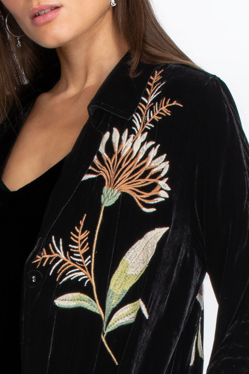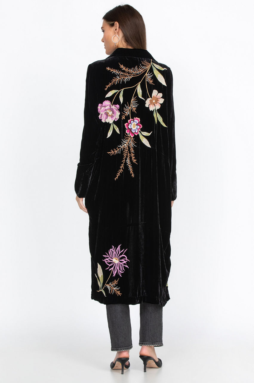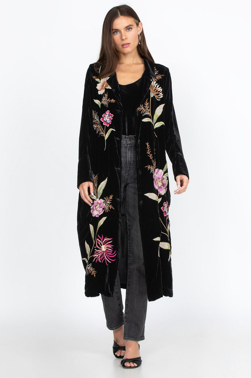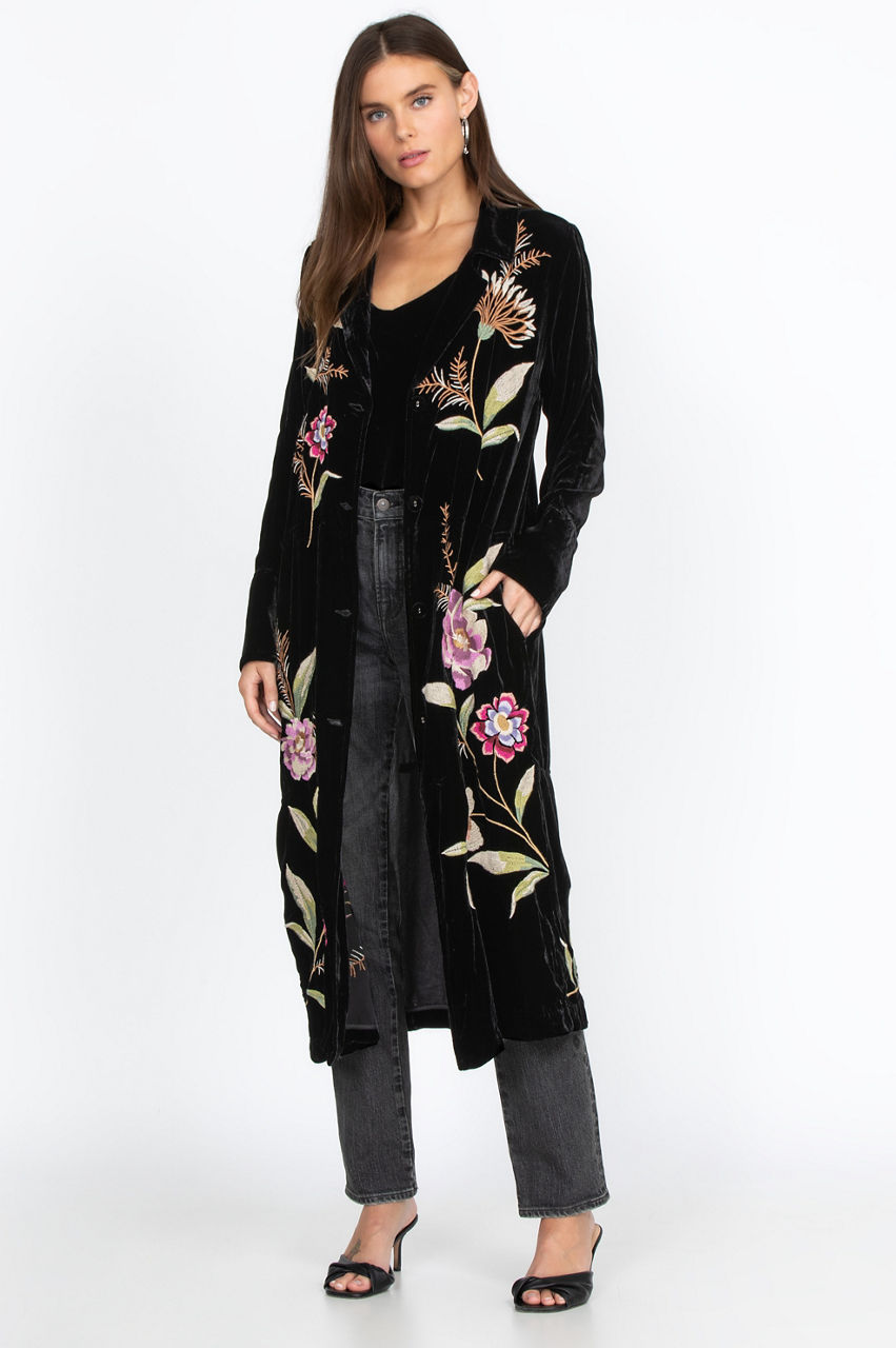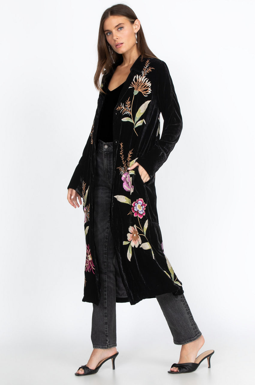 The Meriah Velvet Duster Coat is a stylish way to keep warm during chillier days. Decorated with a floral pattern with embroidery, you ll need nothing else to dress up a simple outfit. You can wear this versatile duster coat with jeans, leggings, or a dress for any occasion. This stylish, chic coat makes for an excellent statement piece.