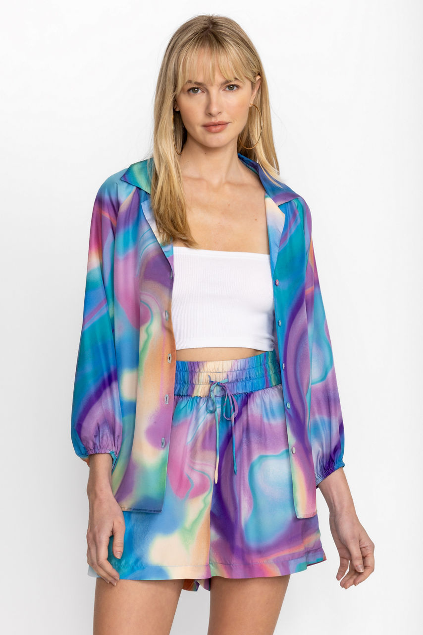 Crafted from 100% sumptuous silk, the Merida Marble Drawstring Shorts offer a fresh and fun warm weather alternative. Featuring an elastic waistband with drawcord and pockets at the sides, these casual shorts are adorned with a bold, colorful swirl pattern. Style with the Merida Marble Button Down and easy slides for an adventurous casual look.