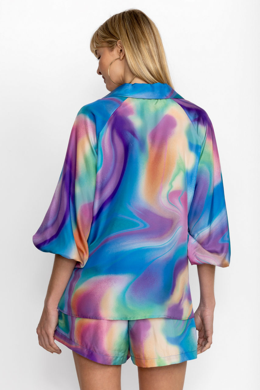Offering a playful addition to your wardrobe, the Merida Marble Smocked Raglan Shirt is accentuated by vibrant swirling color. Crafted from 100% silk, this unique blouse features an open lapel collar and easy raglan sleeves finished with elastic at the wrists. Pair with a bold skirt and comfortable flats for a polished look that can go easily from work to dinner out.