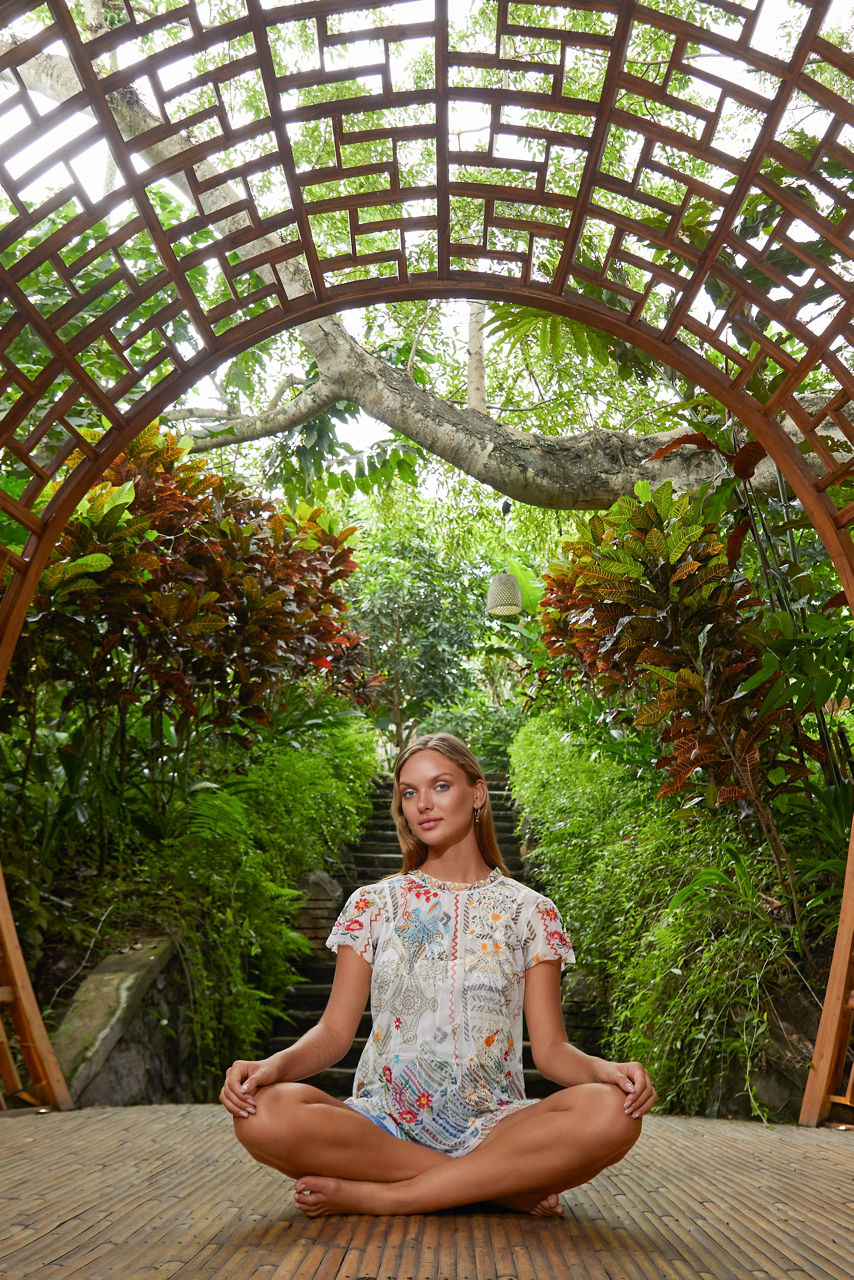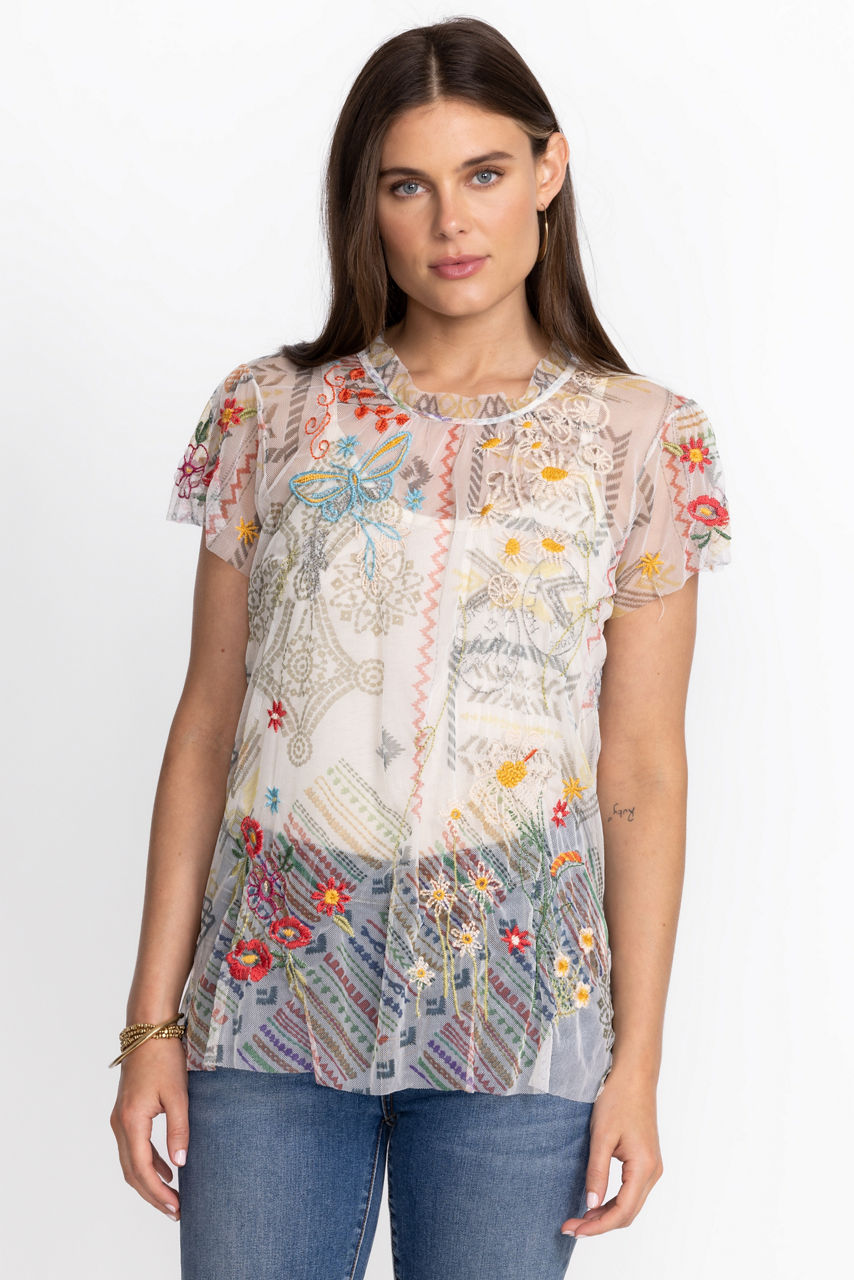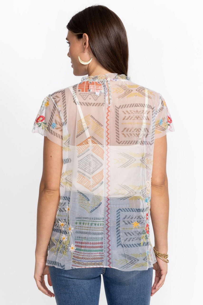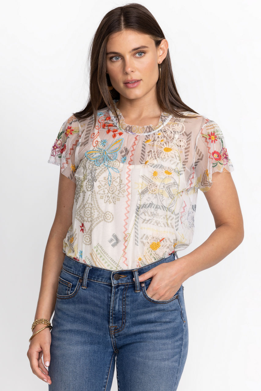 Introduce a touch of whimsy to your new seasonal repertoire with the ethereal Merida Mesh Blouse. This blouse is crafted from a lightweight mesh fabric and features shirring at the cap sleeves, a ruffle neckline for a lavish effect, and a colorful placement embroidery inspired by flora and fauna. Style this blouse with a tiered skirt or jeans during the day.