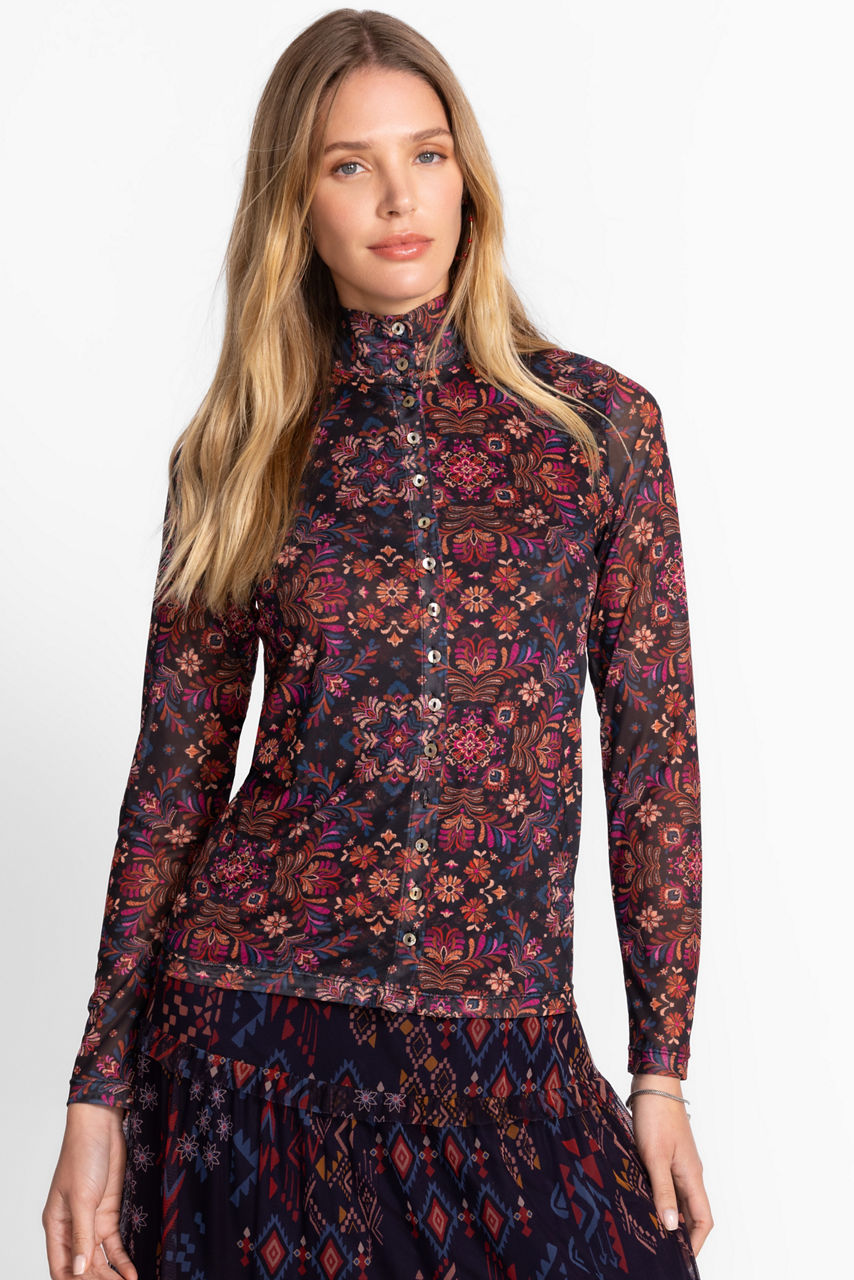 Crafted from a lightweight mesh fabric, the Brandi Mesh Button Up Mock Neck is embellished with a kaleidoscope of color and pattern. Designed with a mock neck and long sleeves, this button front top offers a fresh take on a classic wardrobe staple. Pair with classic trousers and a coordinating blazer for a modern office ensemble.