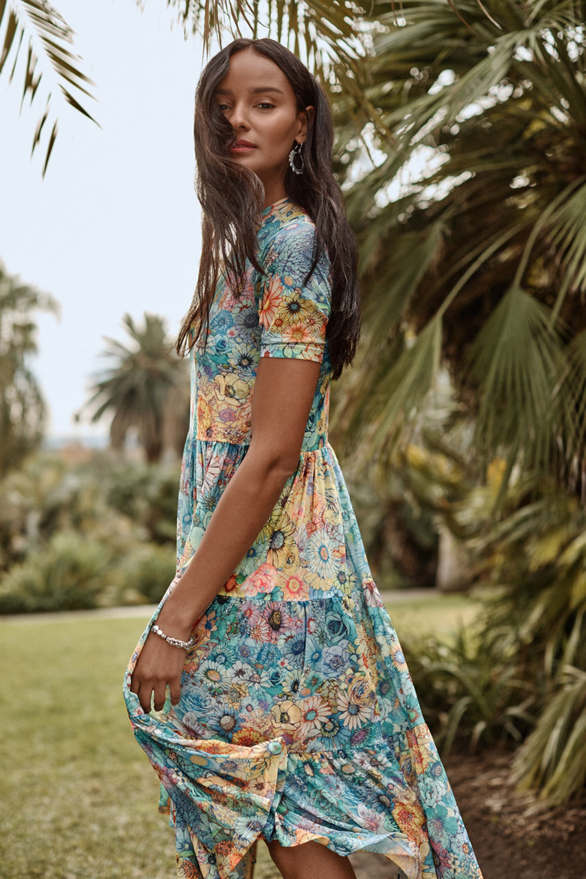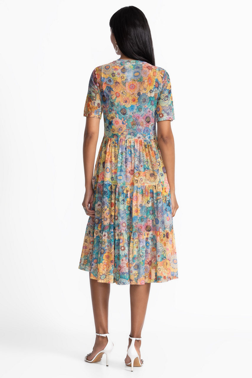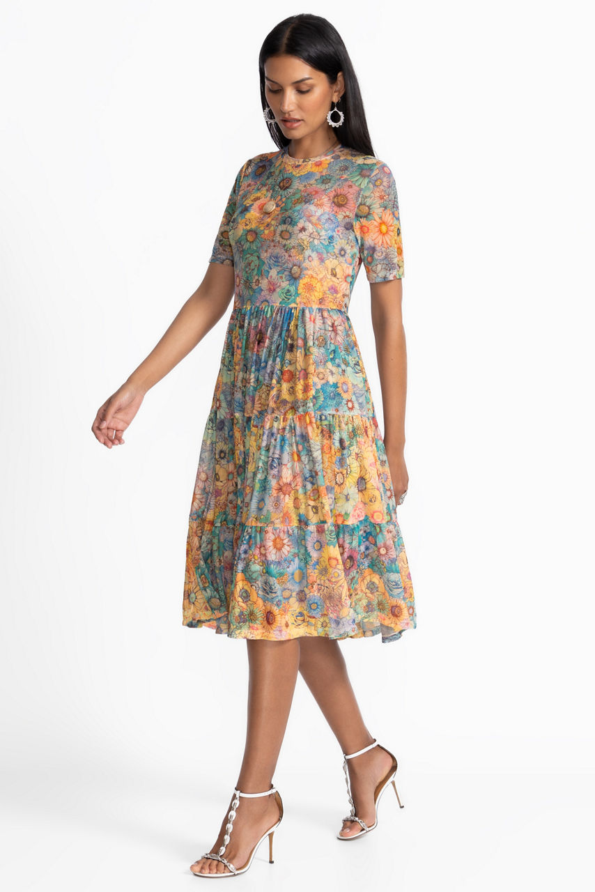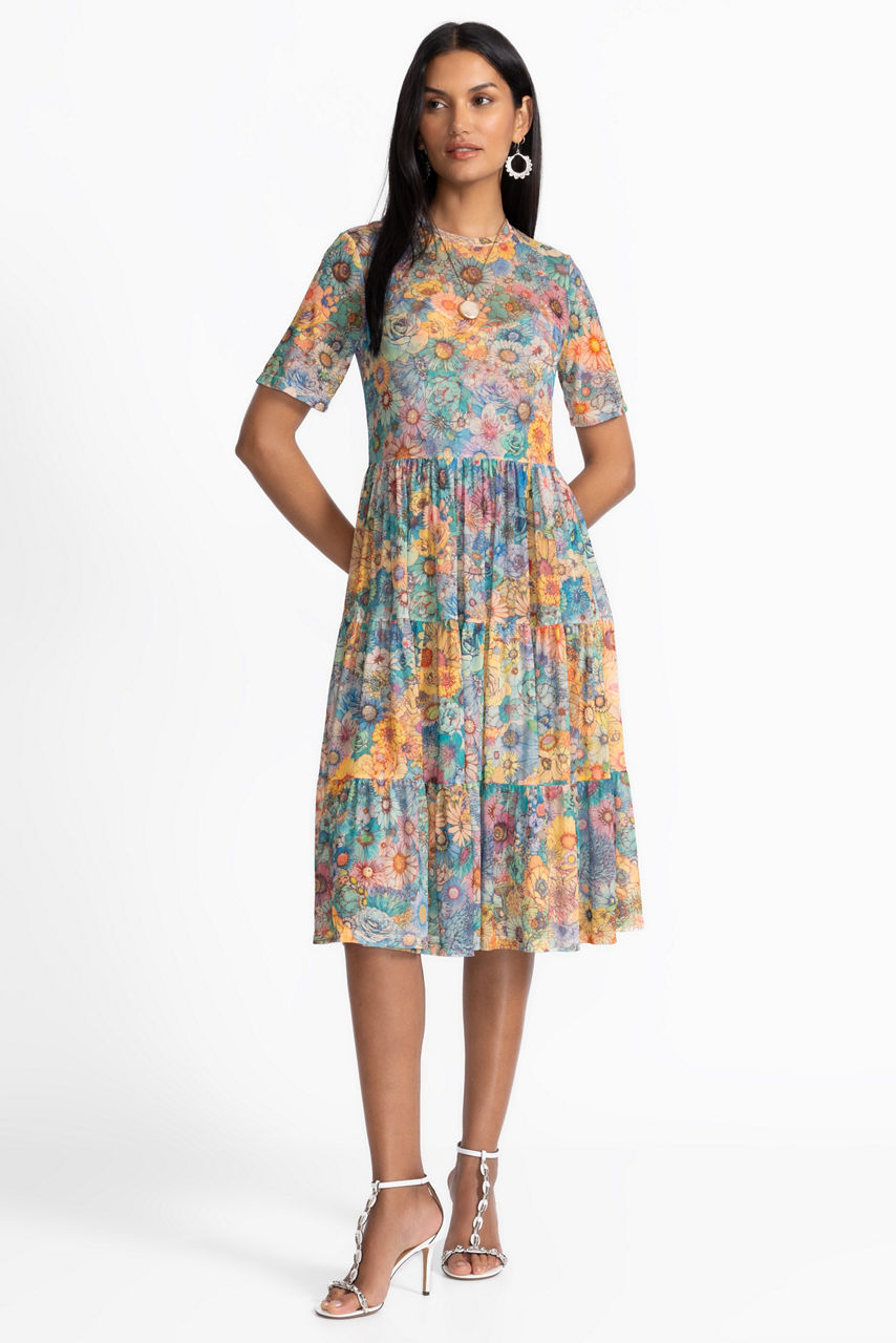 Crafted from a lightweight mesh with a hint of stretch, the Mesh Tiered Dress is embellished with a muted floral palette reminiscent of a watercolor painting. Featuring a classic crew neckline and short sleeves, this beautiful lined dress is finished with a tiered skirt that moves as you move. Pair with a denim jacket and western style boots for a girls' night out look.