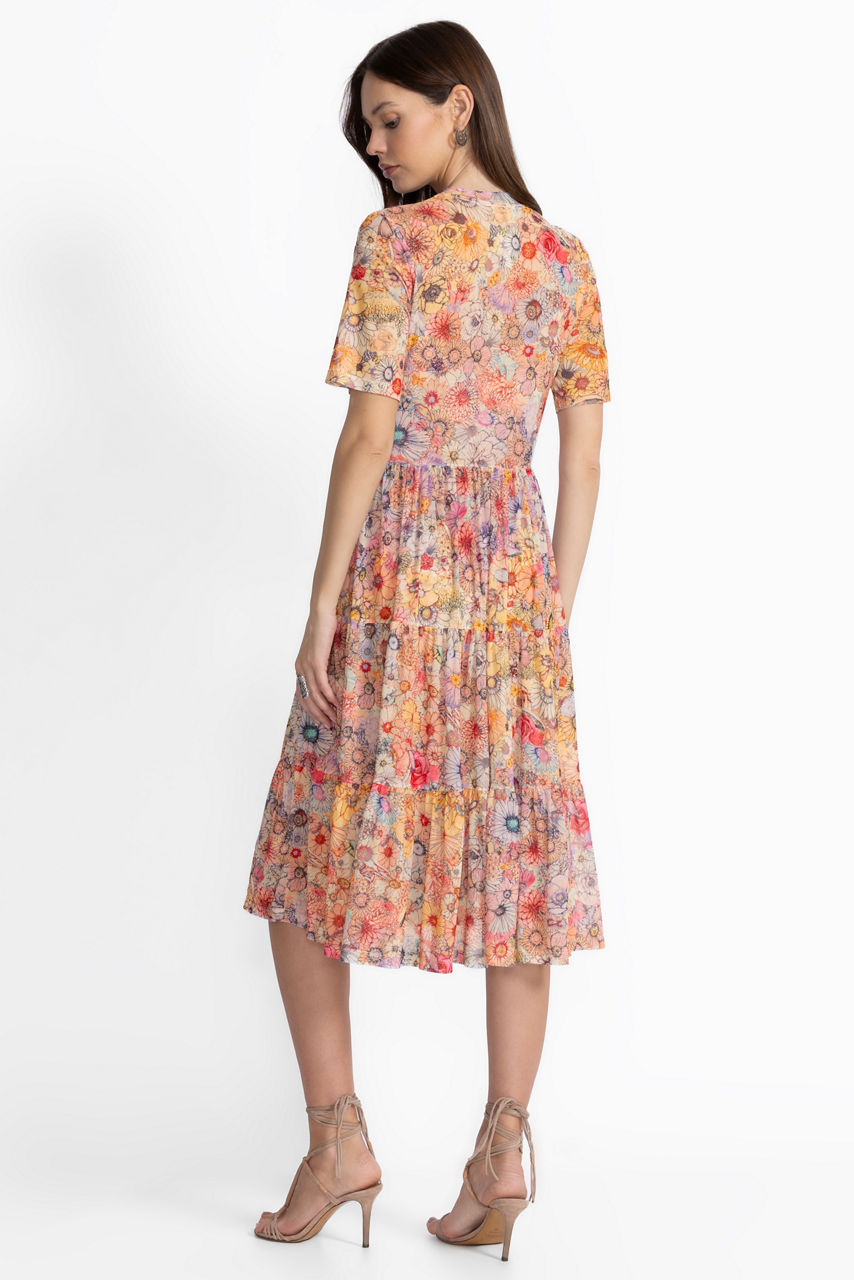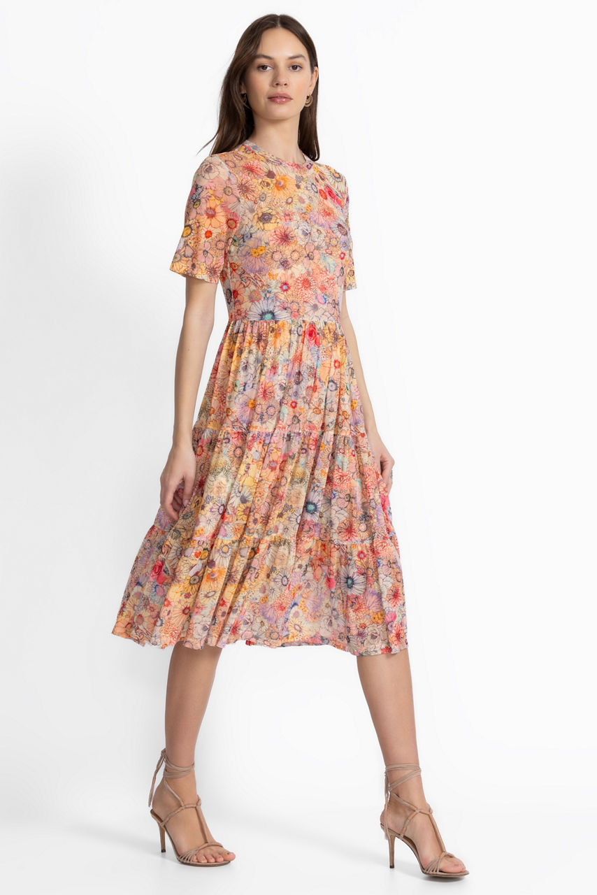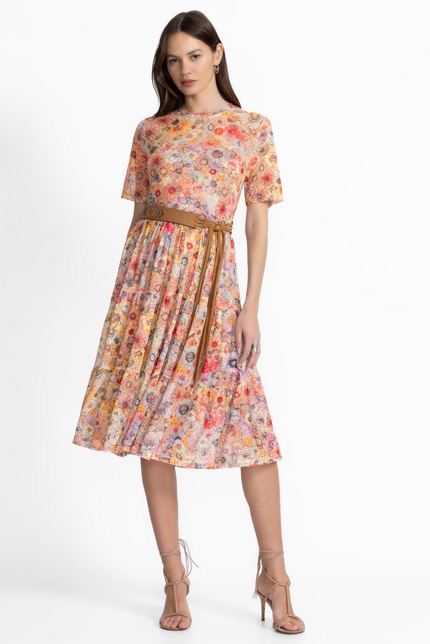Crafted from a lightweight mesh with a hint of stretch, the Mesh Tiered Dress is embellished with a muted floral palette reminiscent of a watercolor painting. Featuring a classic crew neckline and short sleeves, this beautiful lined dress is finished with a tiered skirt that moves as you move. Pair with a denim jacket and western style boots for a girls' night out look.