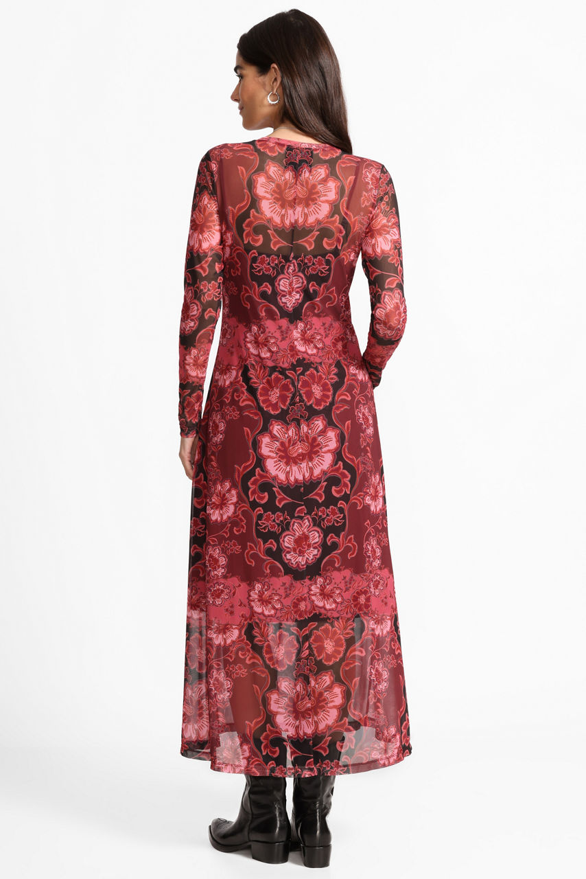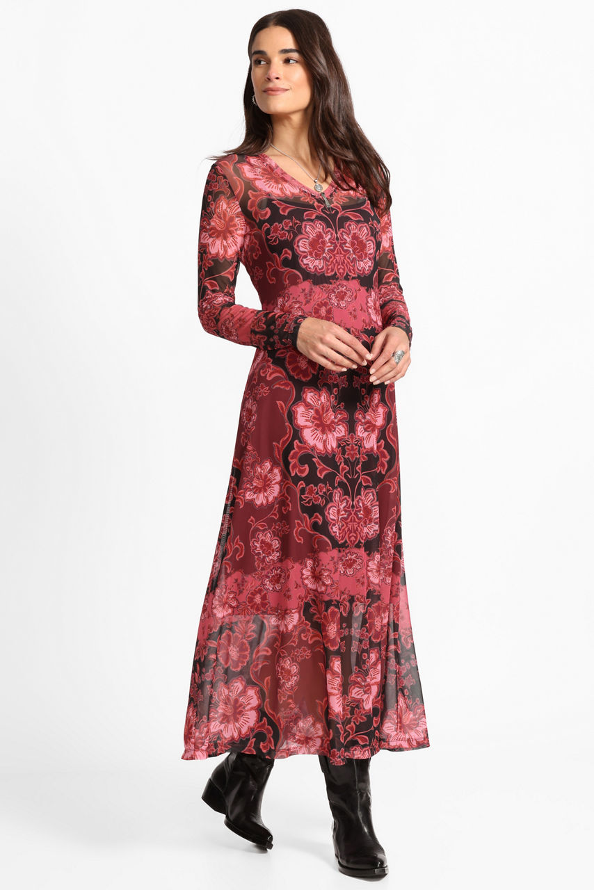 Beautifully embellished with a bold floral pattern, the Mesh V-Neck Long Sleeve Maxi Dress is crafted from a lightweight breathable fabric. Featuring a V-neckline and long sleeves, this slip-lined dress offers a mesh shell and is finished with a flowing A-line skirt. Pair with strappy heels and a coordinating clutch for an evening event.