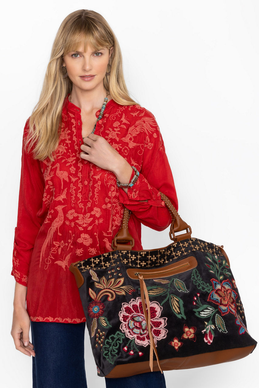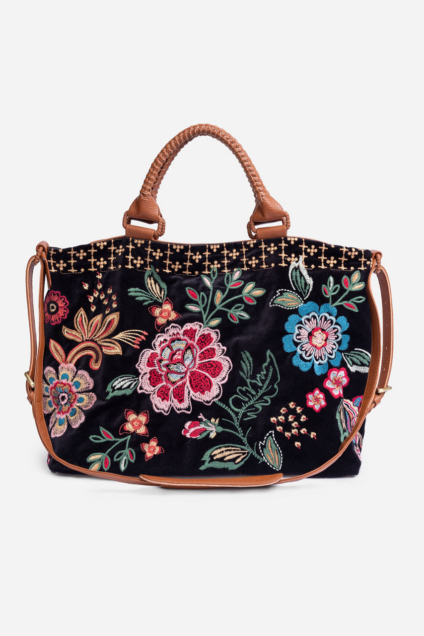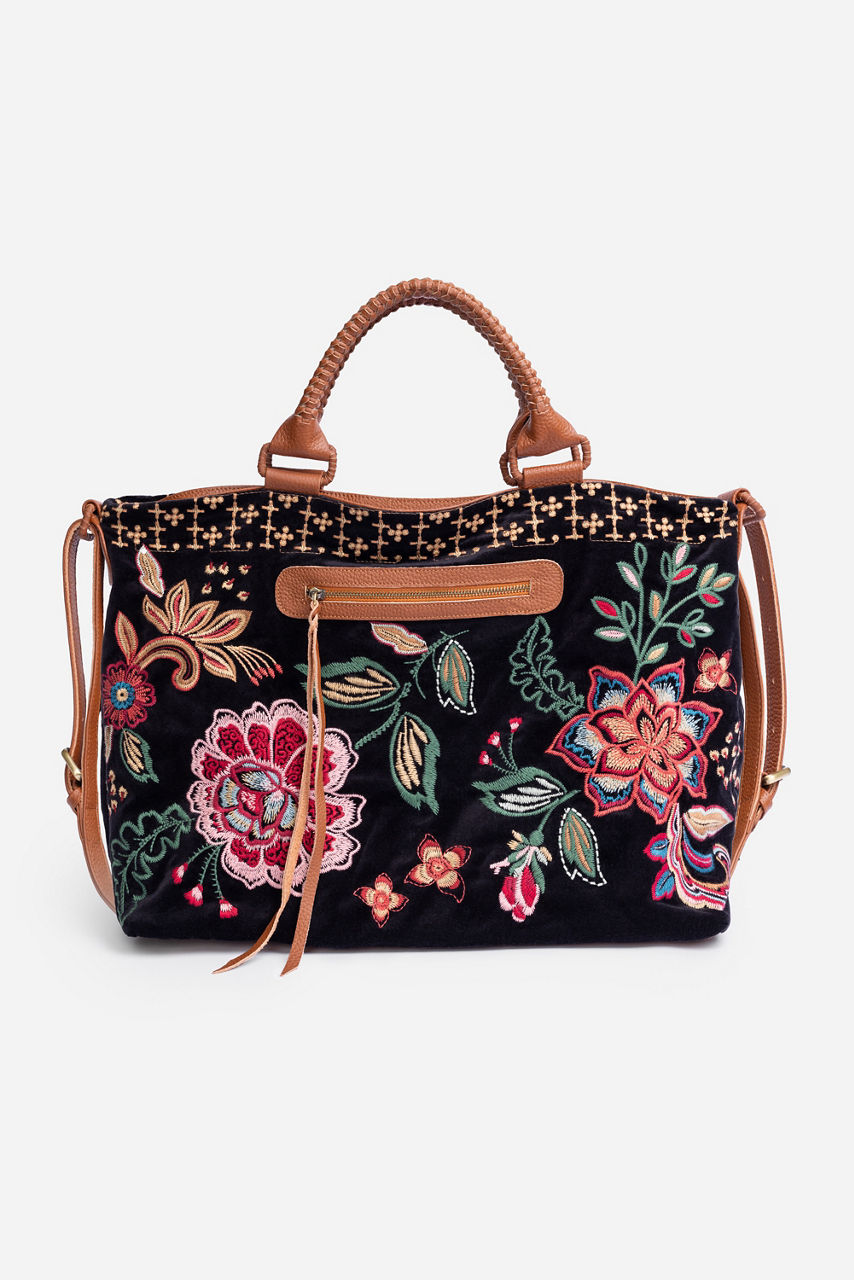 Crafted from 100% durable cotton, the Messine Overnight Bag is embellished with intricate bold floral embroidery. Featuring a top handle and a shoulder strap, this unique and spacious bag is finished with an interior slip pocket and an exterior zippered pocket. Fill it with your essentials for a weekend getaway.