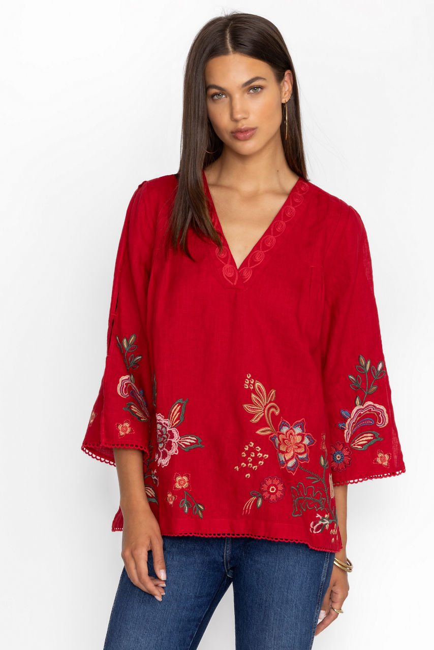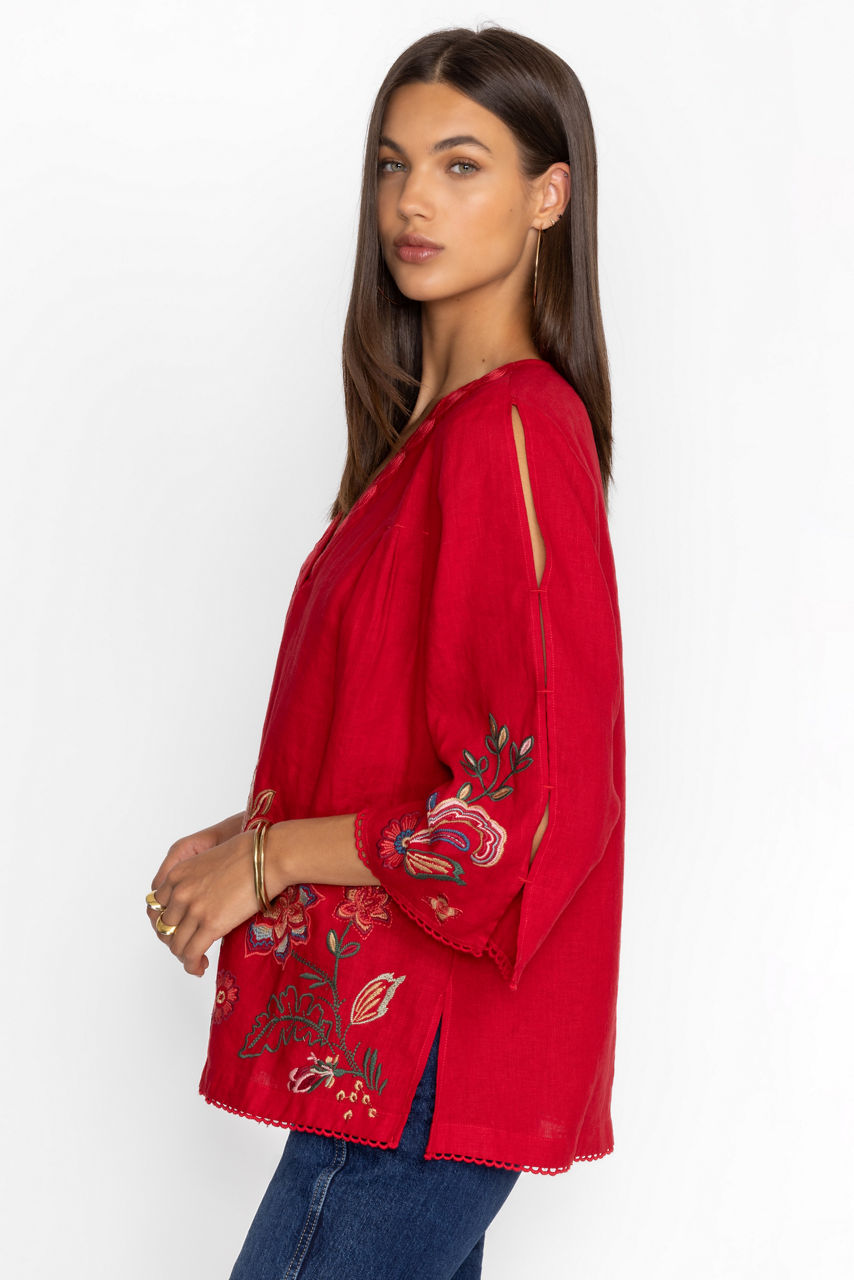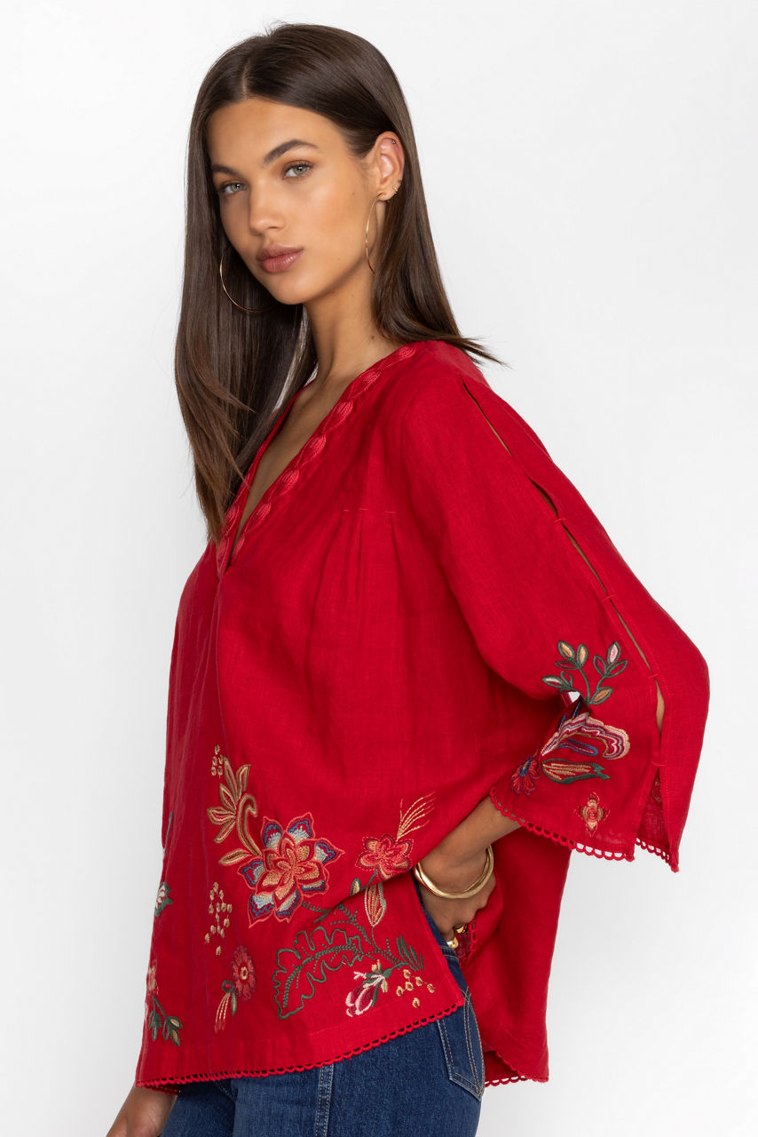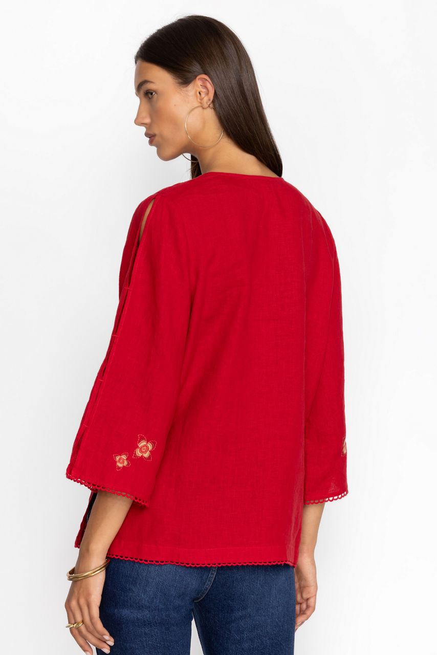 Embellished with dazzling floral embroidery, the Messine V-Neck Top with Side Slits is crafted from 100% breathable linen. Featuring a split V-neckline and 3/4 split sleeves, this relaxed-fit top is finished with inverted pleating and side slits. Pair with fitted jeans and casual flats for an easy weekend look.