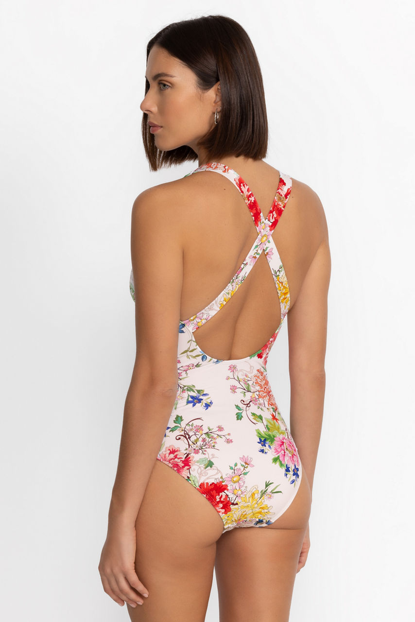 Embellished with brilliant floral blooms, the Metalli Giorno Crossback One Piece offers a modern take on traditional swimwear. Featuring a deep V-neckline and straps that cross at the back, this unique suit is crafted from a quick-drying material with a hint of stretch for comfort. Pair with the Giorno Ruffle Kimono for a complete resort-ready look.