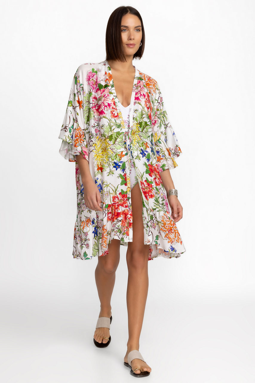 Crafted from a flowing silk blend, the Metalli Giorno Ruffle Kimono adds a touch of drama to your poolside ensemble. Featuring an open front and delicate ruffling at the sleeves and hemline, this midi-length kimono is embellished with brilliant florals in a colorful array. Layer over the Metalli Mix Ruched One Piece for a perfectly coordinated look.
