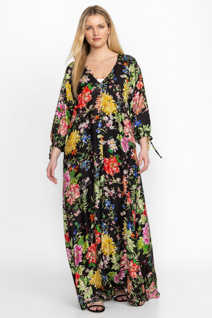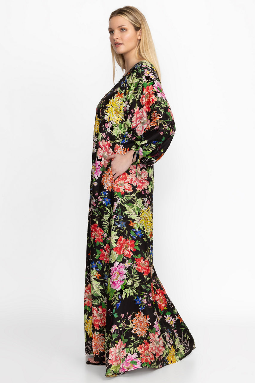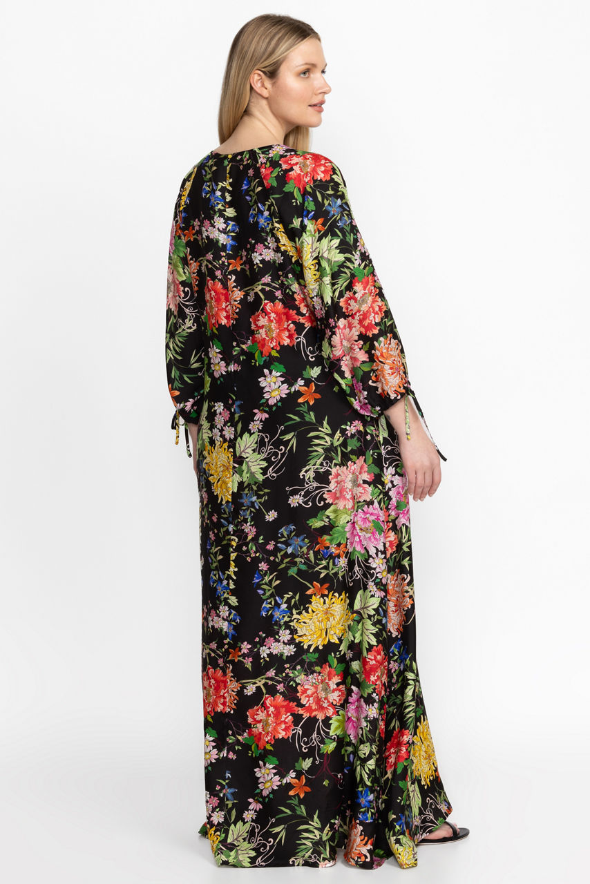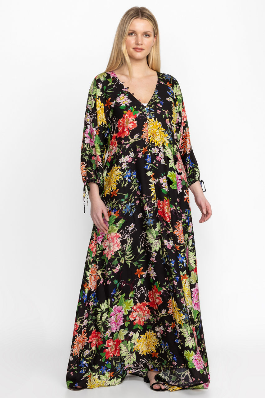 Crafted from a luxurious silk blend, the Metalli Mix Long Dress is adorned with bold floral blooms alive with vibrant color. Featuring a deep V-neckline and drawstring sleeves for a customizable look, this dress offers a full-length skirt with pockets at the seams. Pair with espadrille wedges and delicate jewelry for a fresh warm weather look.