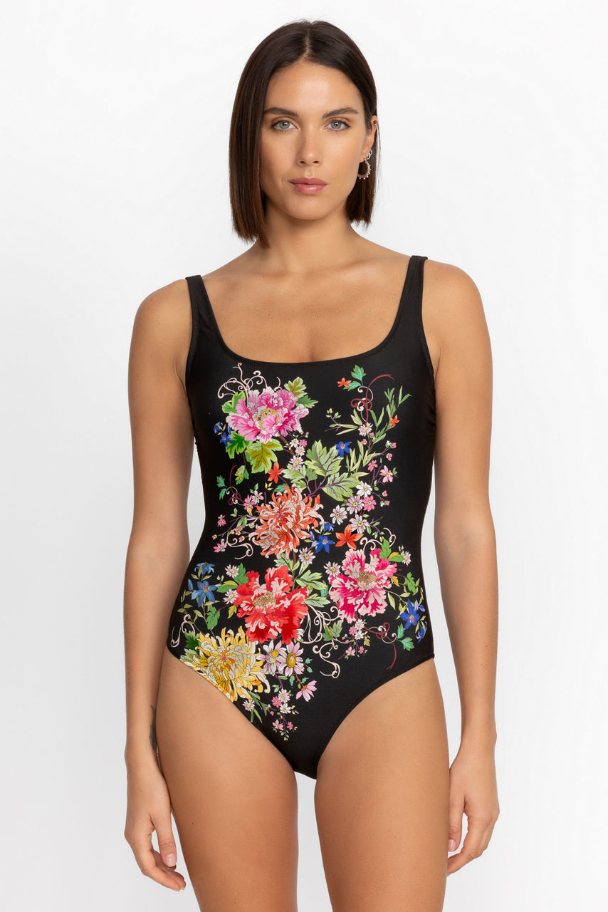 Simple and beautiful, the Metalli Notte Tanksuit One Piece is embellished with vivid floral bouquets. Featuring a scoop neckline at the front and back, and adjustable straps, this classic suit provides modest coverage. Pair with the Metalli Notte Cropped Palazzo Pants and leather sandals for a look that transitions easily from poolside to lunch date.