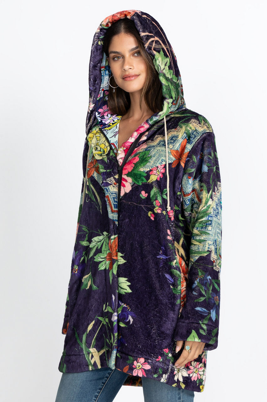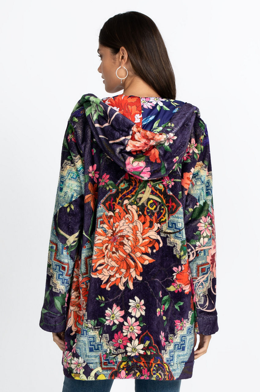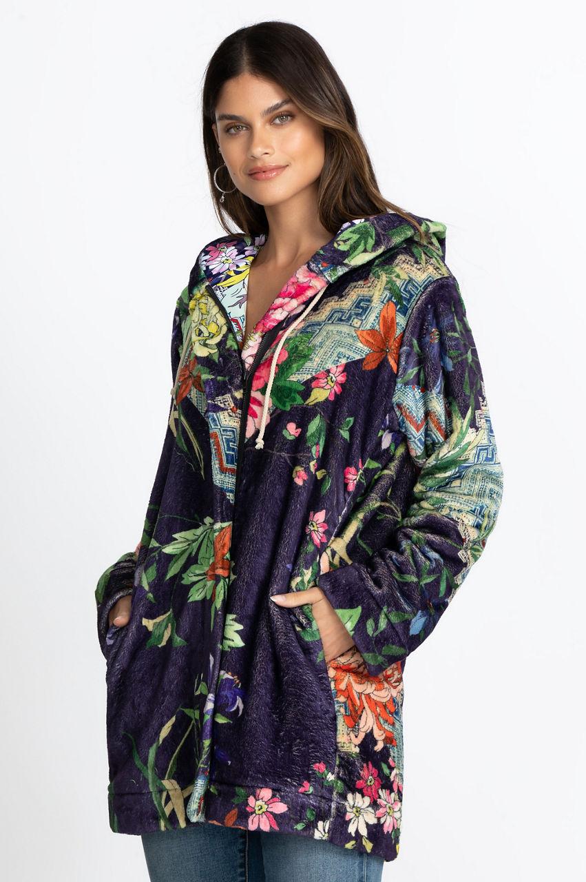 Stay warm and fashionable with this stunning floral jacket. The Metalli Sherpa Jacket is a comfortable outer layer that introduces some deep colors and a beautiful motif that truly pops against the neutral background. With its zipper closure, pockets, and hood, it s also a practical jacket for cooler weather. Create a timeless fall look by pairing this jacket with some knee-high boots and leggings!