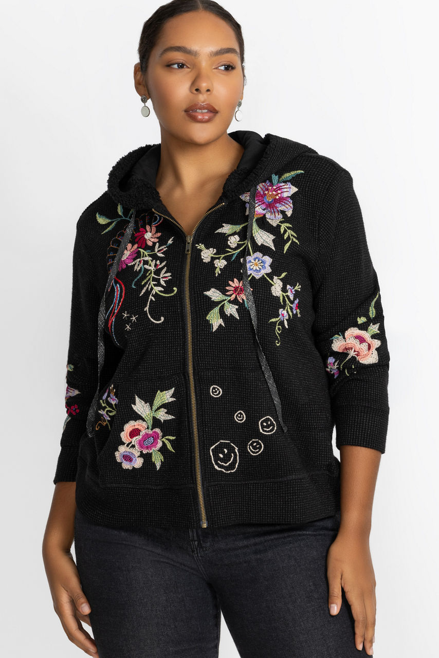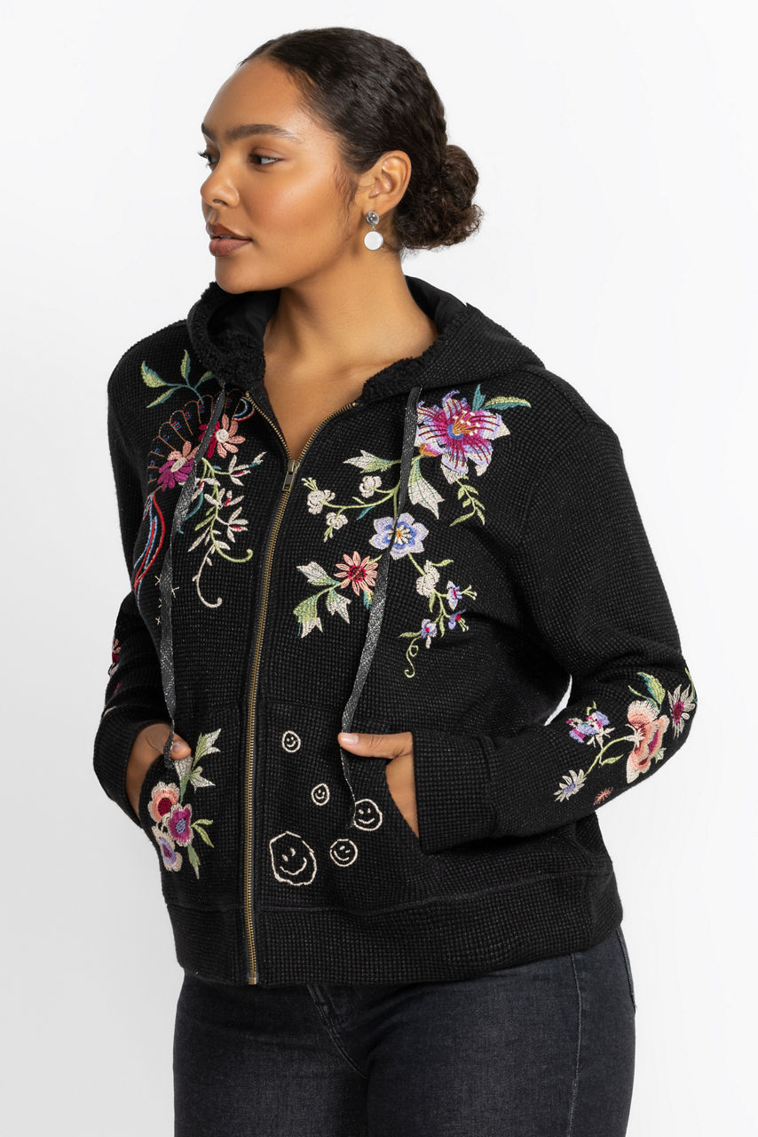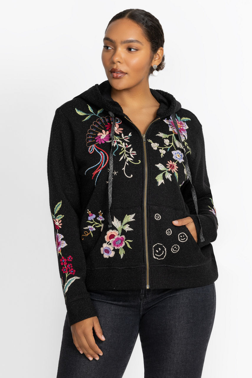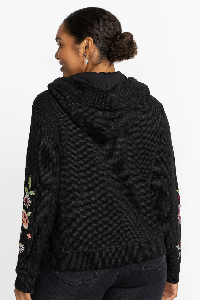 Intricately adorned with bold floral embroidery, the Metallic Thermal Zip Up Hoodie perfectly combines casual comfort with feminine style. Featuring glints of metallic silver in this unique fabric, this zip-front hoodie is finished with a Kanga pocket at the front to keep your hands warm. Pair with a classic tee and fitted jeans for a fun weekend ensemble.