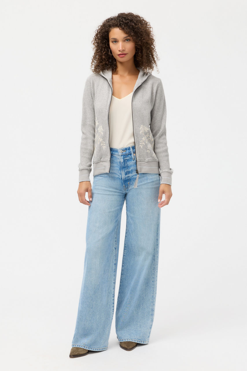 Embellished with intricately embroidered details, the Molly Metallic Thermal Zip Up Hoodie offers a monochromatic casual look with a hint of sparkle. Designed with a zip front and an attached hood, this unique hoodie features slip pockets and is finished at the cuffs and hemline with an athletic striped band. Pair with a classic tee and relaxed-fit denim for a modern casual look.