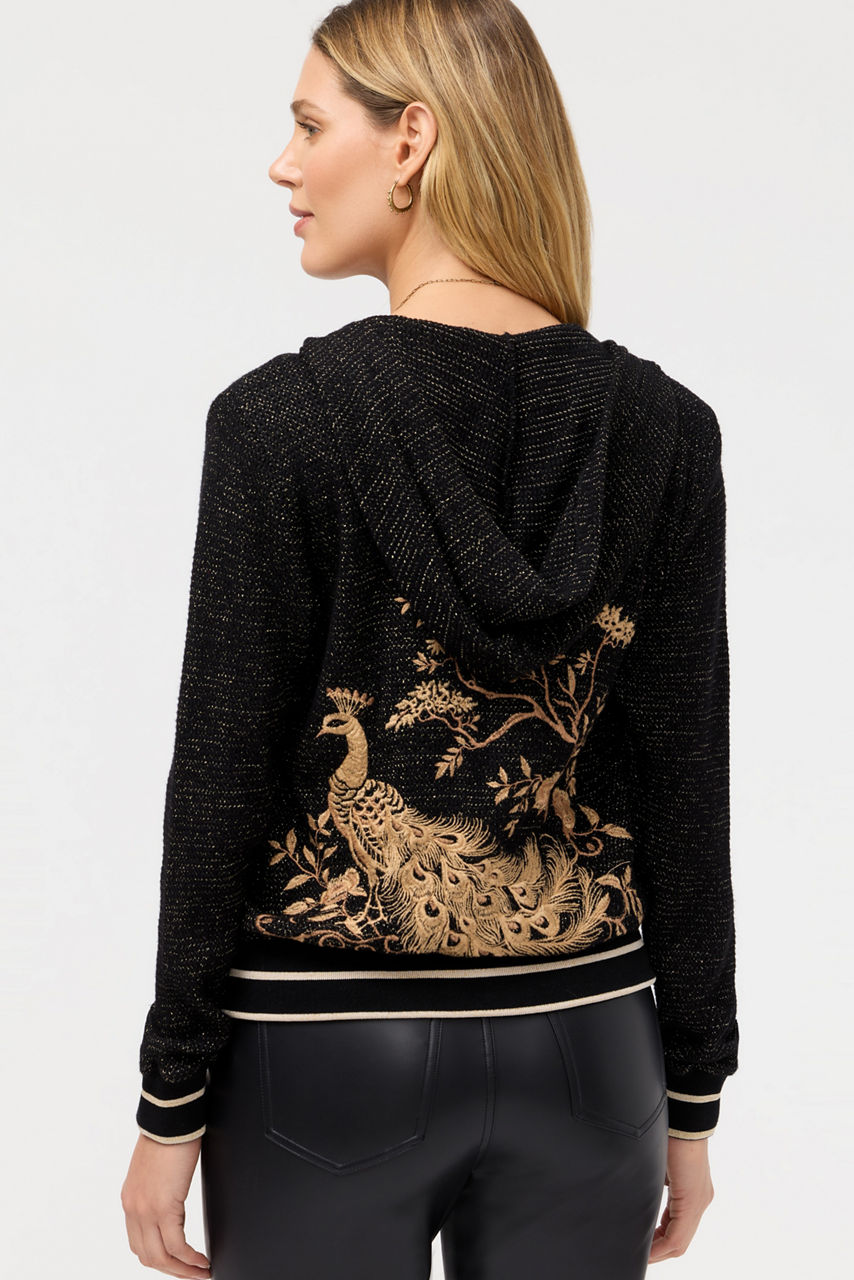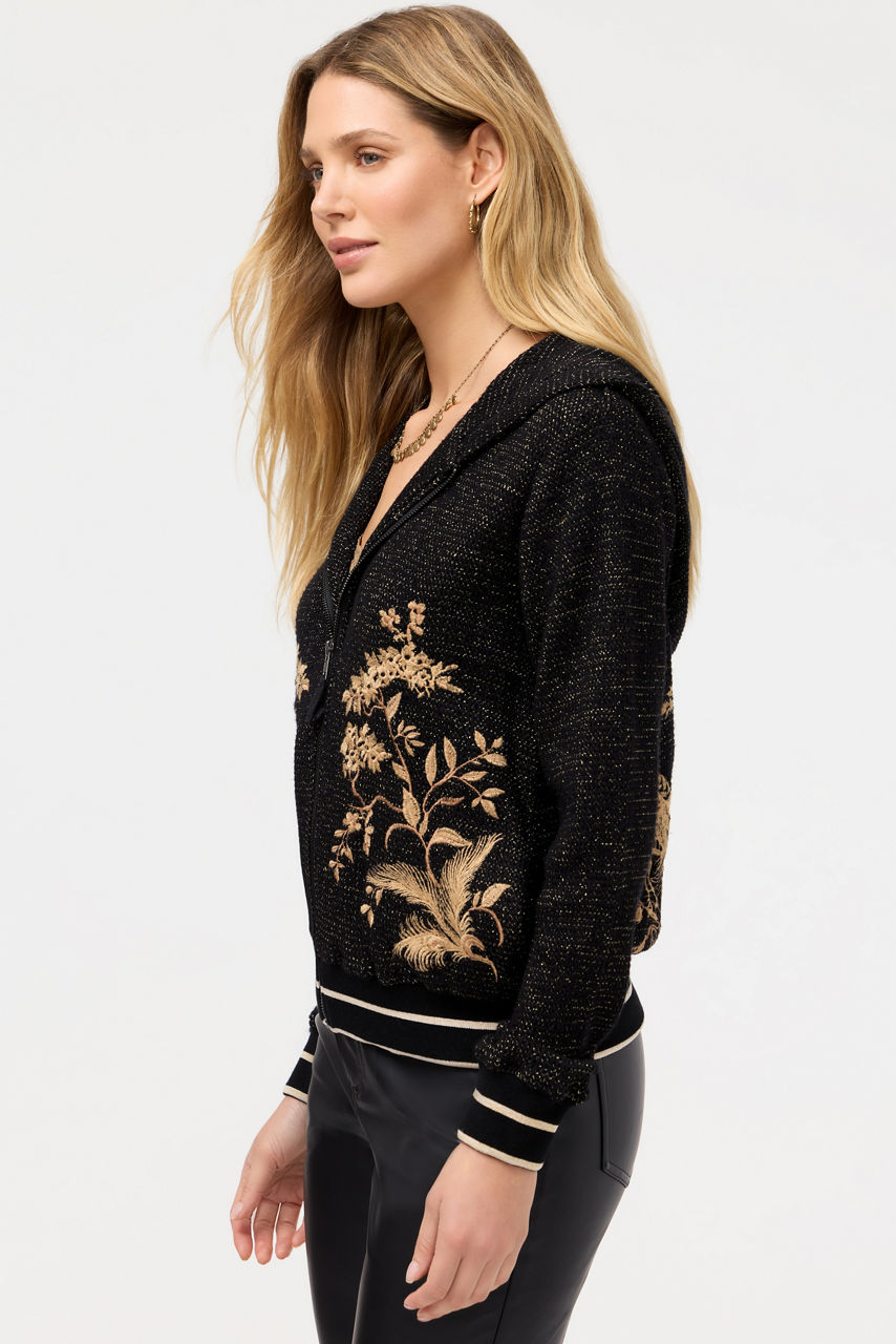 Embellished with intricately embroidered details, the Molly Metallic Thermal Zip Up Hoodie offers a monochromatic casual look with a hint of sparkle. Designed with a zip front and an attached hood, this unique hoodie features slip pockets and is finished at the cuffs and hemline with an athletic striped band. Pair with a classic tee and relaxed-fit denim for a modern casual look.