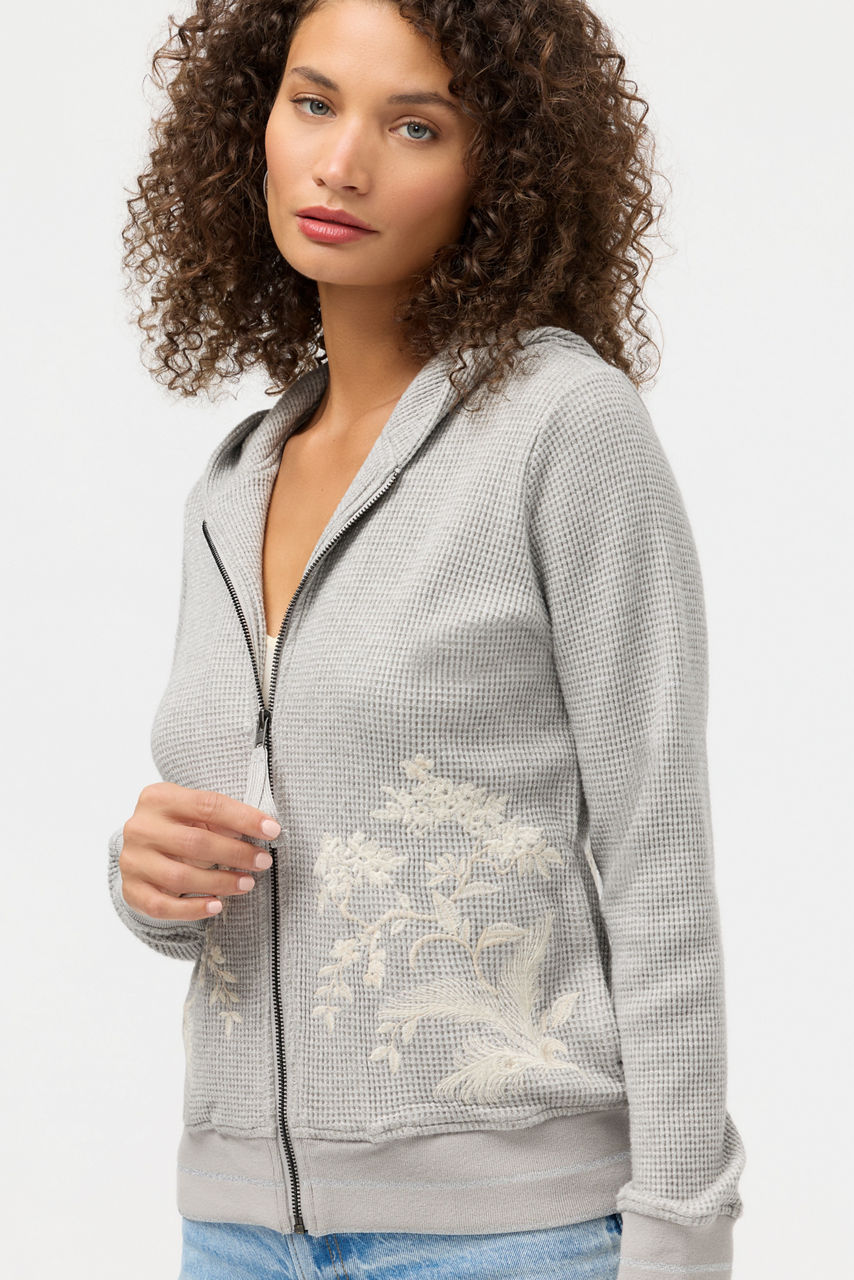 Embellished with intricately embroidered details, the Molly Metallic Thermal Zip Up Hoodie offers a monochromatic casual look with a hint of sparkle. Designed with a zip front and an attached hood, this unique hoodie features slip pockets and is finished at the cuffs and hemline with an athletic striped band. Pair with a classic tee and relaxed-fit denim for a modern casual look.
