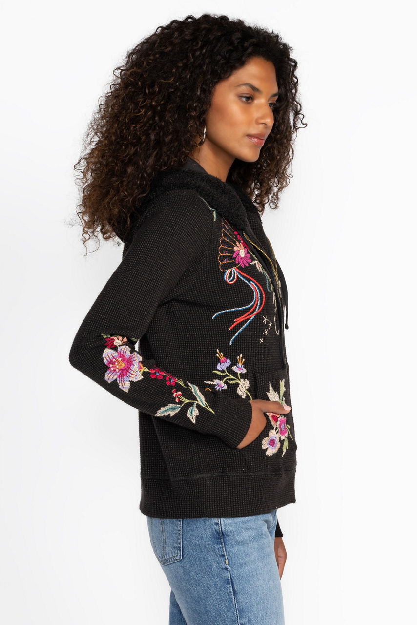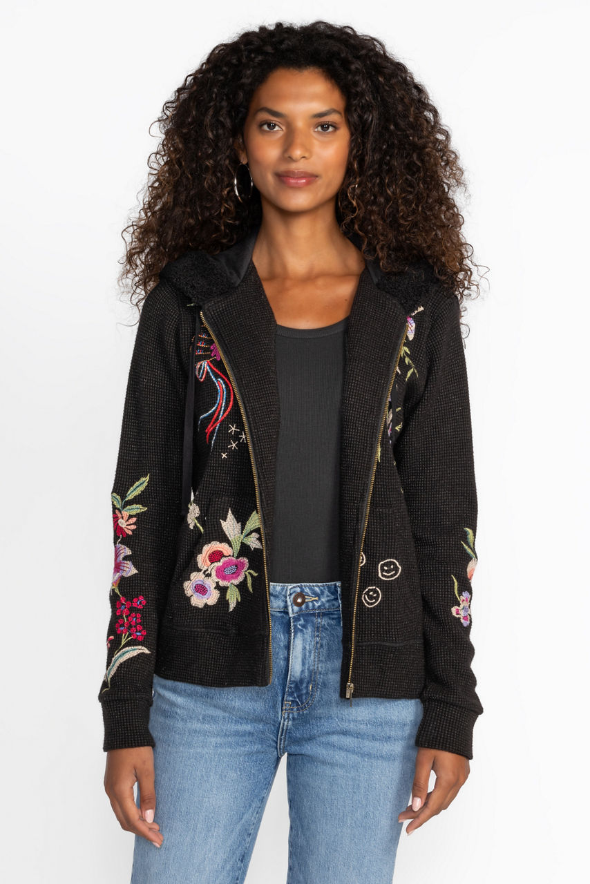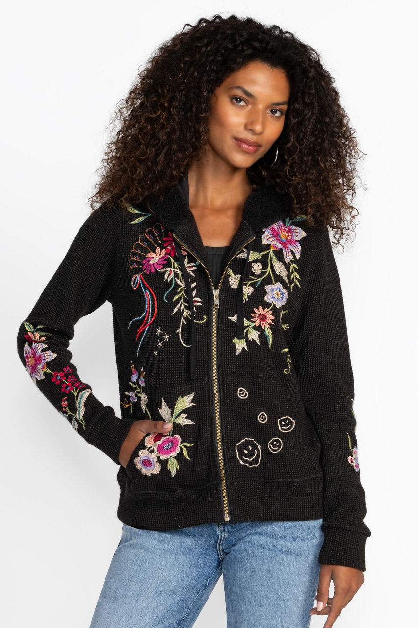 Intricately adorned with bold floral embroidery, the Metallic Thermal Zip Up Hoodie perfectly combines casual comfort with feminine style. Featuring glints of metallic silver in this unique fabric, this zip-front hoodie is finished with a Kanga pocket at the front to keep your hands warm. Pair with a classic tee and fitted jeans for a fun weekend ensemble.
