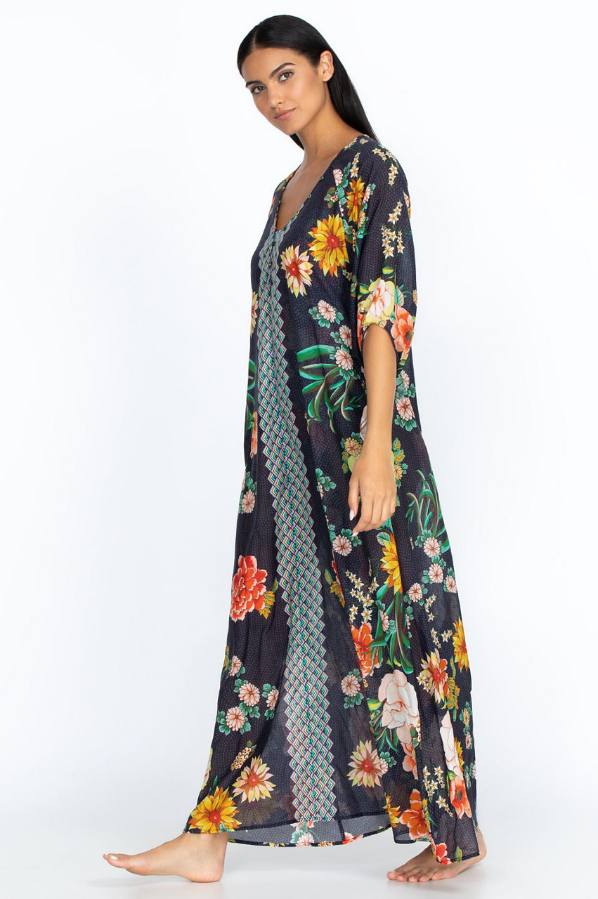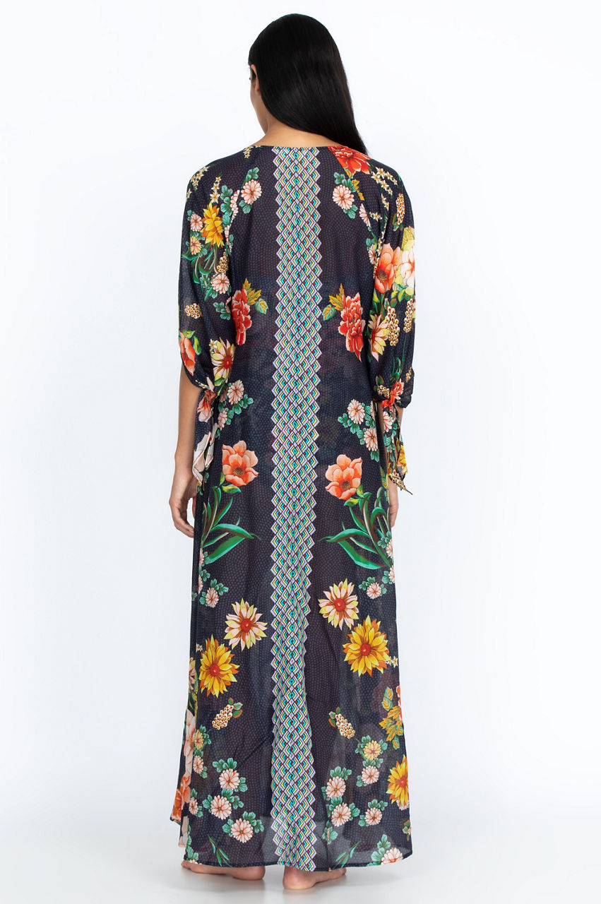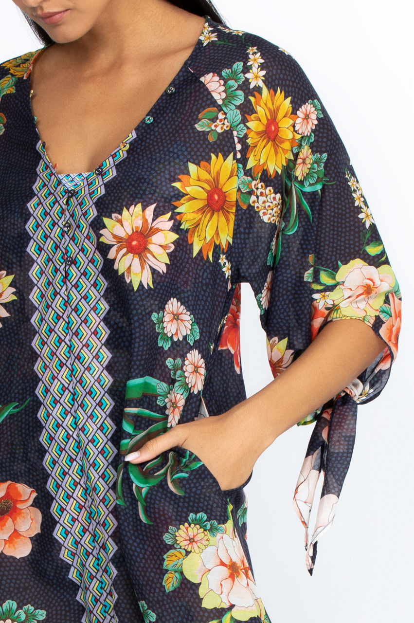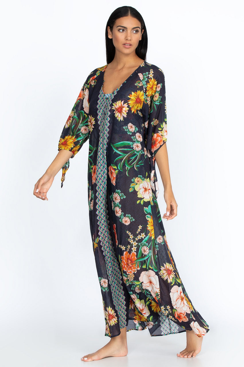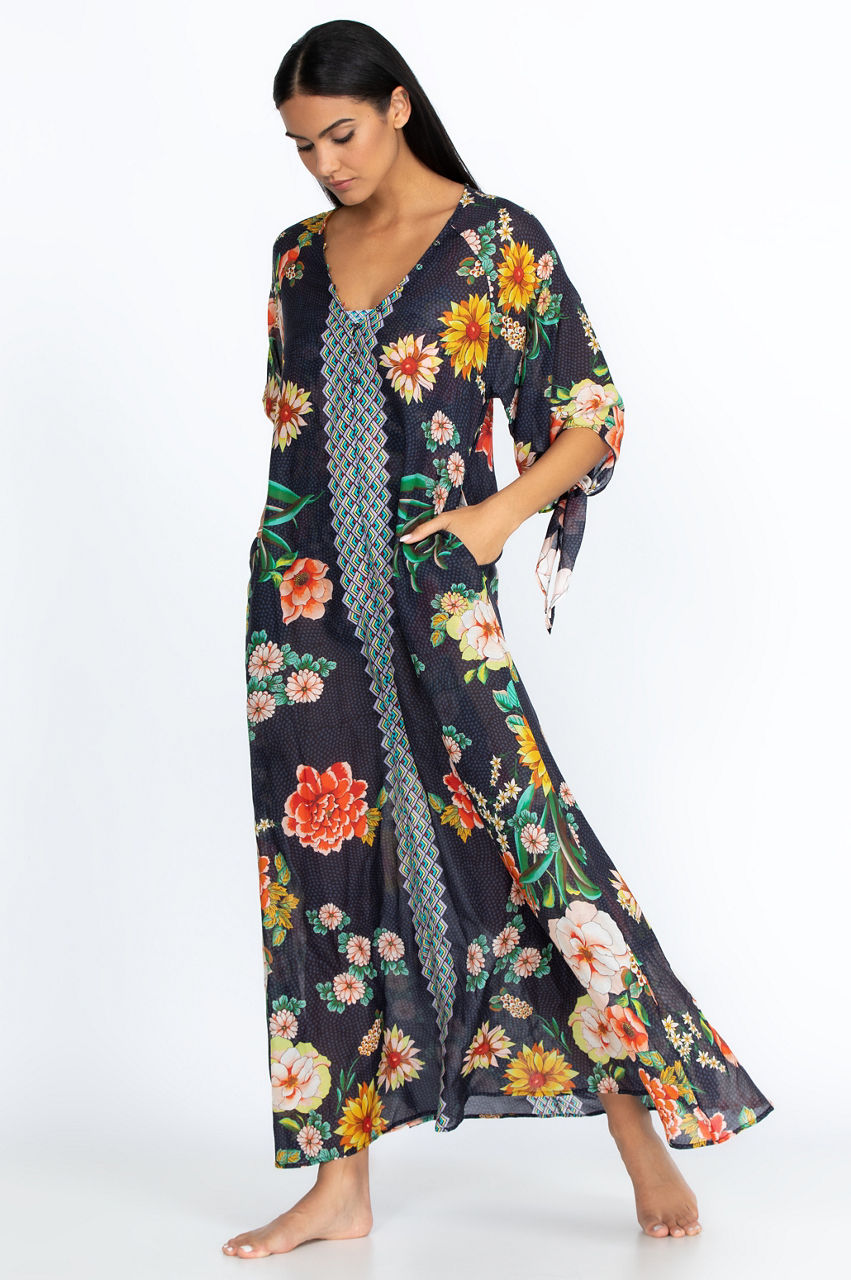 Add colors and movement to your outfits with this chic floral dress. The Floral Border Long Dress features a colorful nature-inspired pattern. The contrasting front placket features geometric motifs that add structure to the piece. Create an effortless boho-chic look by adding some layered jewelry and ankle boots.