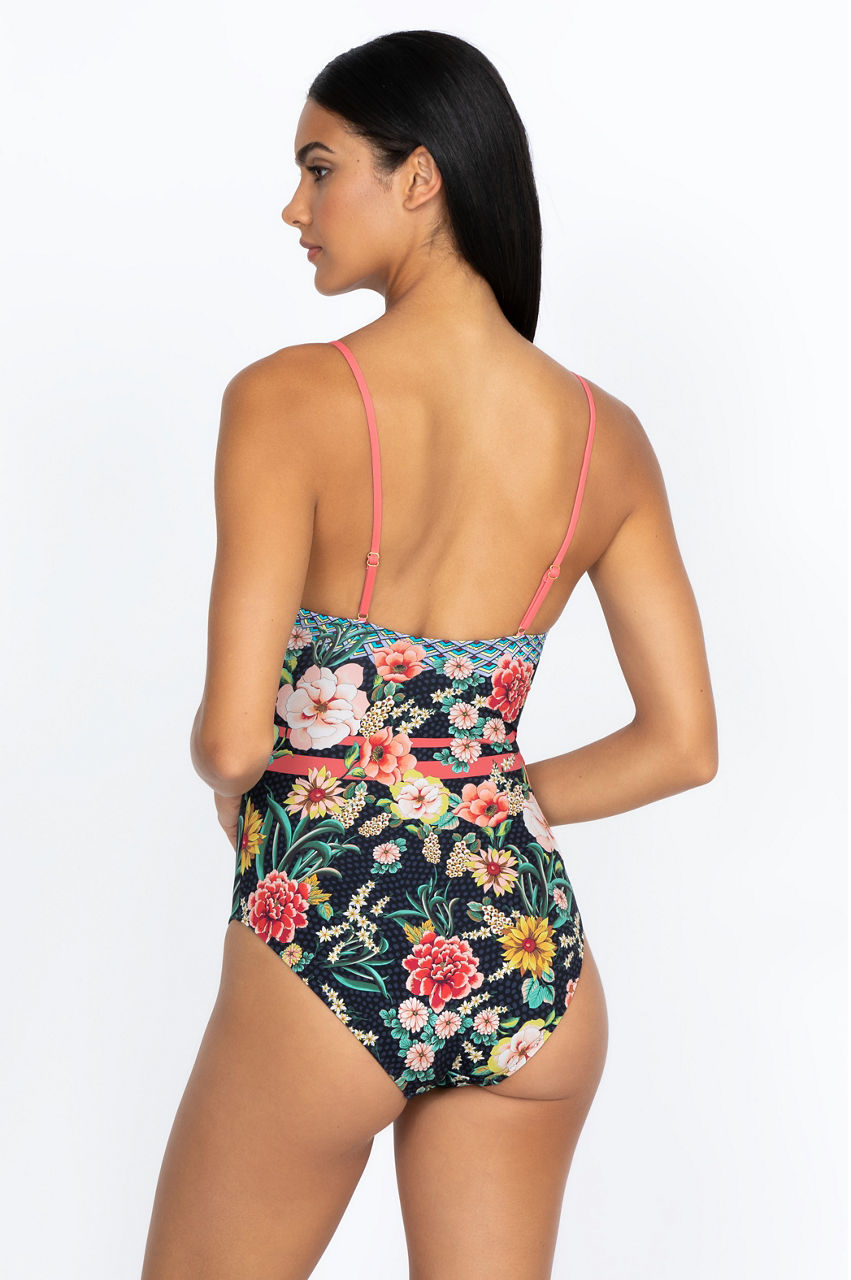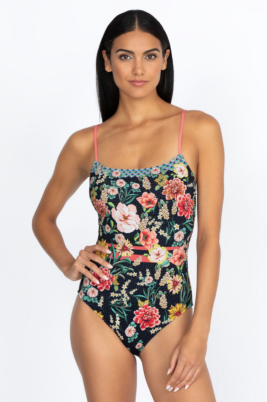 Swim or lounge by the pool in style with this stunning one-piece swimsuit. The floral motifs will add a touch of color to your look, while the discreet geometric elements add structure to the piece for a flattering result. The material and spaghetti strap creates a comfortable fit. Pair this gorgeous swimsuit with a floral beach coverup.