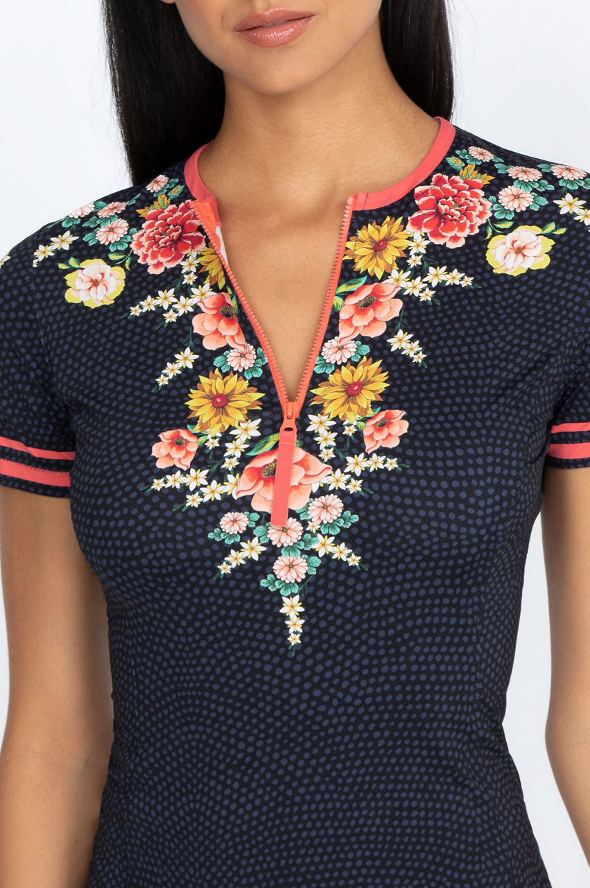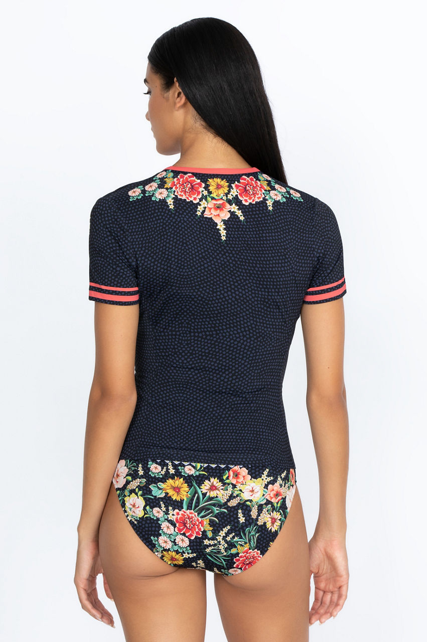 This comfortable surf shirt is a stylish addition to your swimwear collection with its flattering silhouette and elegant floral details. Whether you enjoy swimming and surfing or simply want more coverage, this surf shirt is an excellent choice with its stretchy material. Pair it with a floral hipster bottom, or choose a neutral bikini bottom to make the floral details pop.