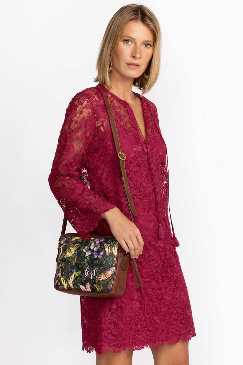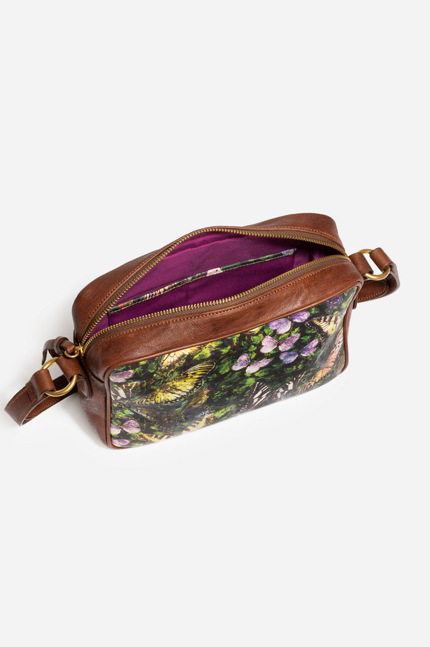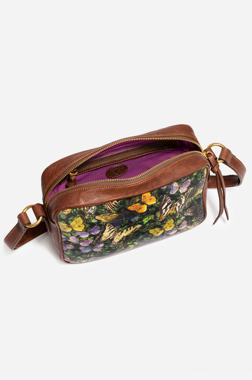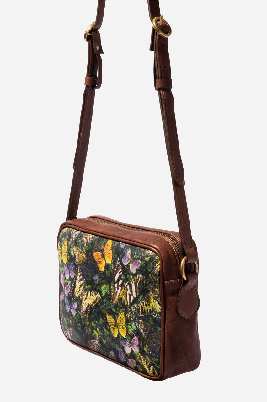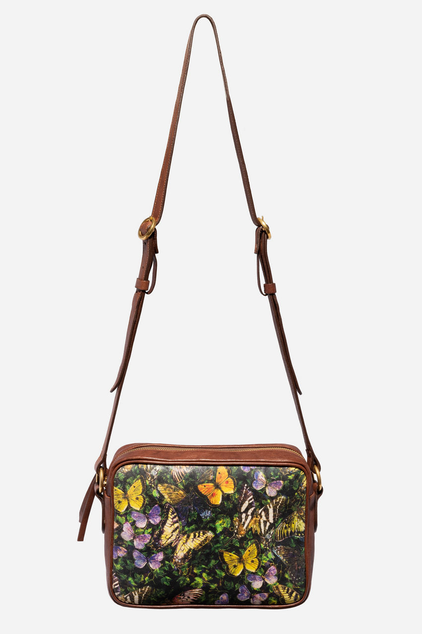 Adorned with a bevy of butterflies displayed on a lush backdrop, the Italian-made Midnight Mariposa Crossbody makes a chic addition to your everyday looks. Offering beautiful bold color in 100% leather this hands-free bag is perfect for daily use or world travel. Pair with jeans and a bold blouse for an eye-catching casual outfit.