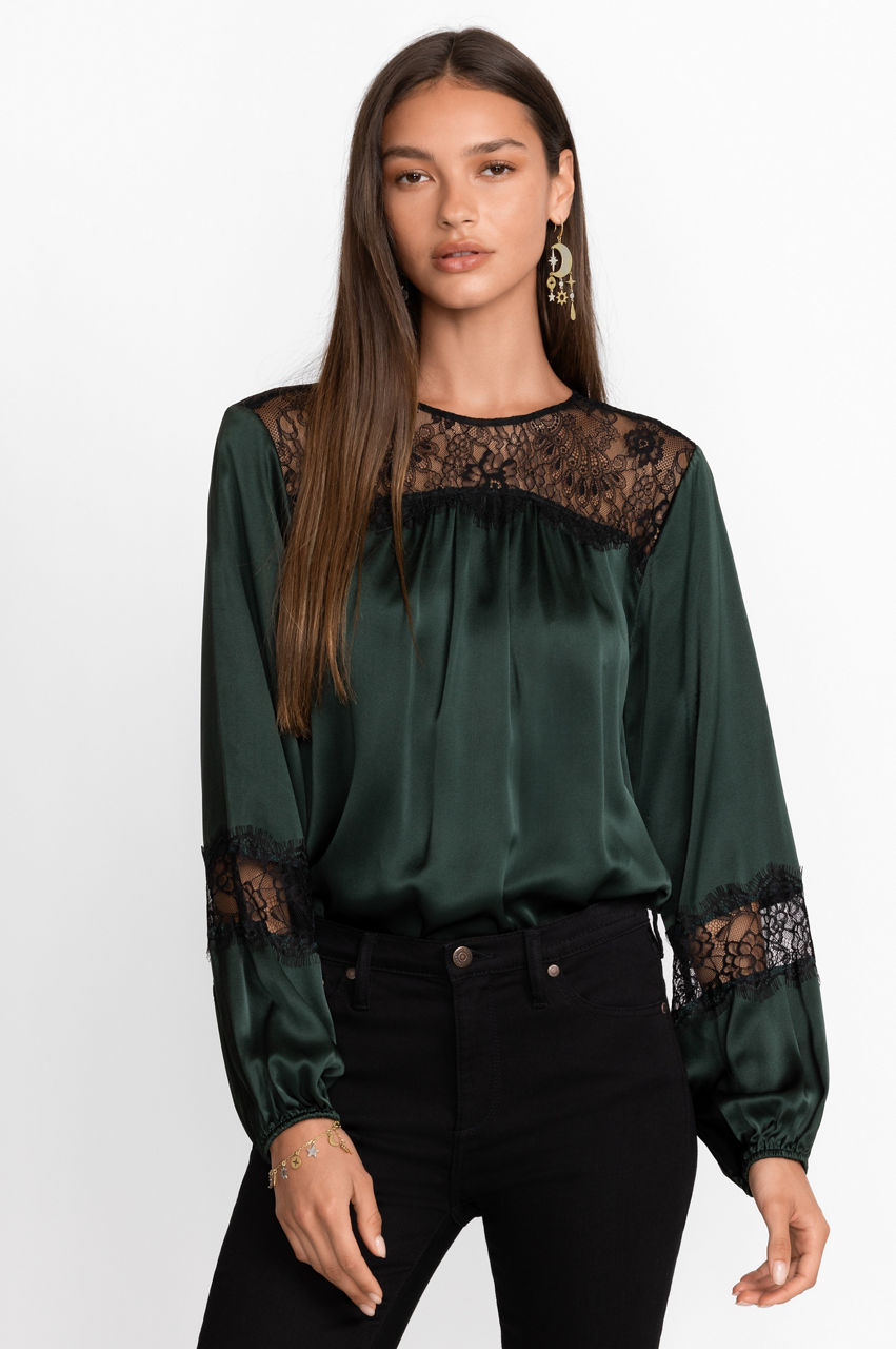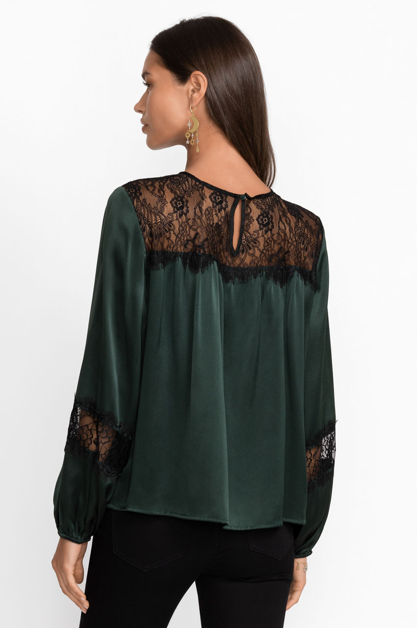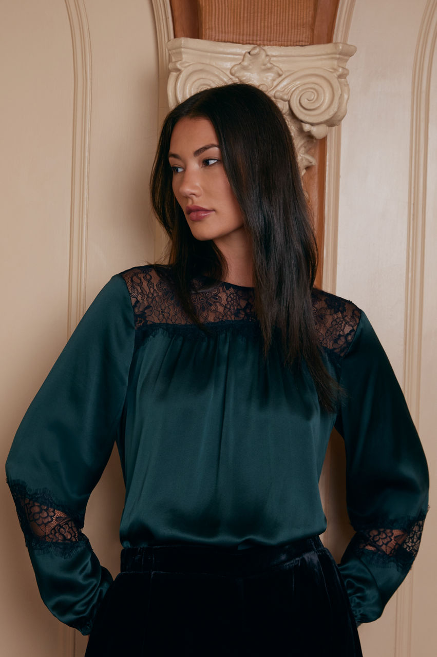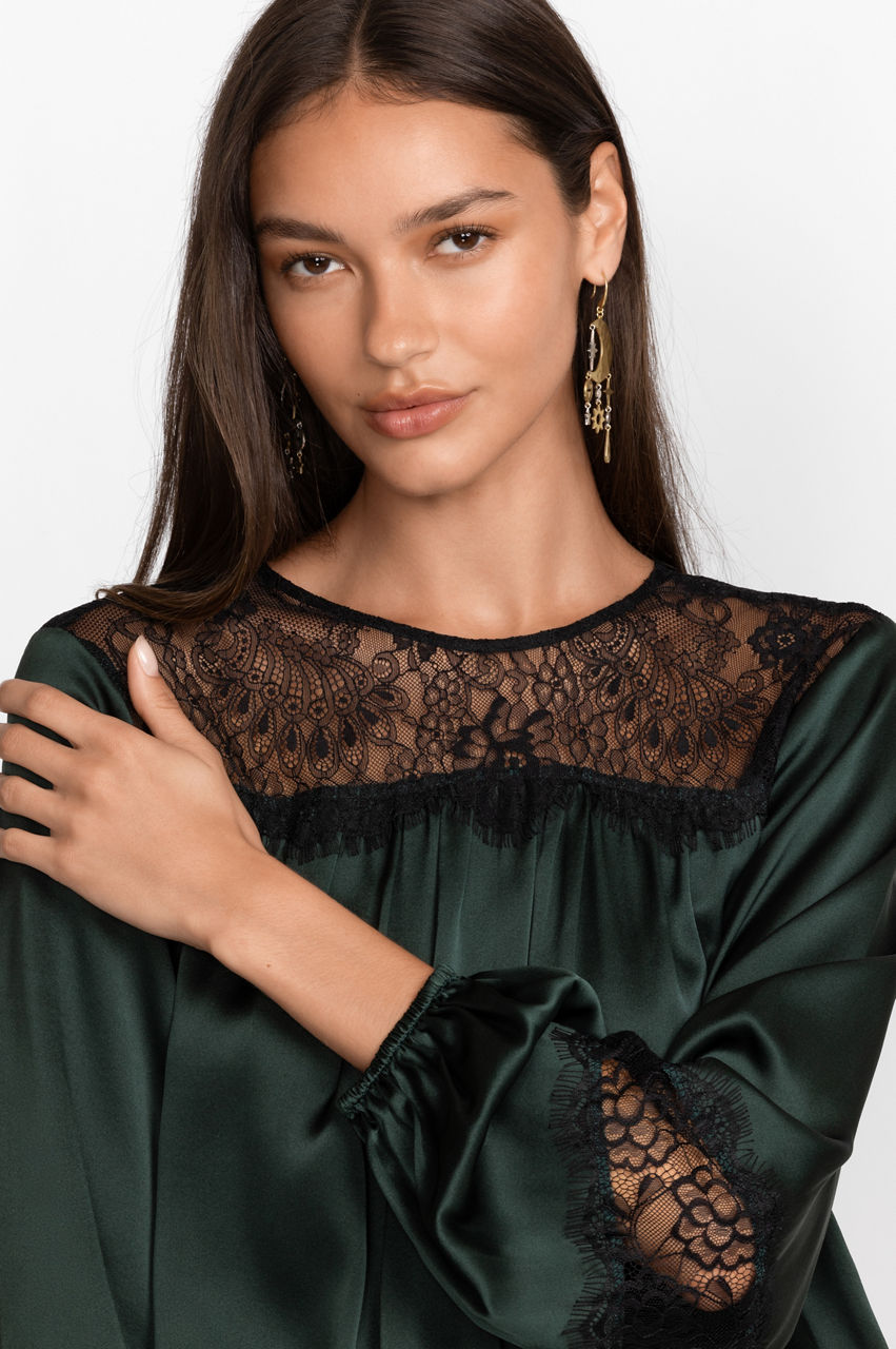 The Midnight Silk Blouse drapes gracefully, mirroring your every gesture with elegance. Impeccably fashioned from 100% luxurious silk, it boasts dramatic lace embellishments, a rounded neckline, and statement-making bishop sleeves. To epitomize weekday sophistication, combine it effortlessly with tailored cigarette pants and sleek flats.
