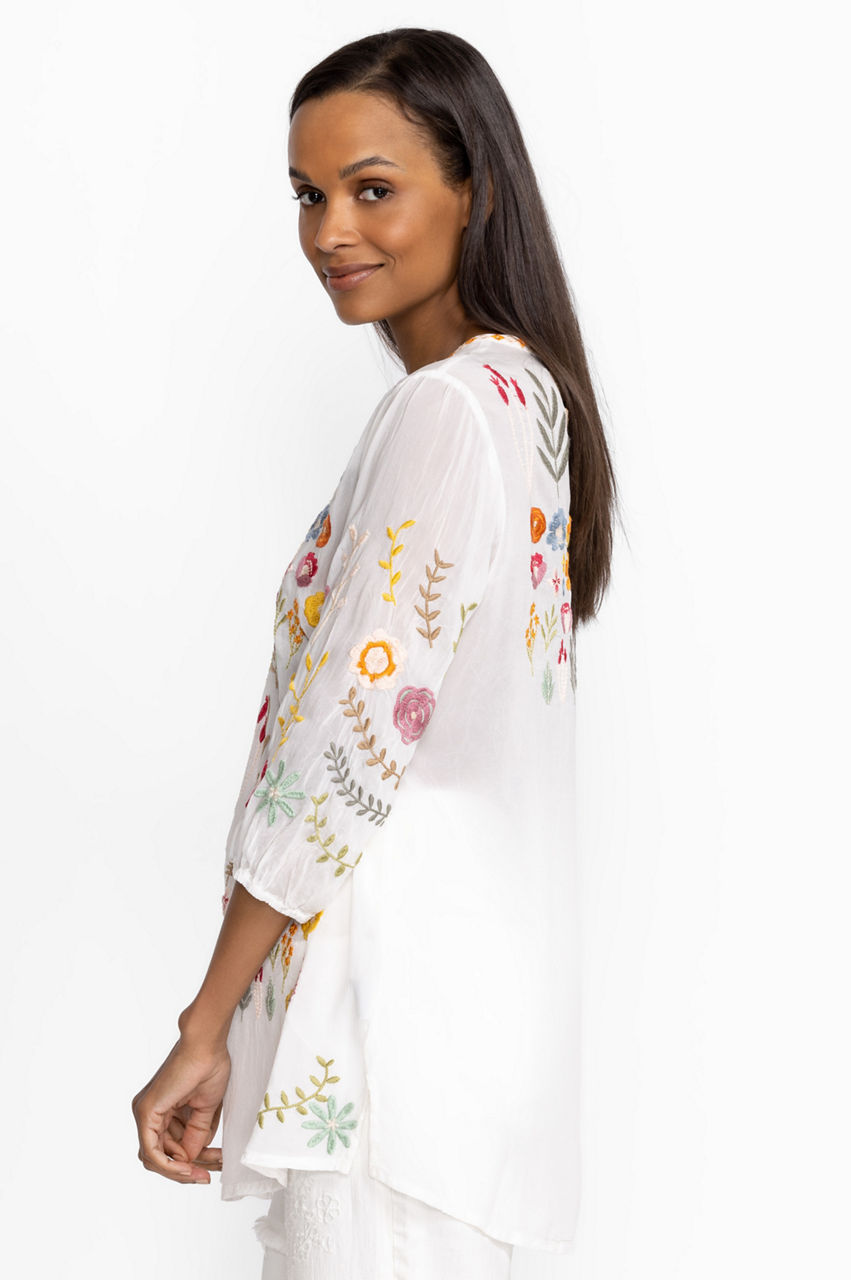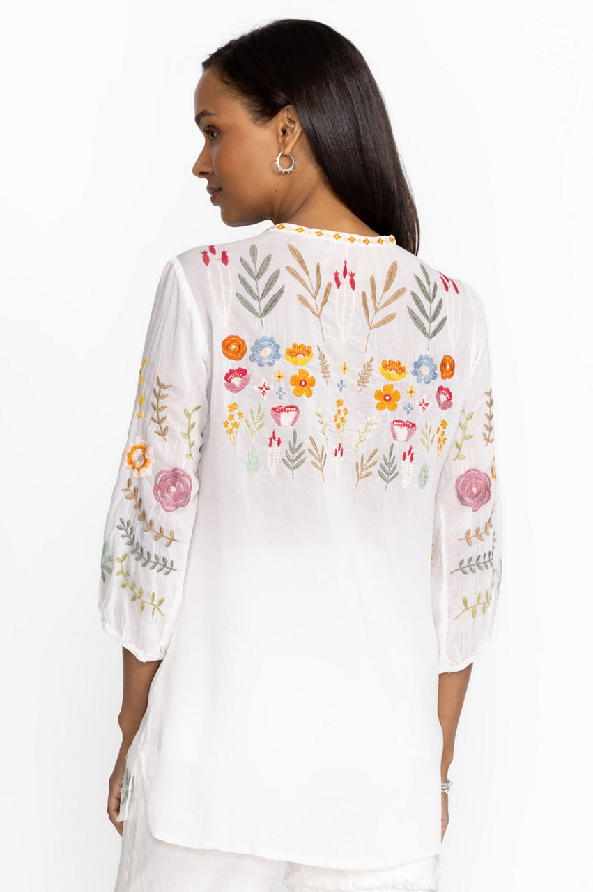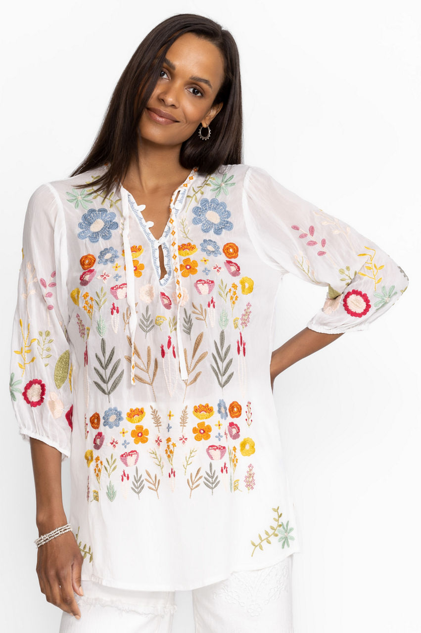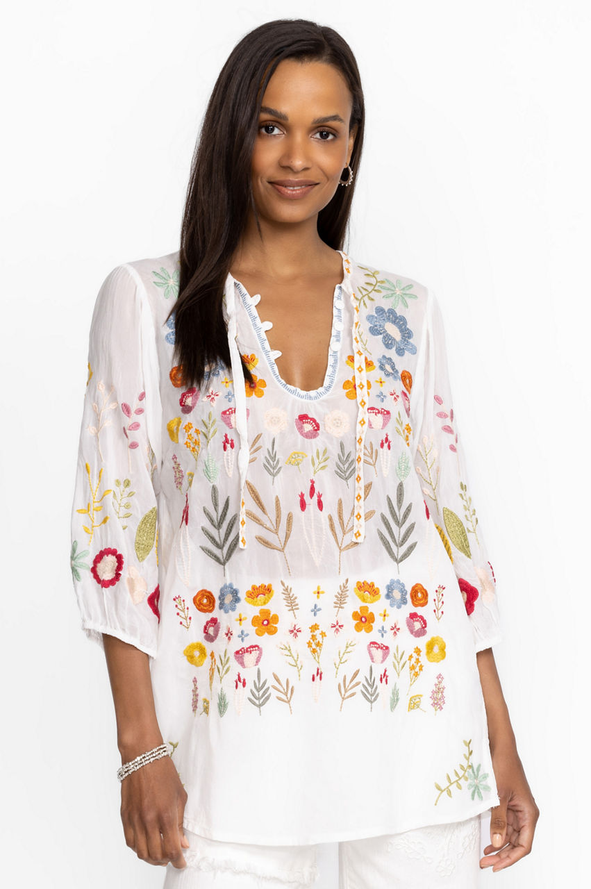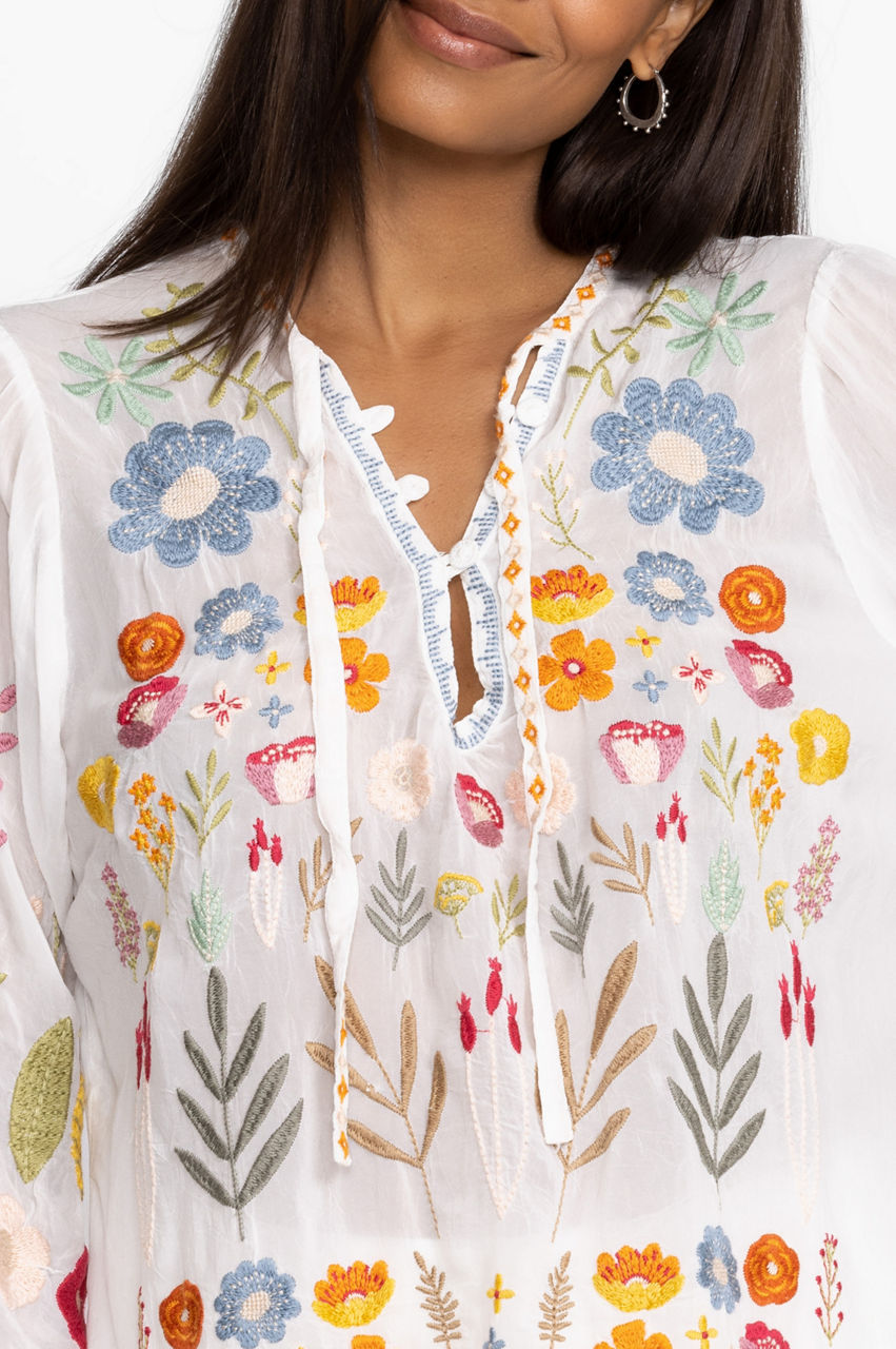 Quaint countryside villages and floral fields form the perfect backdrop for the Mikah Tunic. Enhanced by an insouciant aesthetic and joyful colors, this tunic is crafted from a lightweight fabric and boasts a V-neck, long sleeves, shirring, and an intricate placement embroidery consisting of feminine flowers. Wear with everything from linen pants to skirts and denim.