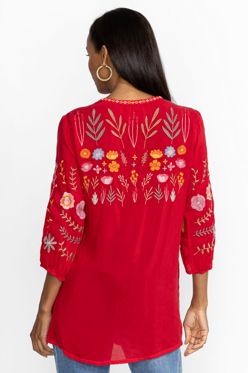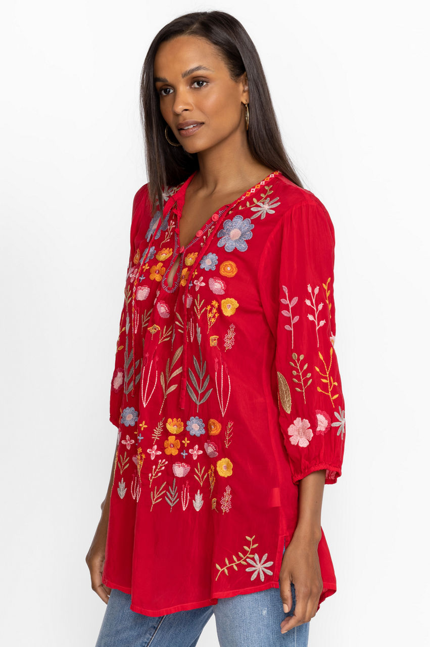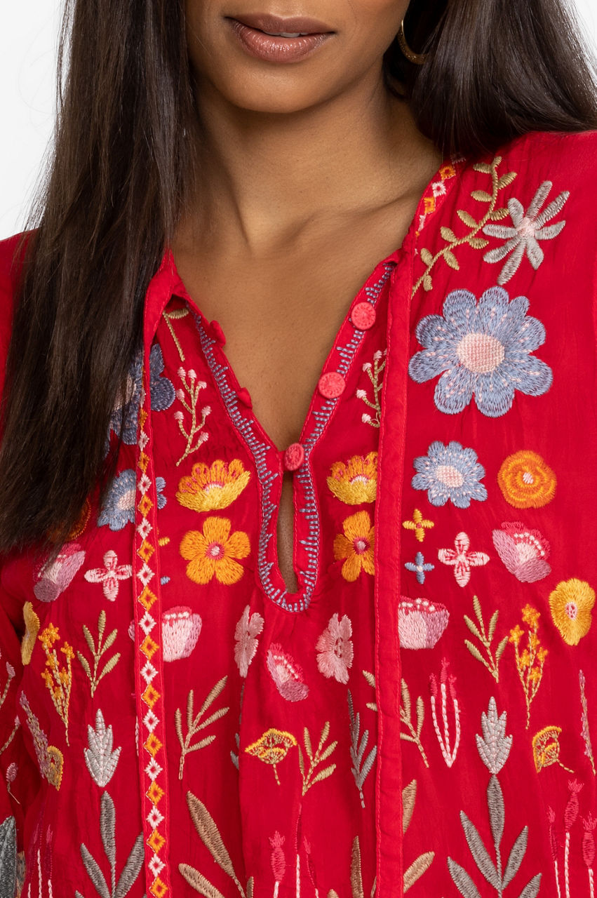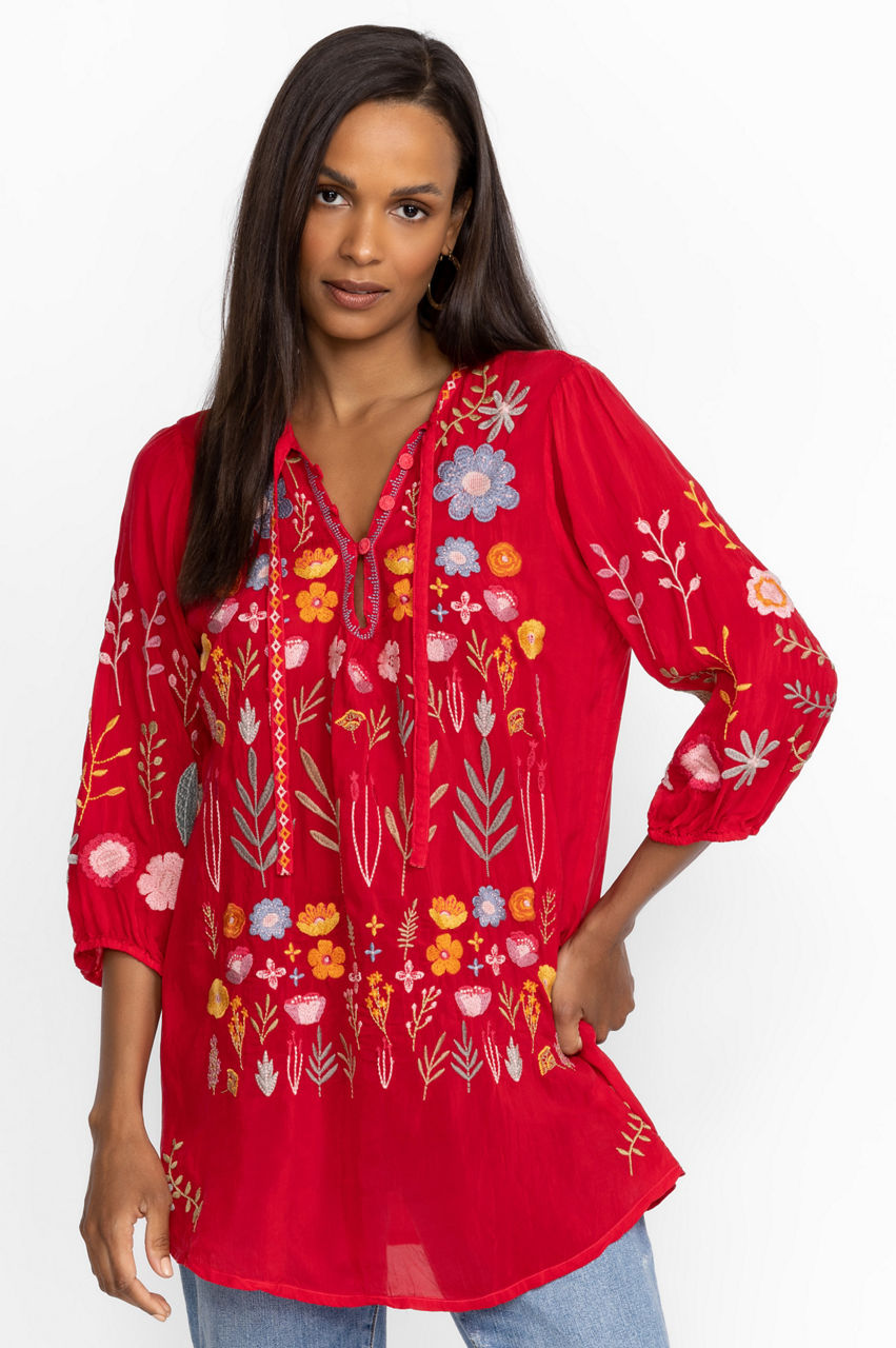 Quaint countryside villages and floral fields form the perfect backdrop for the Mikah Tunic. Enhanced by an insouciant aesthetic and joyful colors, this tunic is crafted from a lightweight fabric and boasts a V-neck, long sleeves, shirring, and an intricate placement embroidery consisting of feminine flowers. Wear with everything from linen pants to skirts and denim.