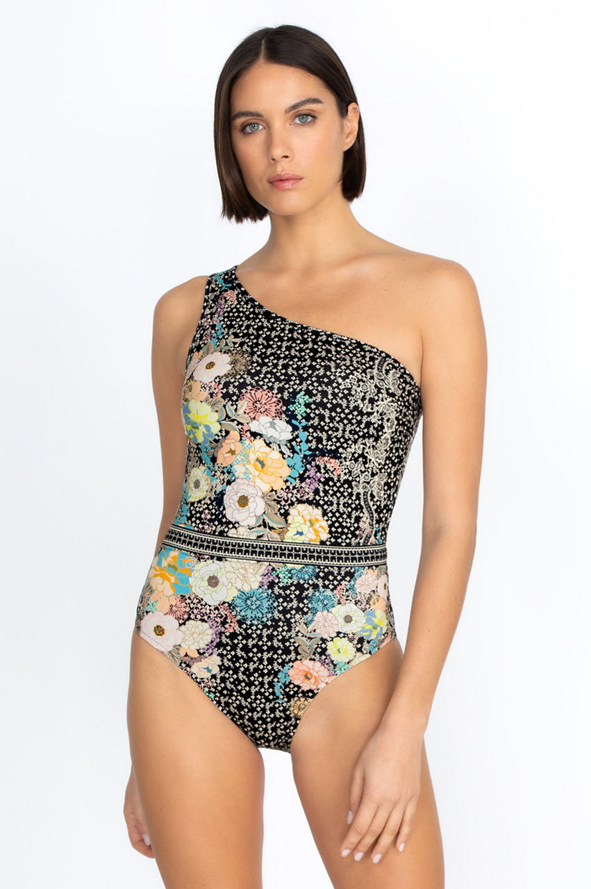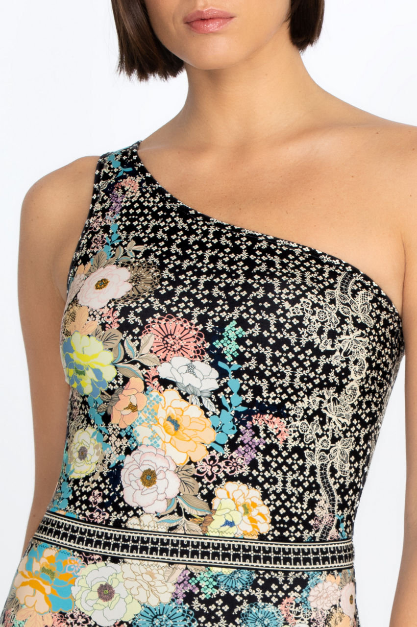 Mesmerizing florals and tropical hues work harmoniously together on the One Shoulder Swimsuit. A fashion-forward style for poolside lounging and beach breaks, this one-piece swimsuit is fabricated from a stretchy quick-drying fabric and boasts a one shoulder neckline, removable cups, and full coverage at the back. Team with a pair of sunglasses and sandals for a glamorous vacation ensemble.