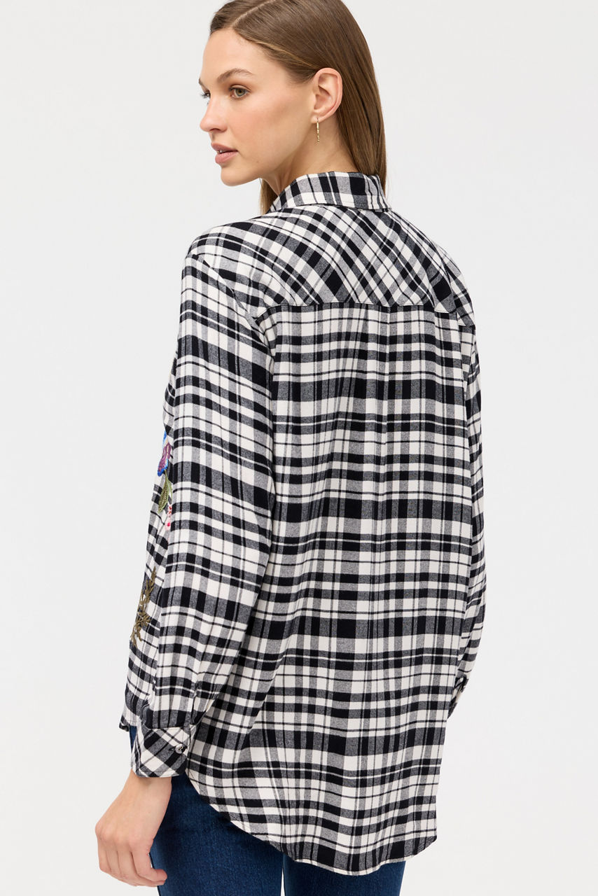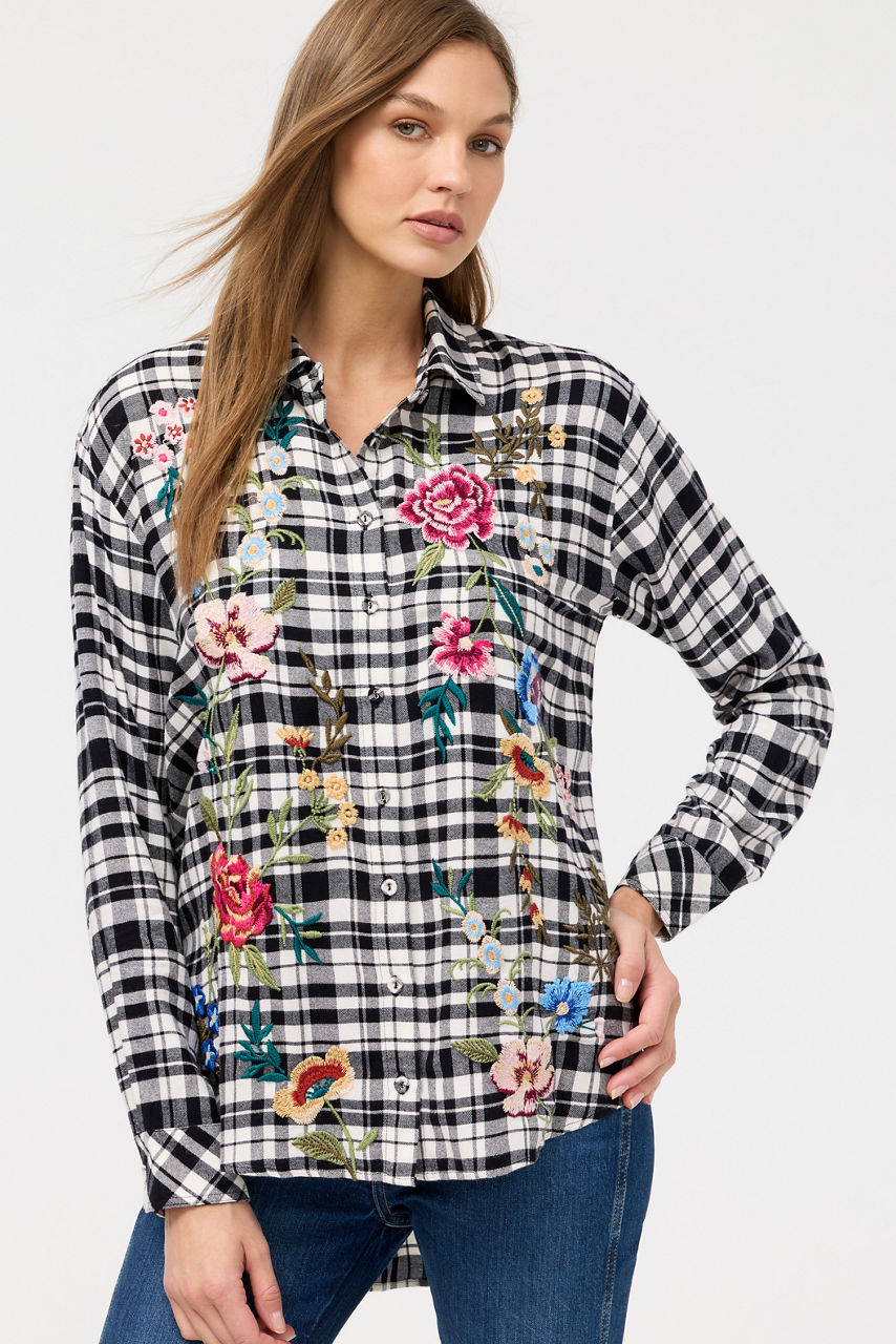 The Mila Oversized Shirt adds a touch of whimsy to a classic plaid staple. Designed with a traditional collared button-front, this retro-inspired shirt is embellished with vibrant floral embroidery at the front and back for a bold splash of color. Pair with black denim and a colorful tank for a polished weekend look.