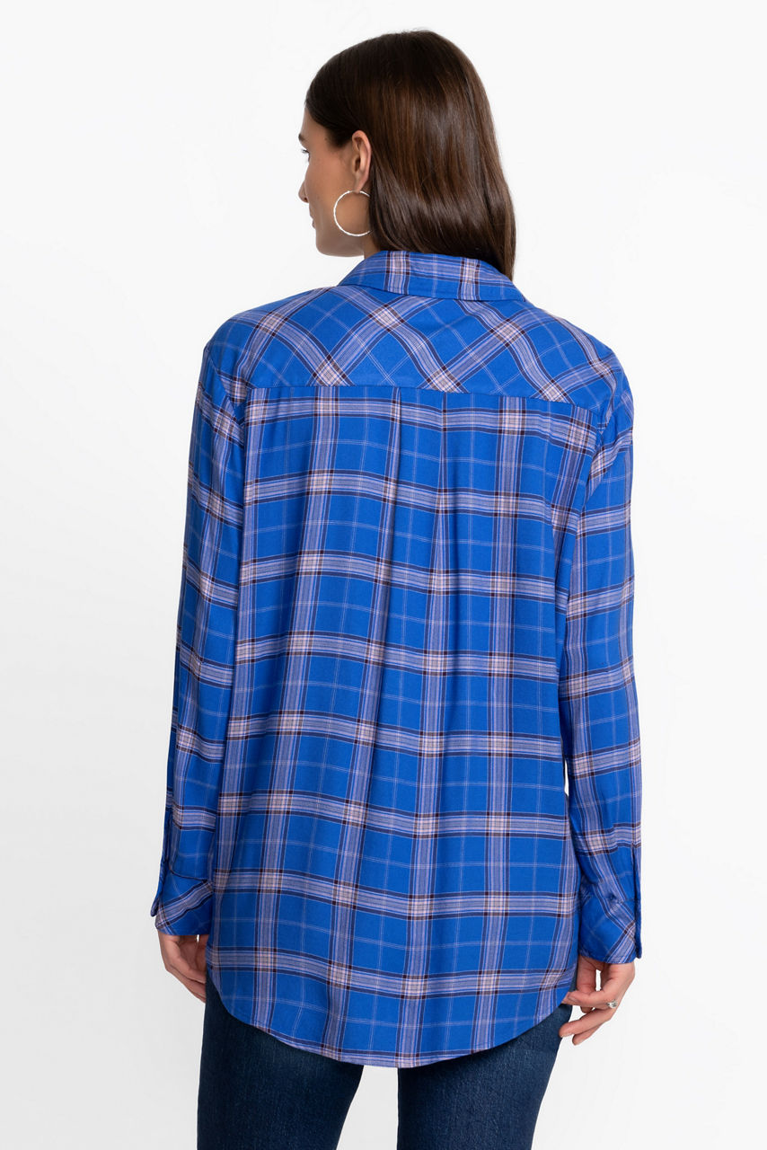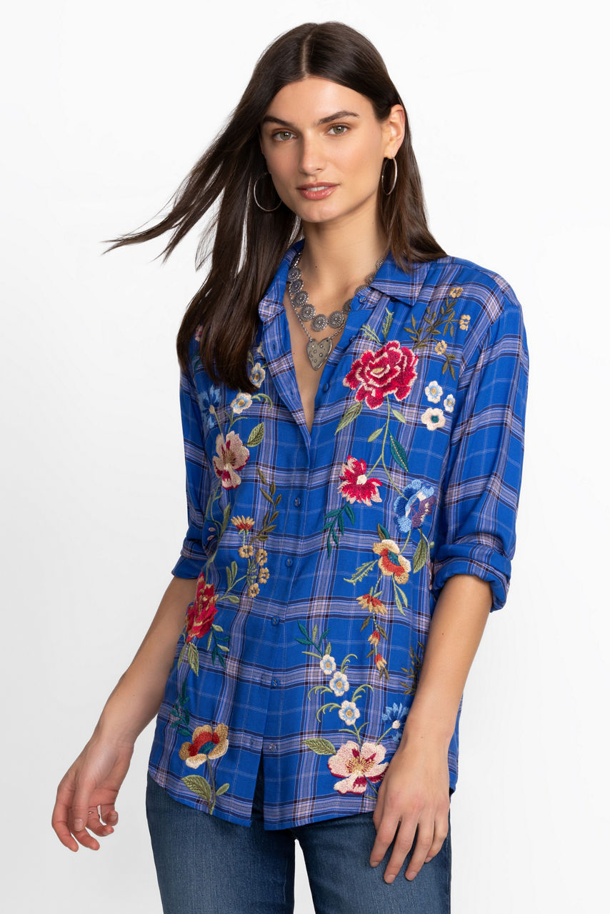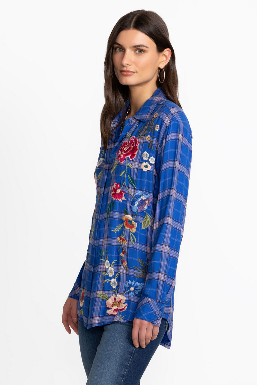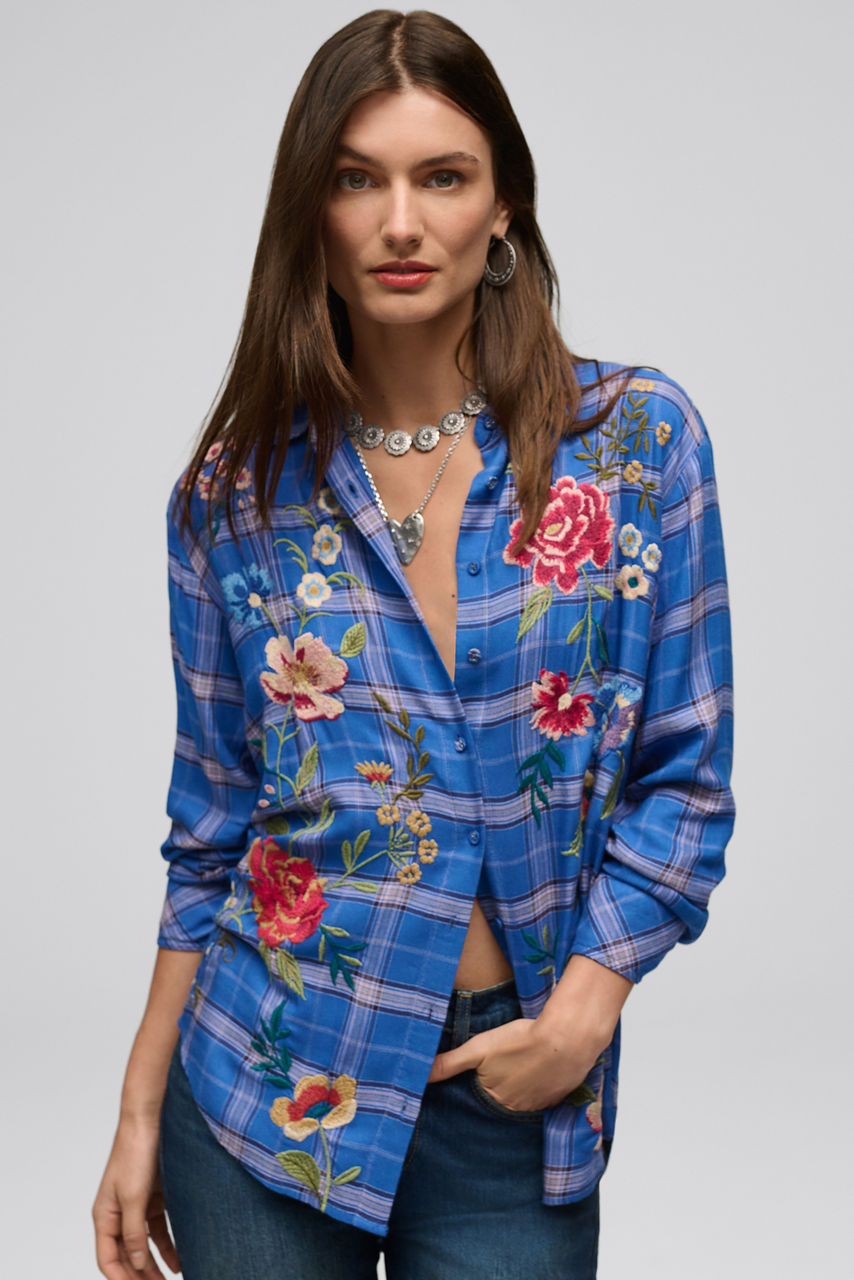 Adding a hint of femininity to a classic style, the Mila Oversized Shirt is designed in a classic western style. Featuring a traditional collared button-down silhouette, this brilliant plaid is embellished with intricate floral embroidered detailing and is finished with a curved shirttail hem. Pair with skinny jeans and trendy ankle boots for a fresh weekend look.