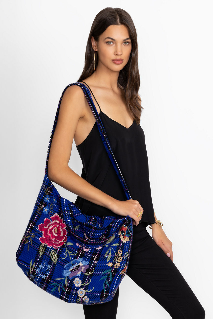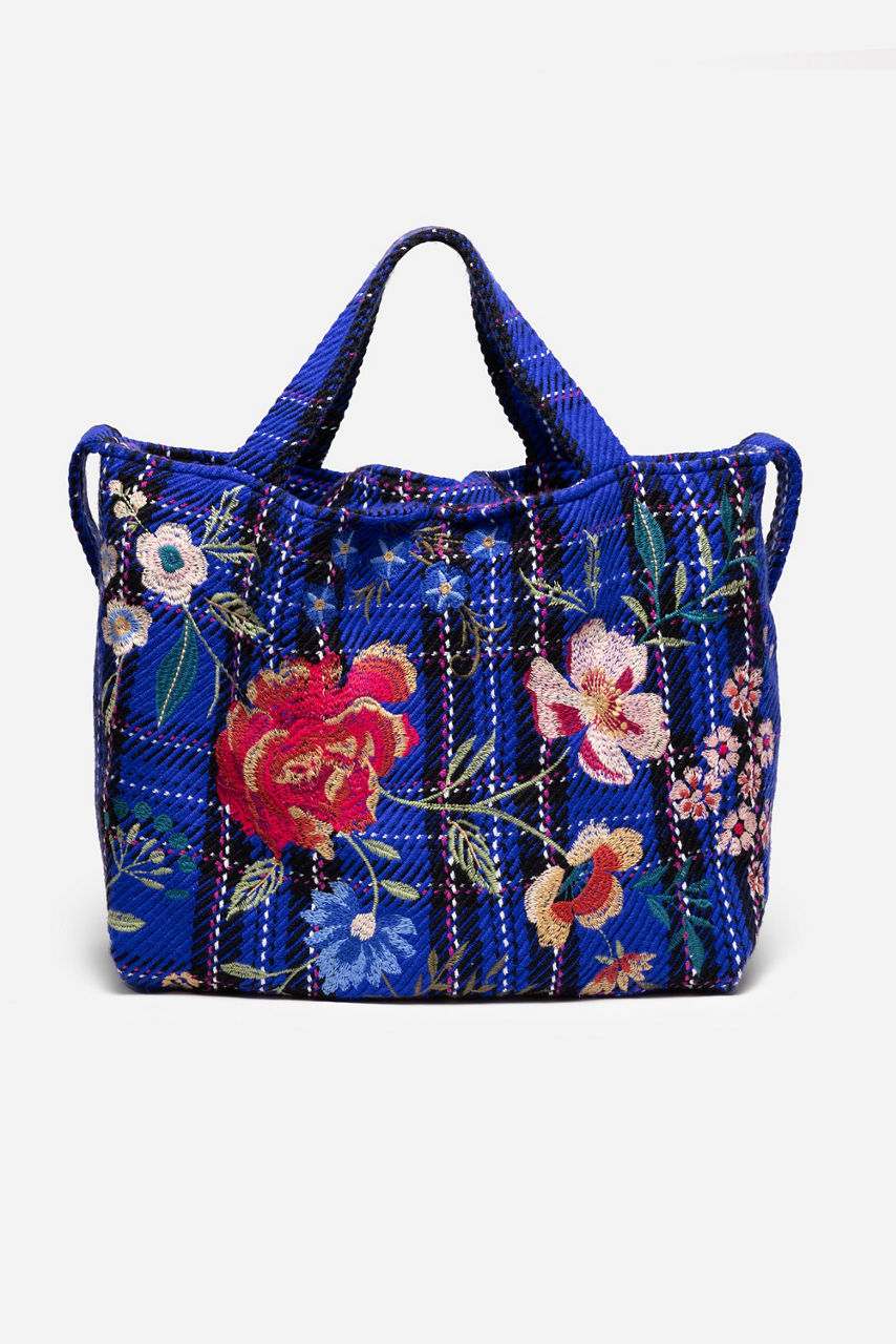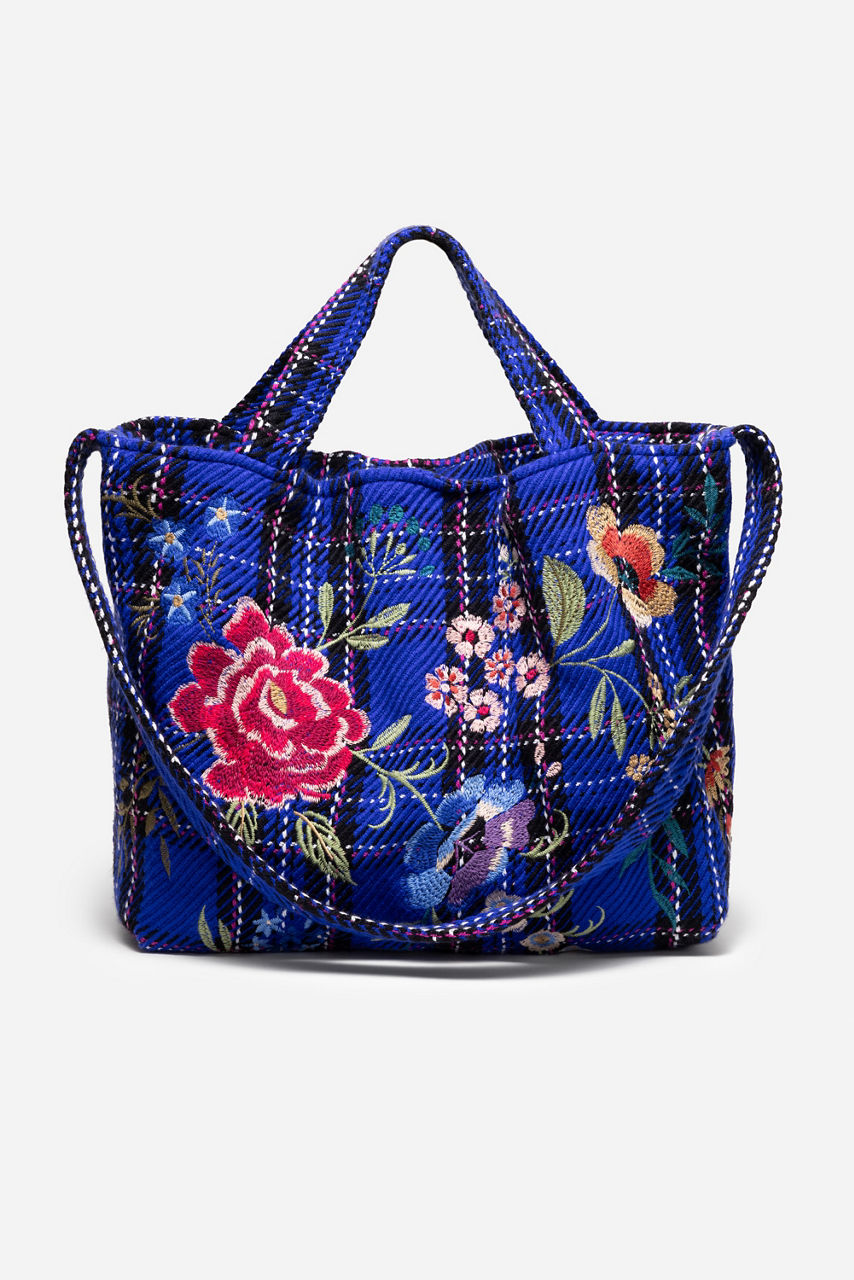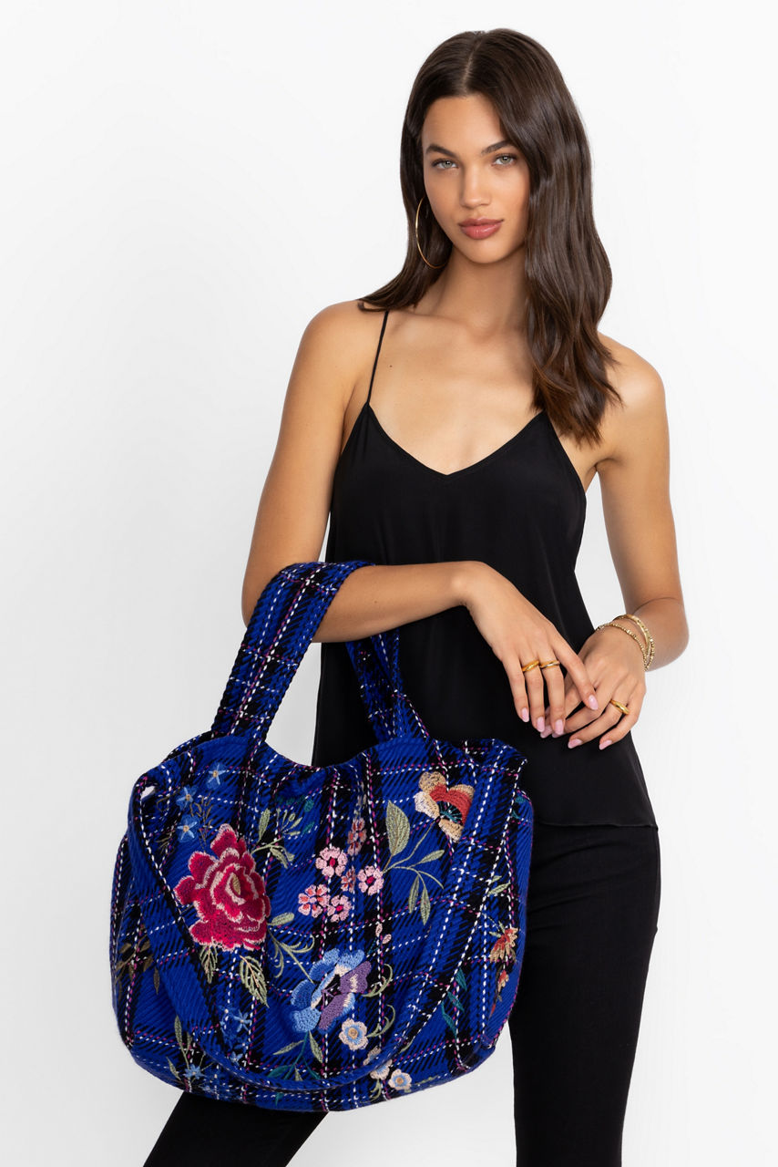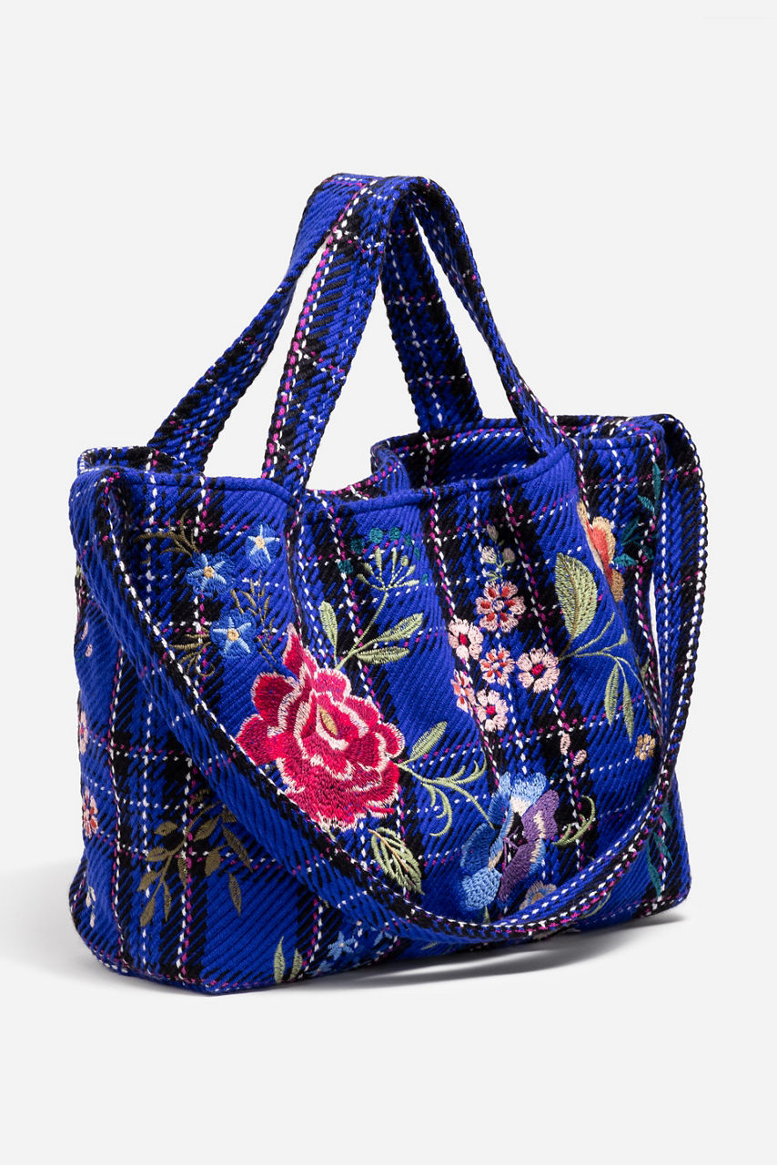 Adorned with a brilliant blue plaid, the Mila Tote Bag is embellished with bold floral embroidered detailing. Featuring both a long shoulder strap and dual top handles, this versatile bag is finished with a magnetic top closure and an interior slip pocket. Carry as your daily tote to pair with casual wardrobe looks.