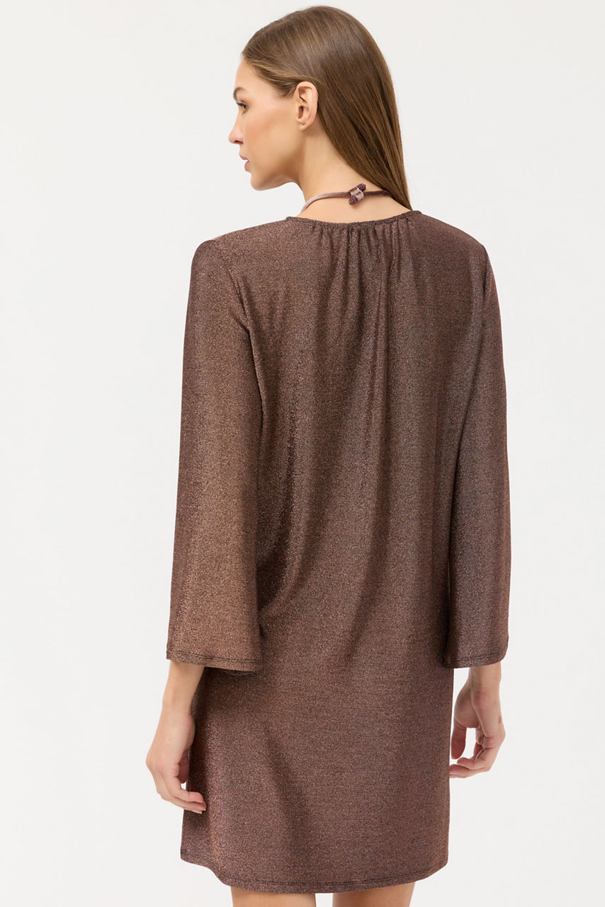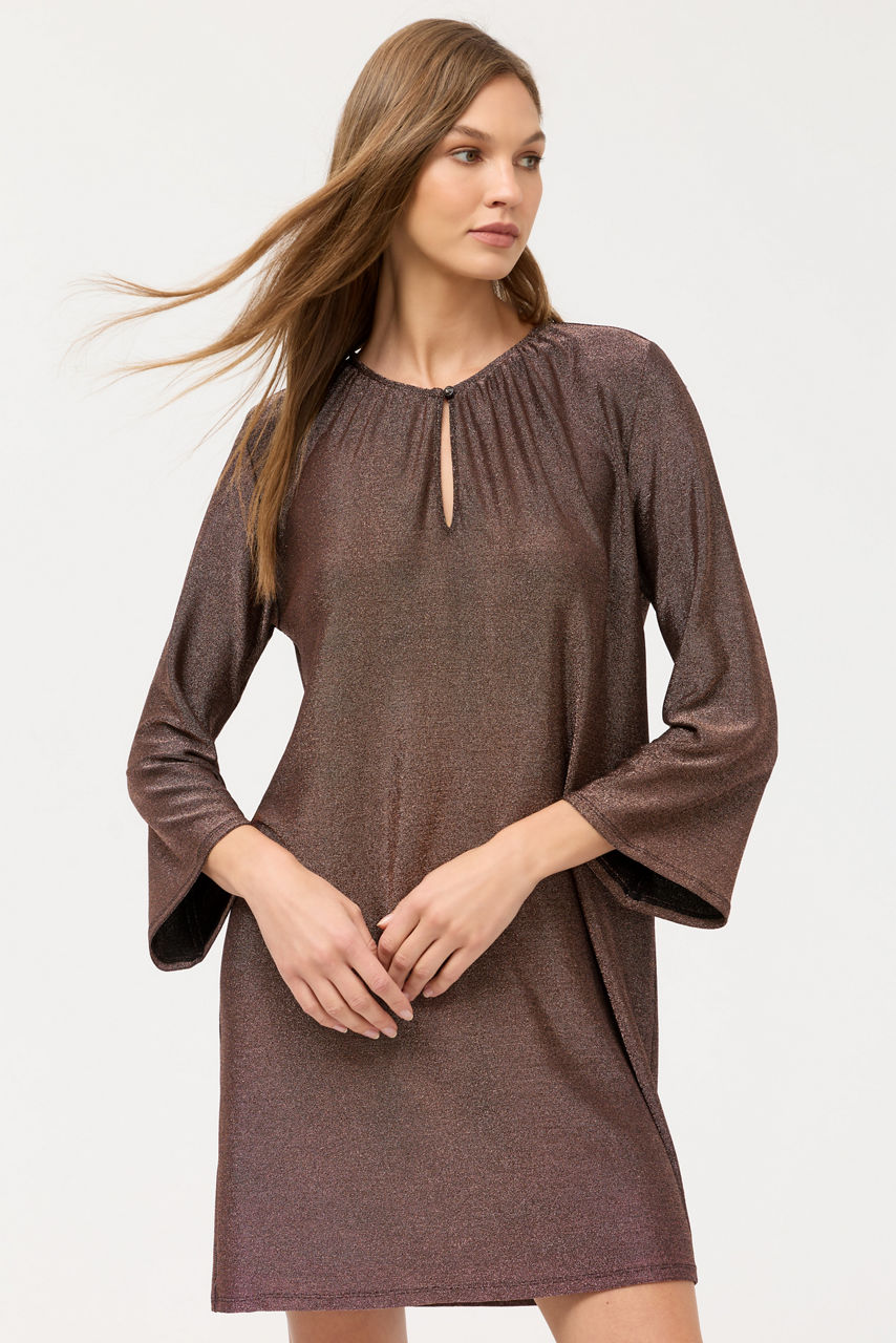 Beautifully enhanced with a sparkling metallic fabric, the Milagros Wide Sleeve Mini Dress offers a relaxed shift silhouette. Designed with a keyhole neckline and long sleeves, this elegant dress is finished with a flowing tiered skirt. Pair with metallic flats and bronze jewelry accents for a polished evening look.