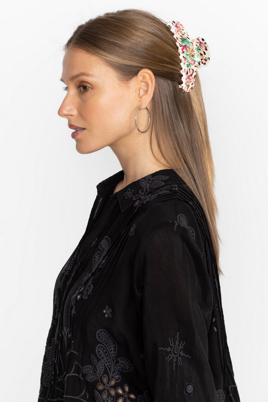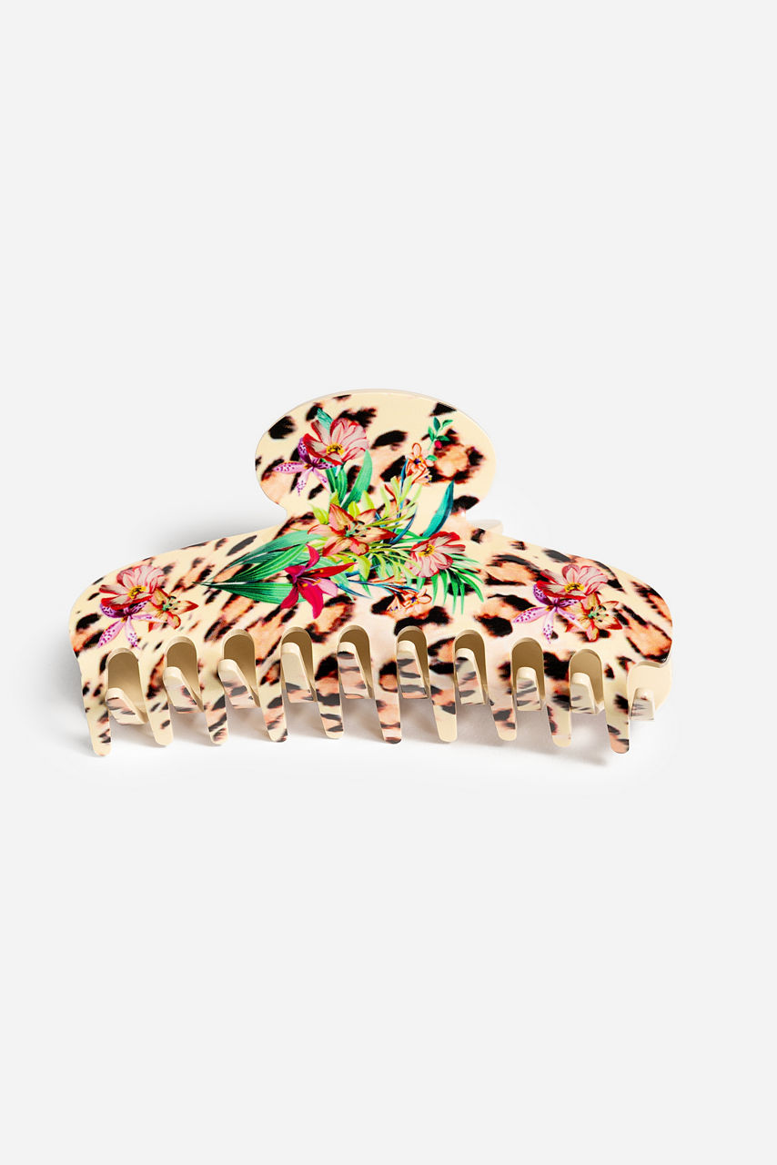 Offering a statement piece that combines sophistication with whimsical charm, the Miller Tigerlilly Hair Clip adds a splash of color to your look. Featuring a beautiful blend of animal print and fresh florals, this sturdy clip is perfect for daily use. Add to your handbag for easy access at a moment's notice.