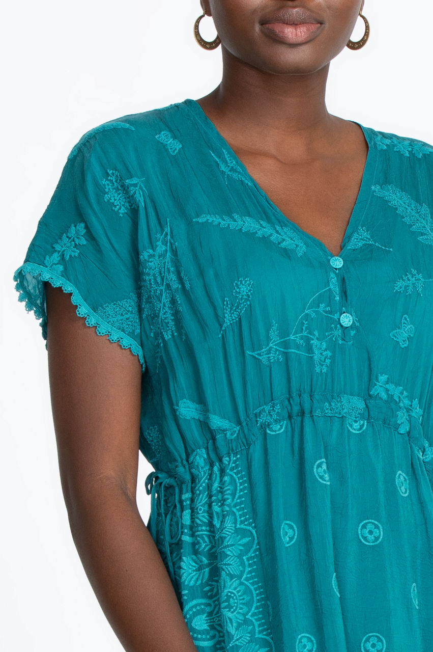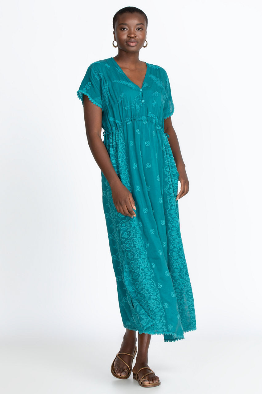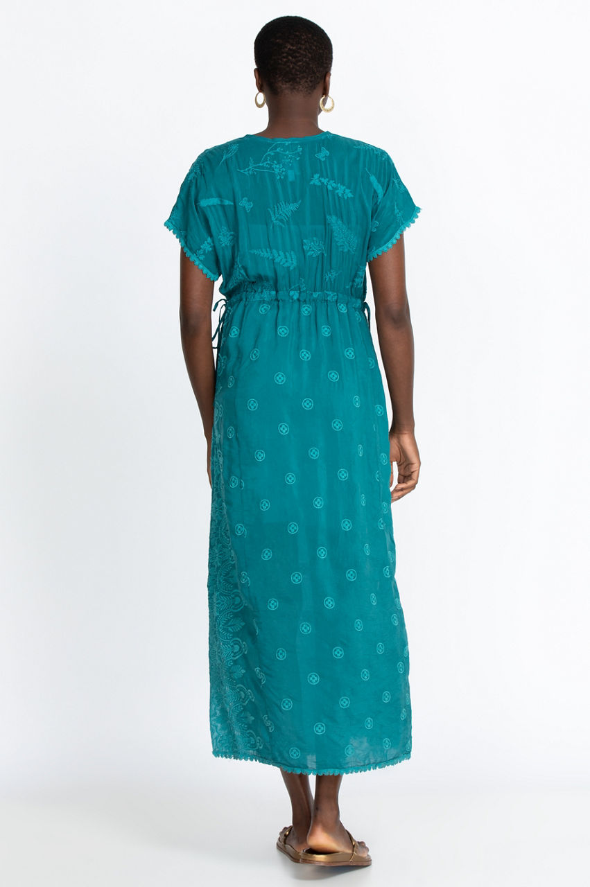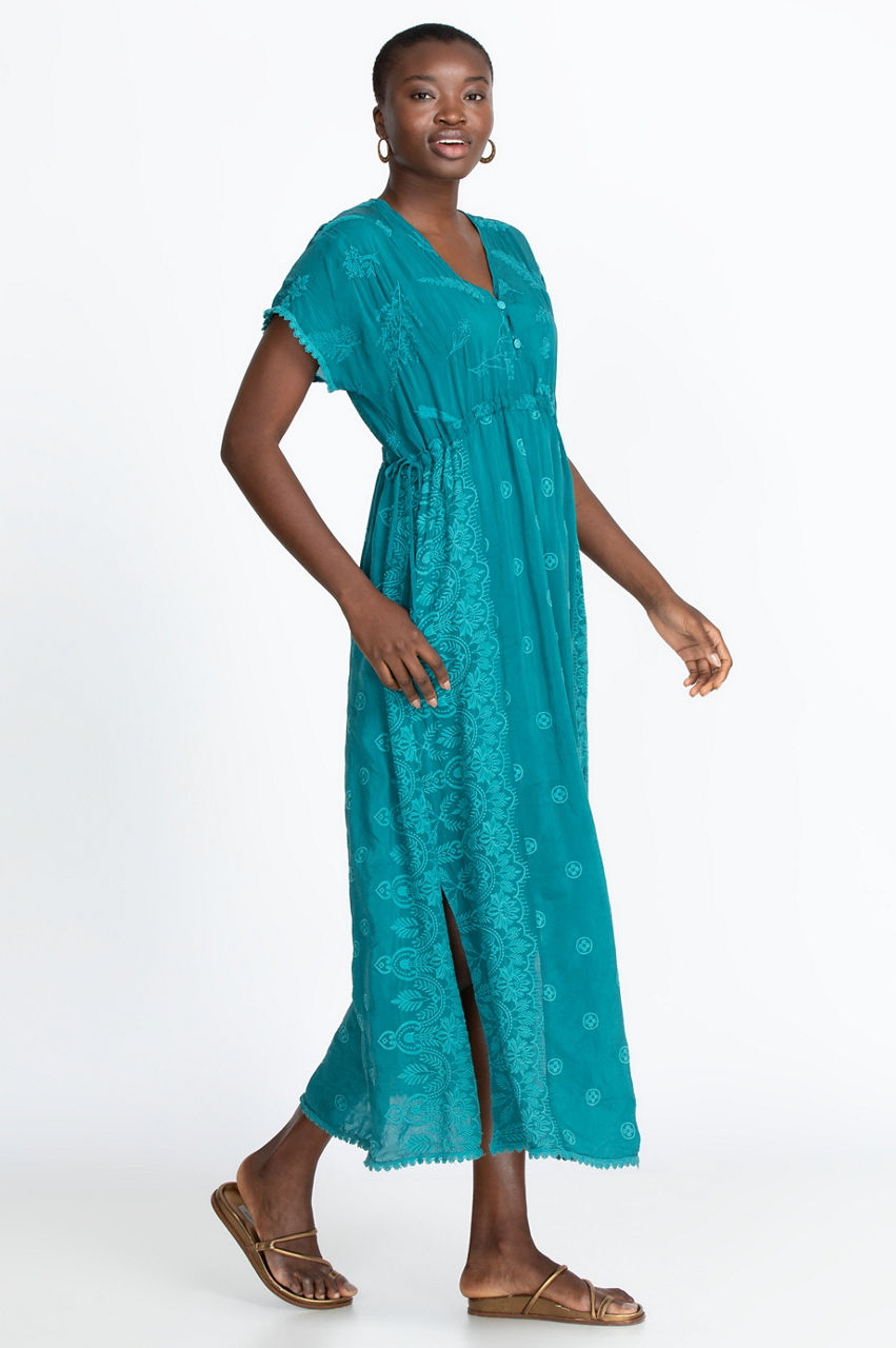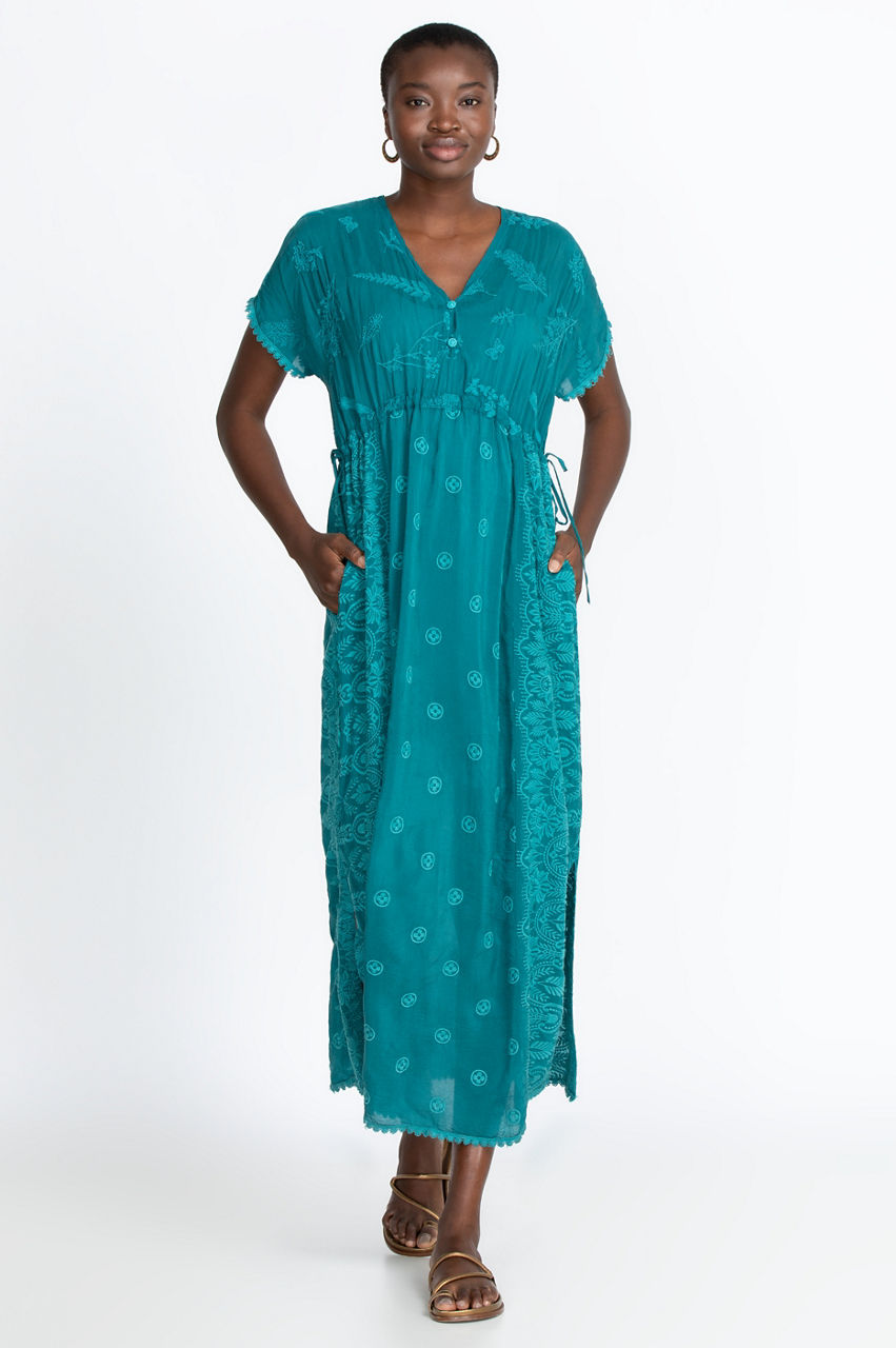 Classy and comfortable, this maxi dress will soon become a staple of your summertime wardrobe. The combination of different prints creates a vertical structure that will elongate your silhouette, while the waist tie detail, embellished cap sleeves, and front buttons result in a stylish and sophisticated piece. Add some cork sandals and layered bangles for a fun boho-chic look!